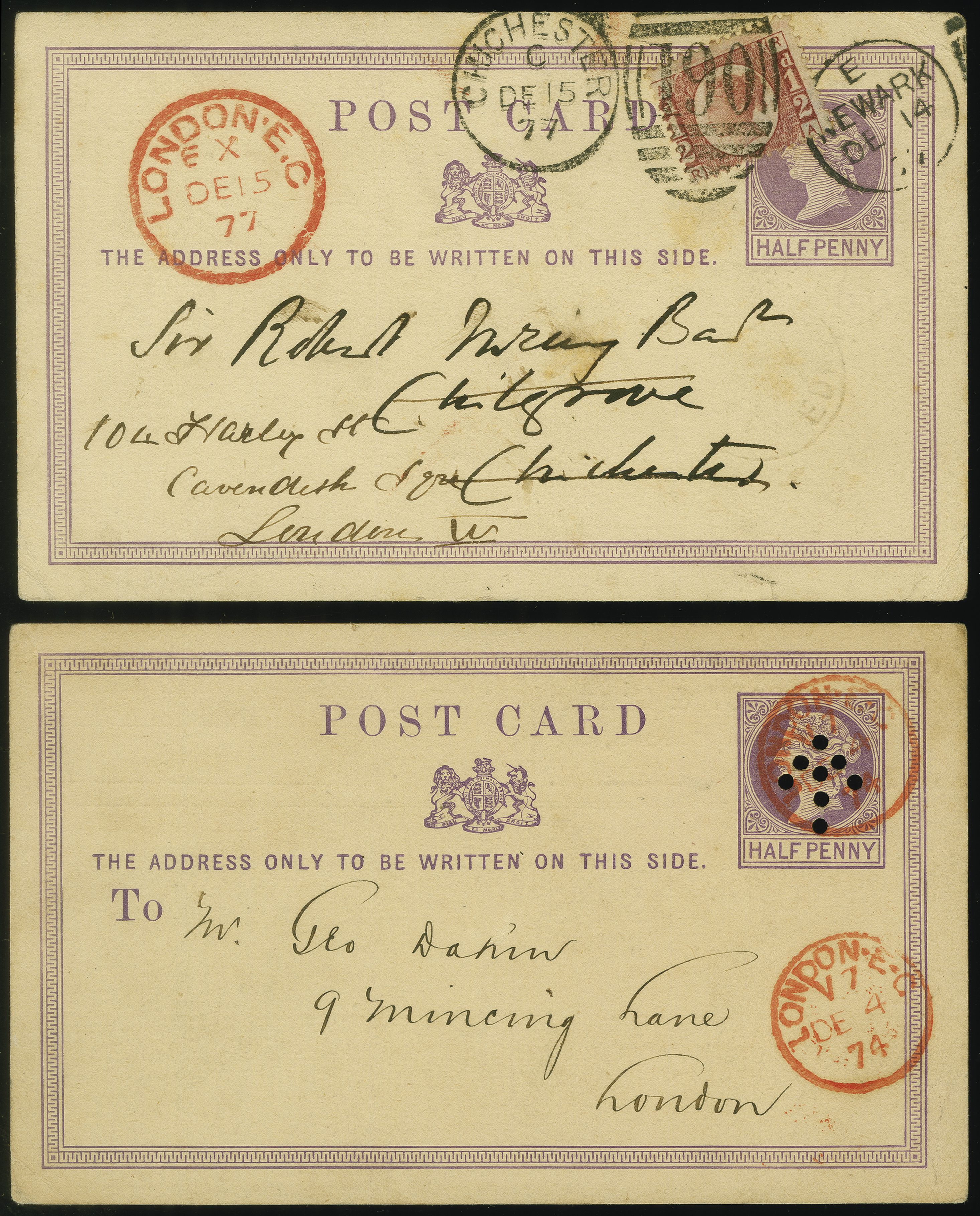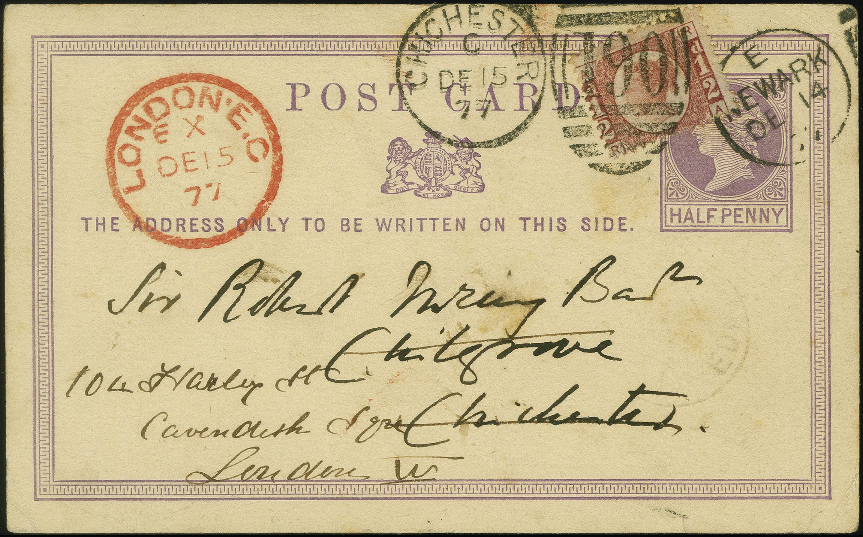 90063 cover image1875: Stationery postal card ½ penny lilac on buff, uprated with 1870, ½ penny rose-red, good colour and perforations, the card used with cds “NEWARK DE 14 77” and the adhesive tied by duplex “190 CHICHESTER DE 15 77”, being sent to Chester and redirected to London with arrival cds in red “LONDON E.C. DEC 5 77”. Reverse, a partial transit cds “EDWINS TOWNE DE 1* 77”. Two small corner bends and tiny tear at base. Fine and scarce early example of a forwarded item not free. Additionally, comes with an example of the same card with the SLOPER arrow trial cancel attractively used with red cds in 1875. Reference: The Postal History of the Universal Postal Union: The Postal Card, Worldwide 1869-1975, Volume 1, illustrated pg. 268 (Image 1) (Image 2)