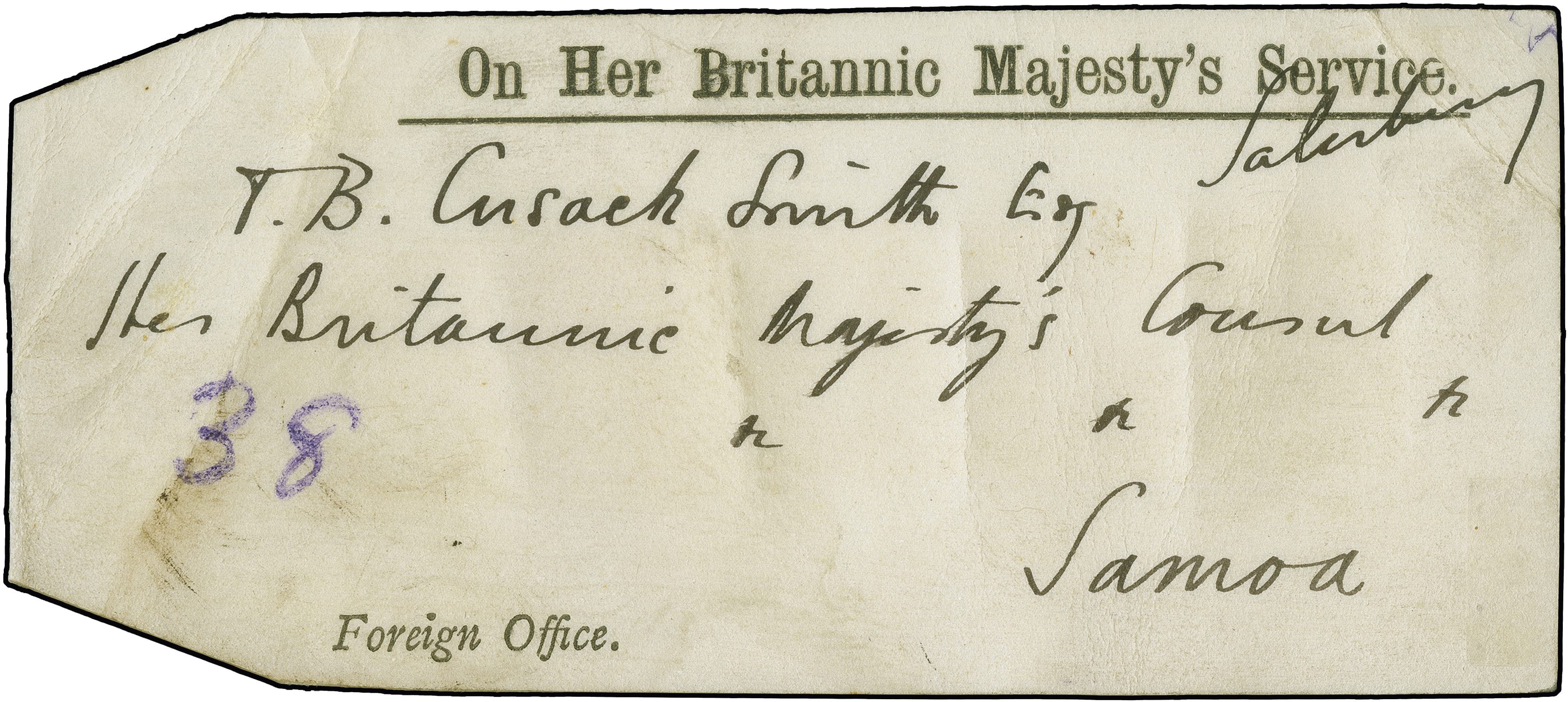 90057 piece imageParcel Post 1887: Official 2 pence green & carmine, 6 pence purple on rose-red and 1 shilling dull green, three singles, of fresh colour and perforations tied by large boxed “PARCEL POST LONDON CHIEF OFFICE E.C” with manuscript “3/8” and undated cds “G.P.O. DEPOT” to the reverse of an “On Her Britannic Majesty's Service” parcel tag, to Samoa, addressed to the Consul. Sent by the Prime Minister Lord Salisbury, signed front top right. Creasing to tag and soiling. Stamps well-preserved for use. Rare franking. Provenance: Spink, 24 May 2002, lot 1121 (Image 1) (Image 2)