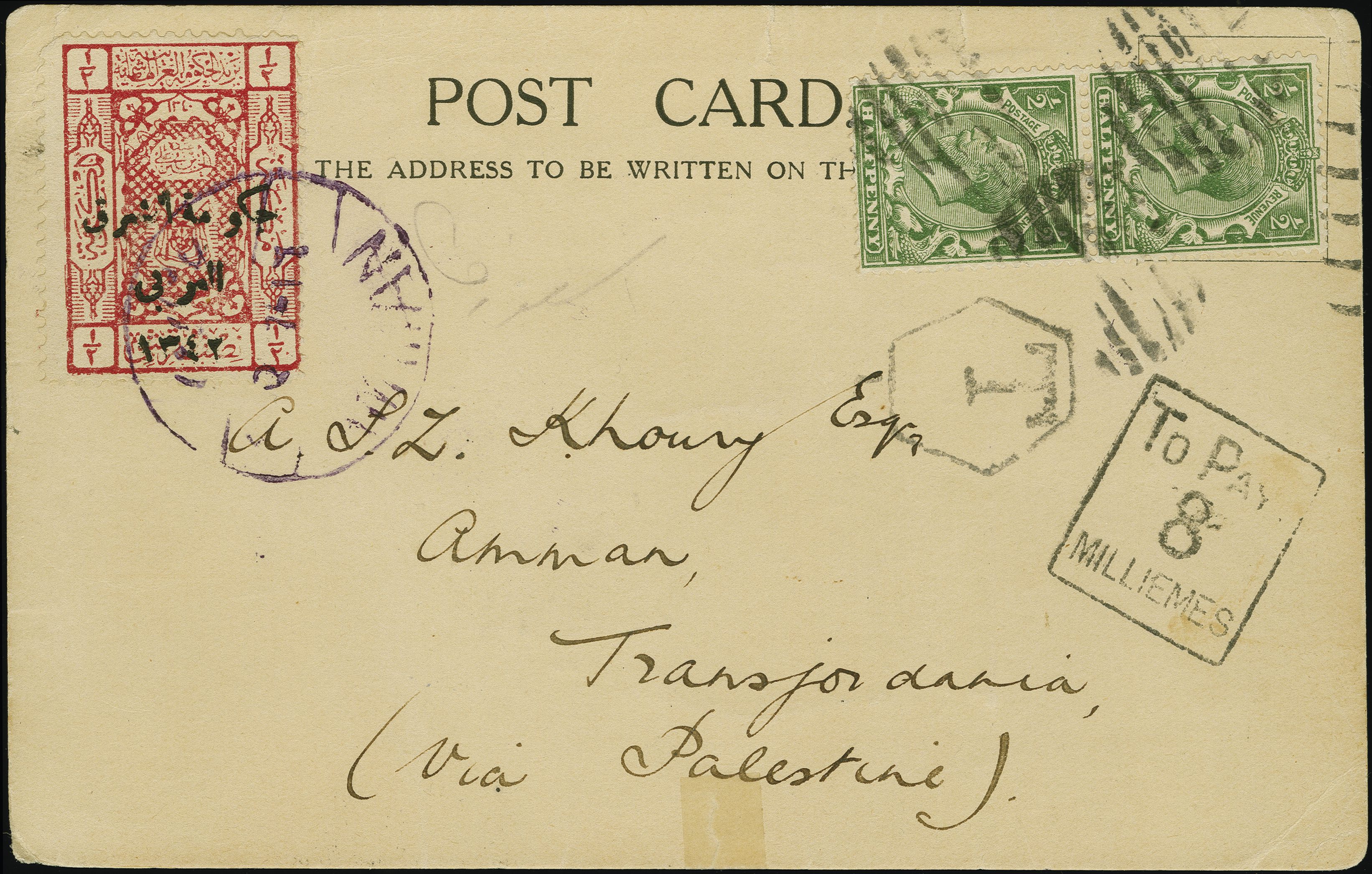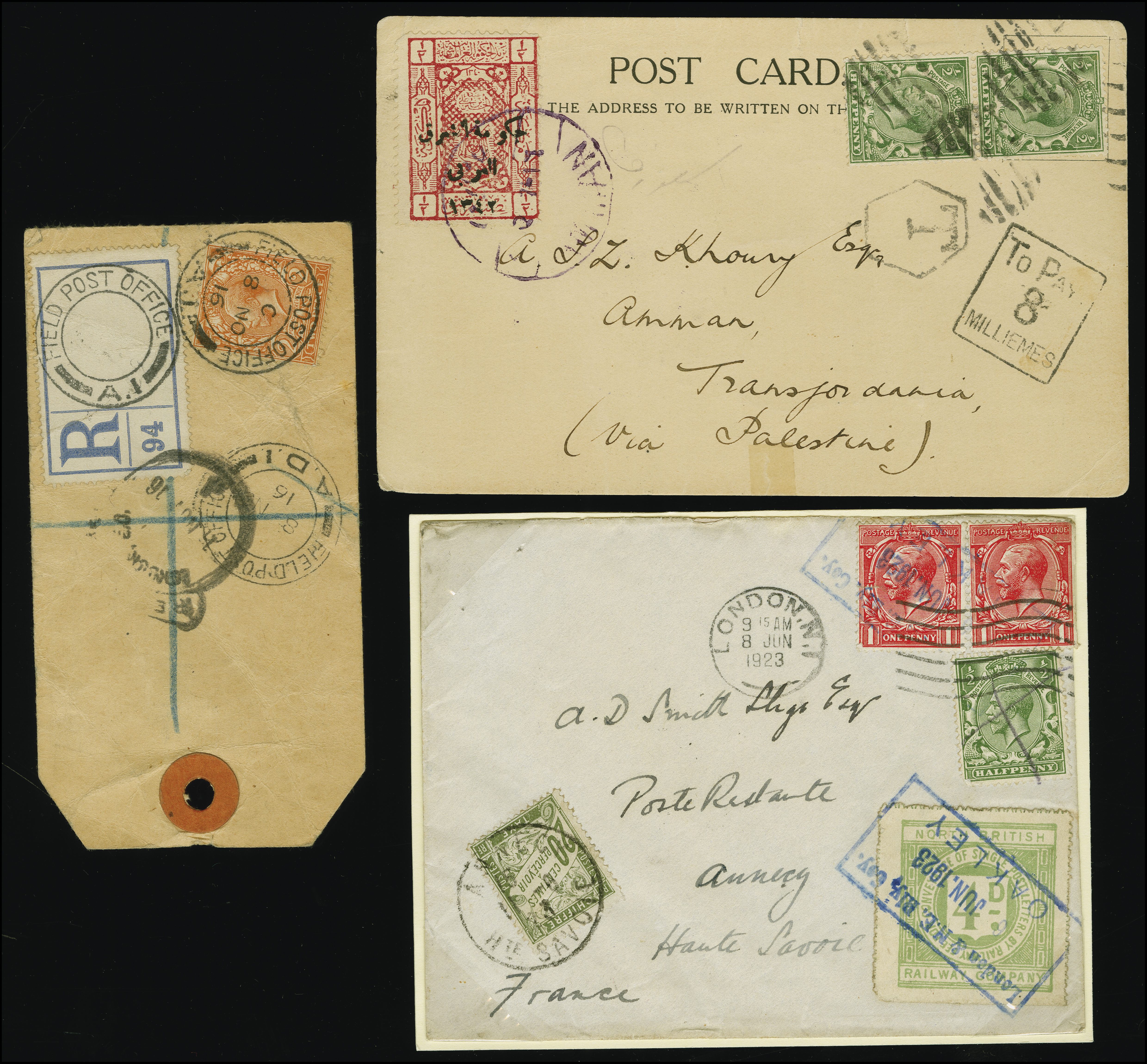 90053 cover image1913: George V, ½ penny green, vertical pair, in combination with Transjordan 1923, ½ piaster scarlet overprint Hejaz Saudi in Arabic “Arab Government of the East”, the former tied by oval grid in black and the latter a violet “AMMAN” cds in Arabic dated 17 February 1925, to a postcard sent to Amman, endorsed “Via Palestine”, with “T” mark alongside framed “TO PAY 8 MILLIEMES”. Reverse, additional partial strike of the Amman cds in violet. Small tears top and at base. Rare combination. Comes with a 1923 envelope franked with GV ½ d. and 1 d. (2) in combination with North British Railway Company 4 d. green (Railway Oakley cancel in blue) sent to France, with French postage due 20 c. as ‘Poste restante’ fee. Also, a parcel tag sent from Army PO (A.D.1) to Army, Navy Stores, London during 1916 franked with GV 2 d. Scarce group (Image 1) (Image 2)