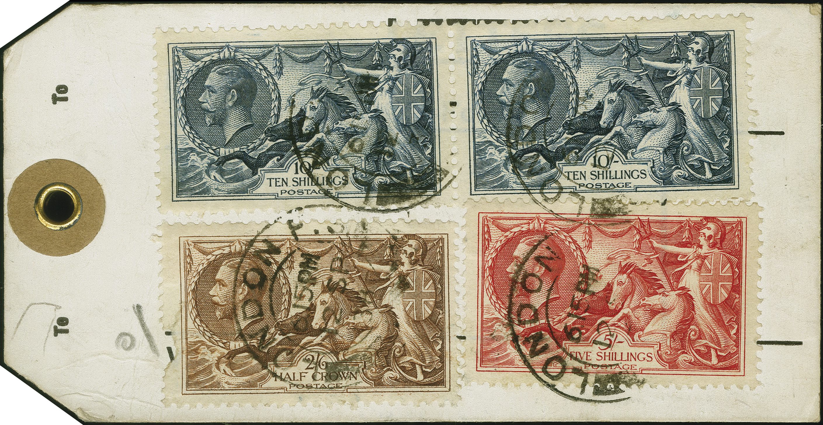 90056 cover image1934: Waterlow re-engraved, Seahorse 2 shilling 6 pence chocolate brown, 5 shilling bright rose-red and 10 shilling indigo horizontal pair, fresh colour perforations mainly fine, tied by cds “LONDON 12 SP 38” to a luggage parcel tag sent to France. 2s 6d has fault left side. High-value rate £1.7.6d. Scarce (Image 1) (Image 2)