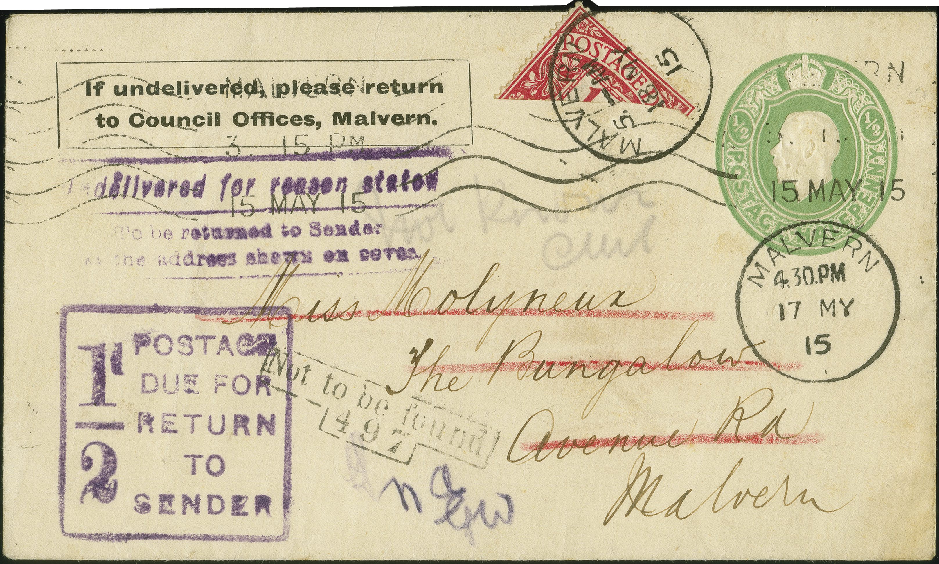 90058 cover image1915: Malvern Council printed stationery envelope, ½ penny green, with 1914, postage due 1 penny carmine, bisect, fresh colour and good perforations, tied by black cds “MALVERN 17 MY 1915” sent locally, with manuscript “Not known” alongside instructional in violet “Undelivered for reason stated. To be returned to sender at the address shown on cover.”, as well as a framed “Not to be found / 497” and boxed “½d POSTAGE DUE FOR RETURN TO SENDER”. Fine. Scarce postage due bisect (Image 1) (Image 2)
