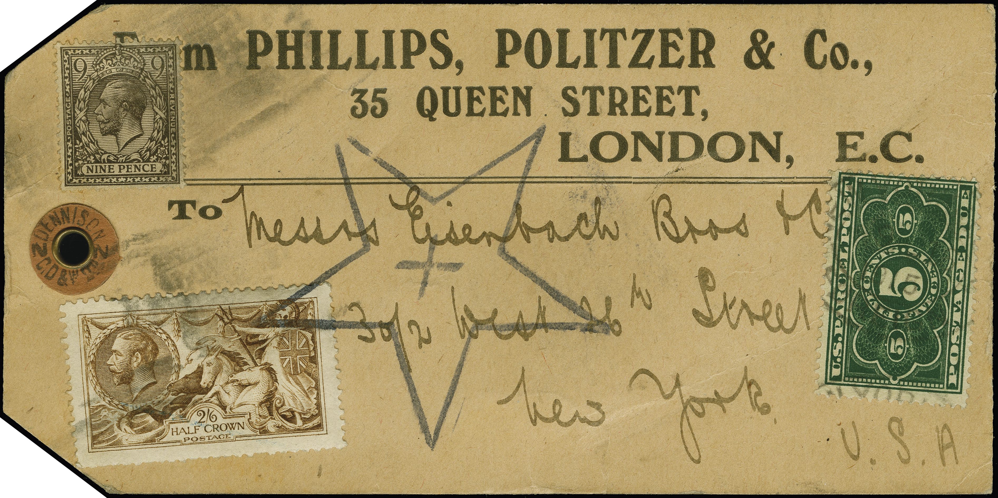 90054 cover image1913: George V, 9 pence agate with Seahorse 1915, 2 shilling 6 pence light brown in combination with USA parcel post postage due 5 cents dark green, good colour, perforations mainly fine, the GB tied by a roller cancel, the Seahorse also tied by star censorship cancel, the US with pre-cancel, to a parcel tag from London, England to New York, USA. Minor imperfections as is usual. Fine and unusual combination. US parcel post postage due genuinely used on parcel matter are scarce. Note: The 5¢ postage due was a handling charge (regardless of weight) permitted by the UPU on individual parcels (Image 1) (Image 2)