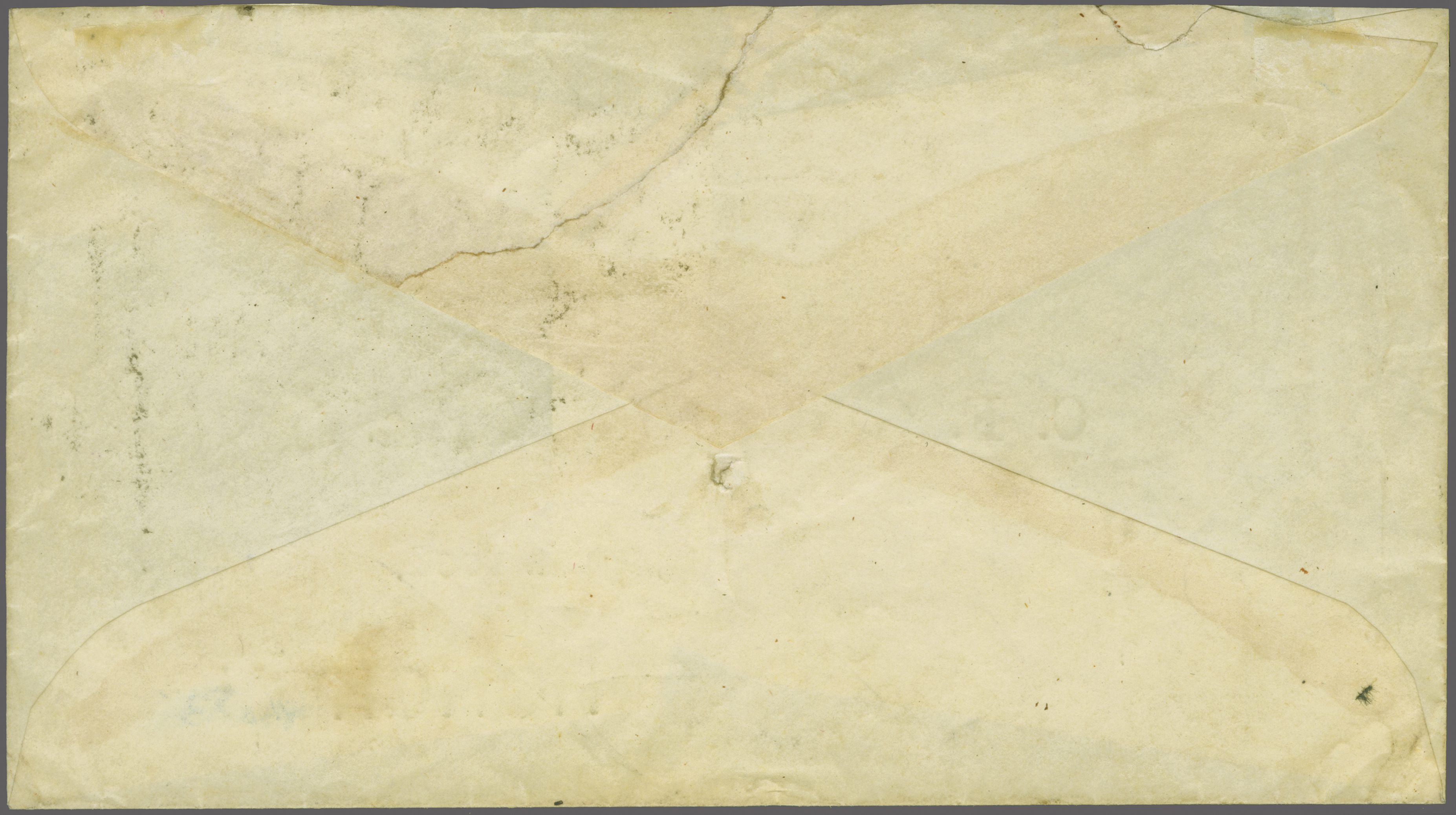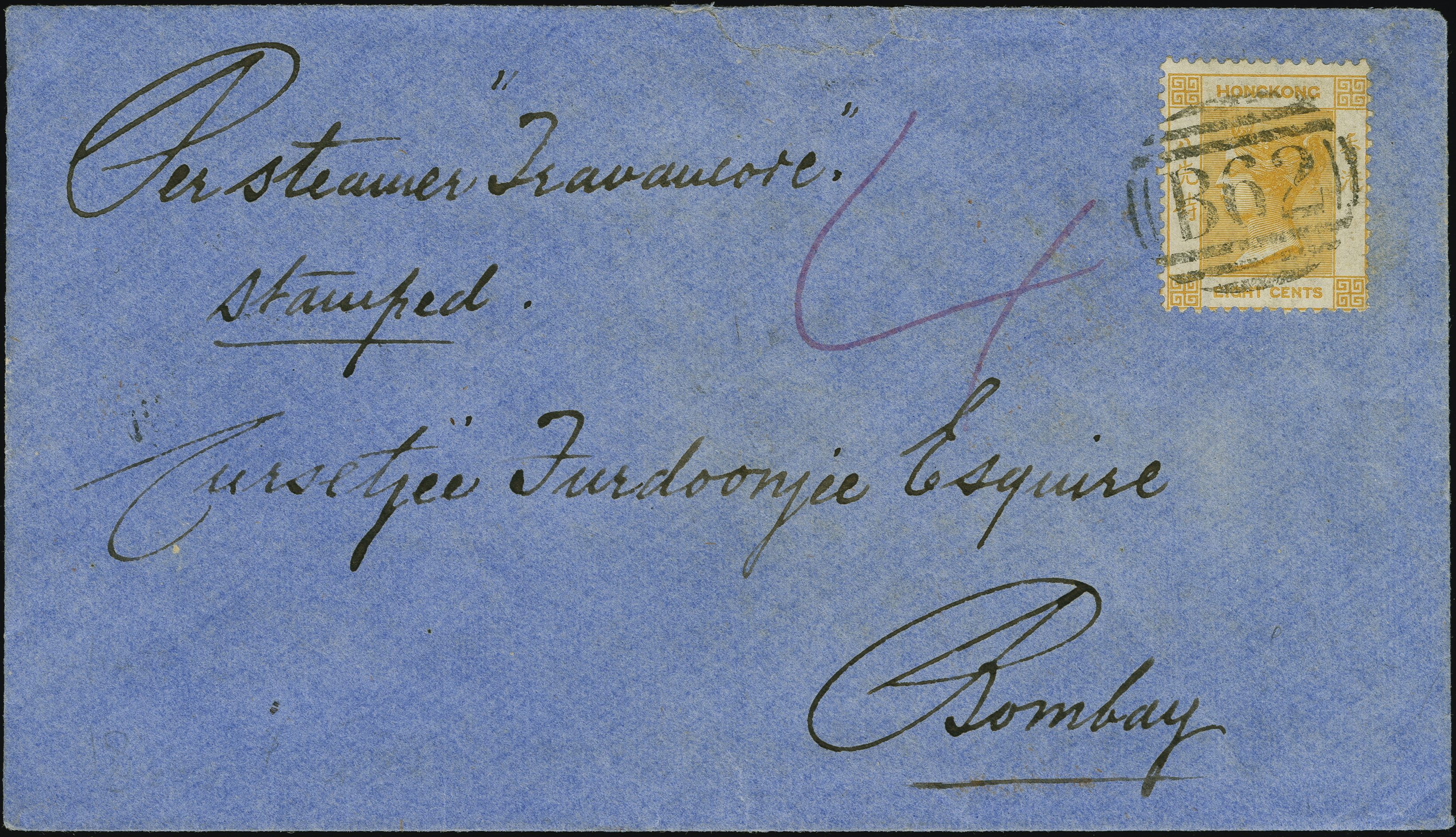 1863/71: 8 cents dull orange, Crown CC wmk., perf. 14, good colour, perforations mostly fine, tied by barred oval “B62” to an envelope sent to Bombay, India, endorsed “Per steamer Travancore” with manuscript “4” in red.