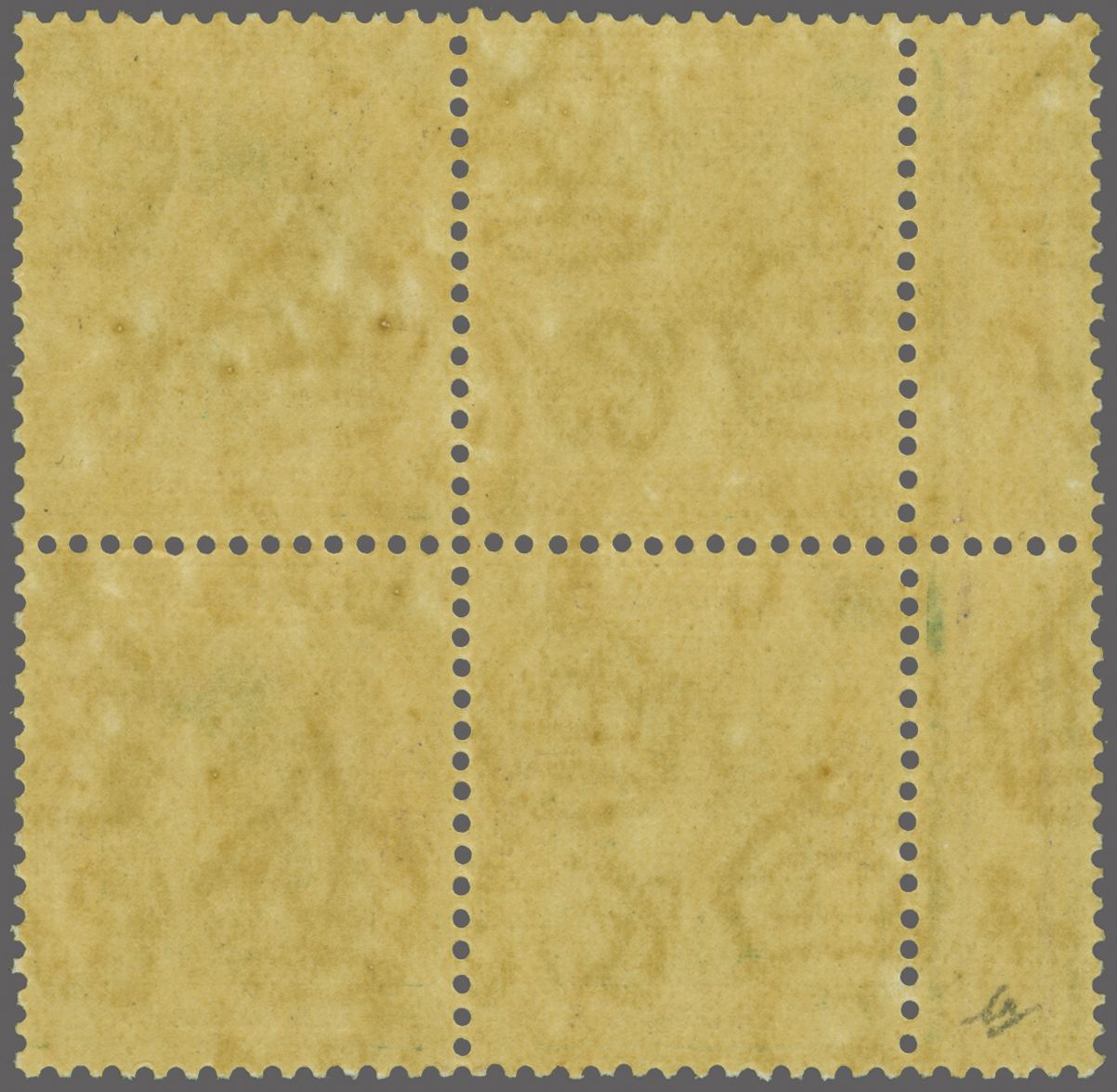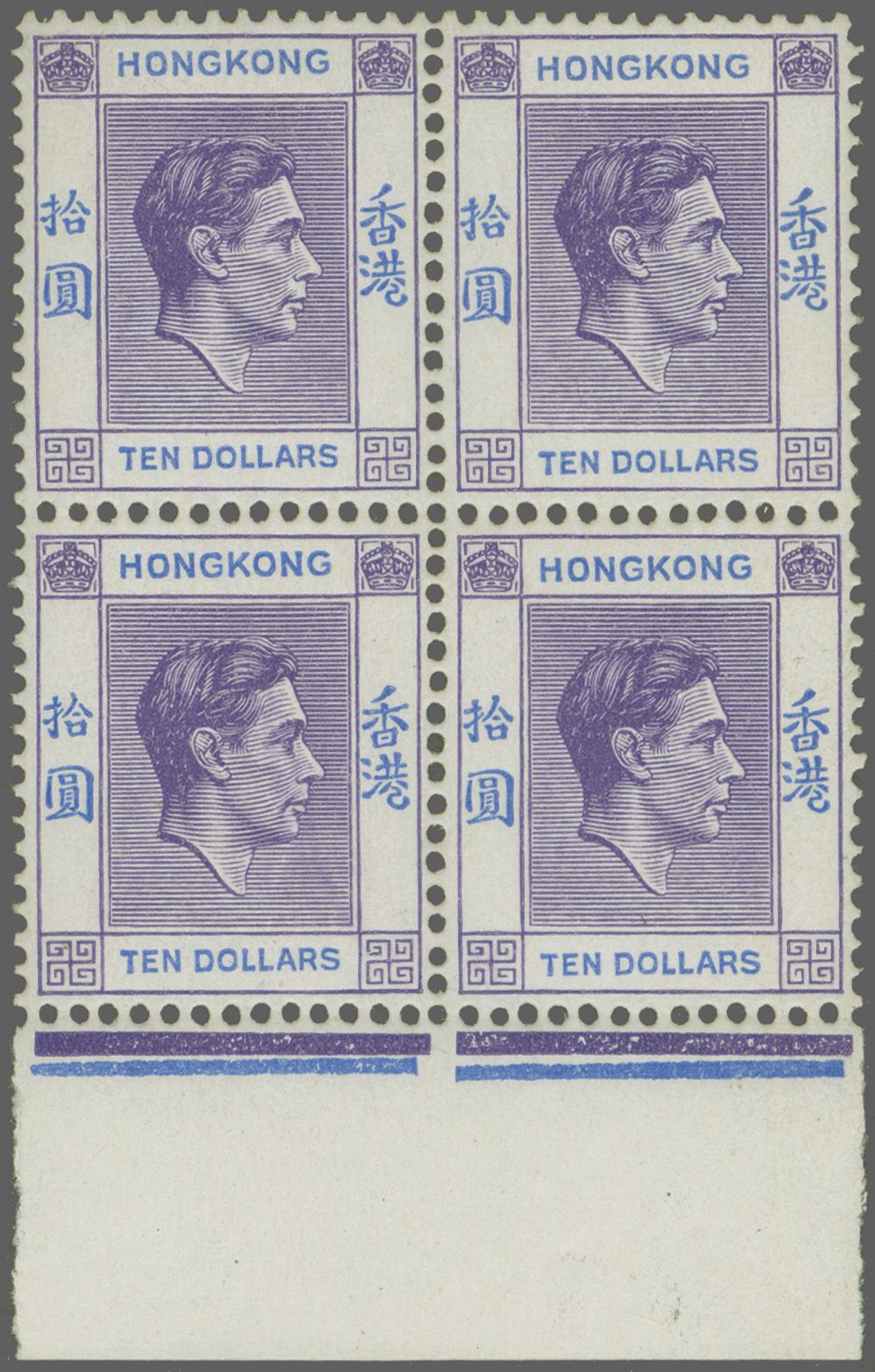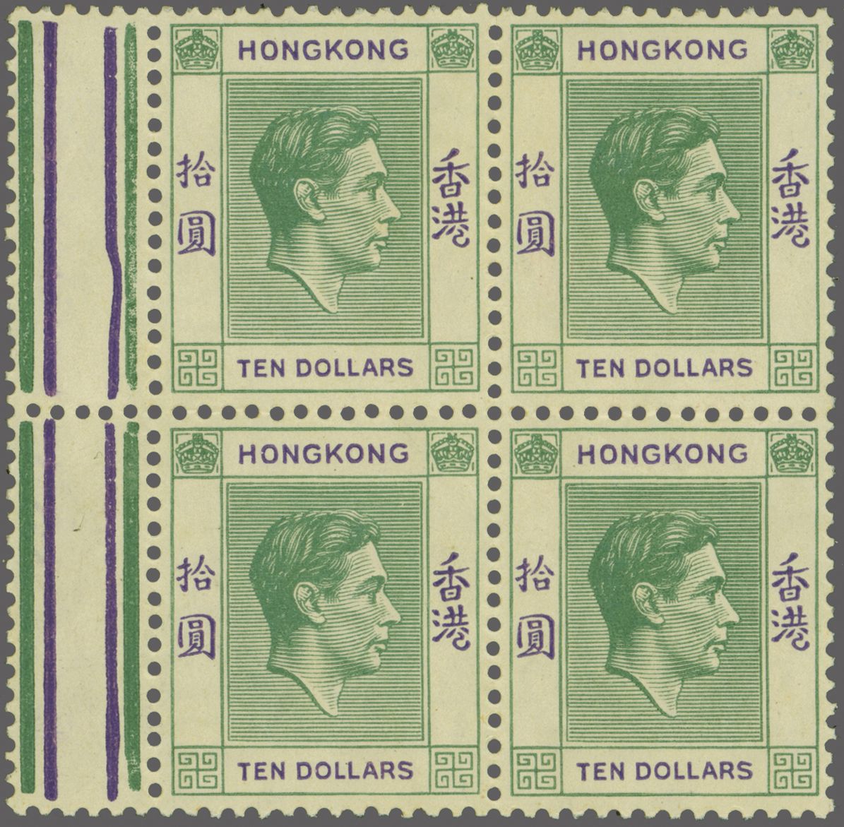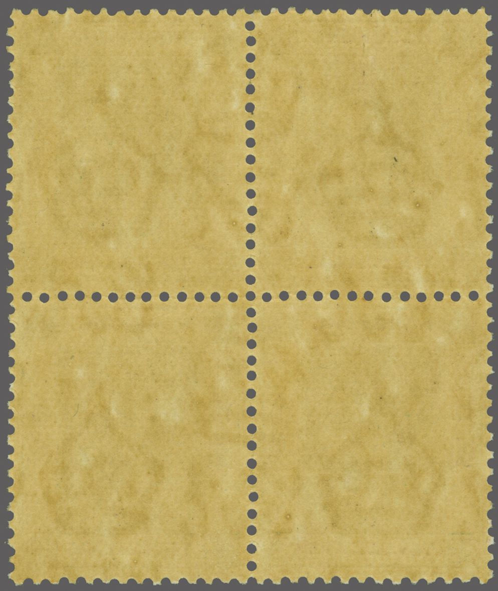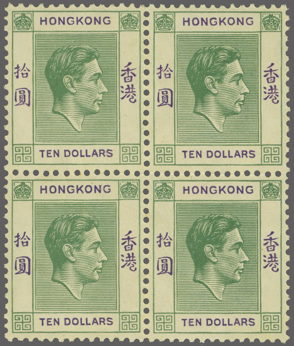 1938 (June 2): $ 10 green & violet, wmk. Multiple Script Crown CA, an unused block of four of fine colour, typically slightly browned unmounted og. A rare and very fine multiple of this key stamp Gi = £ 3'000+ (Image 1)