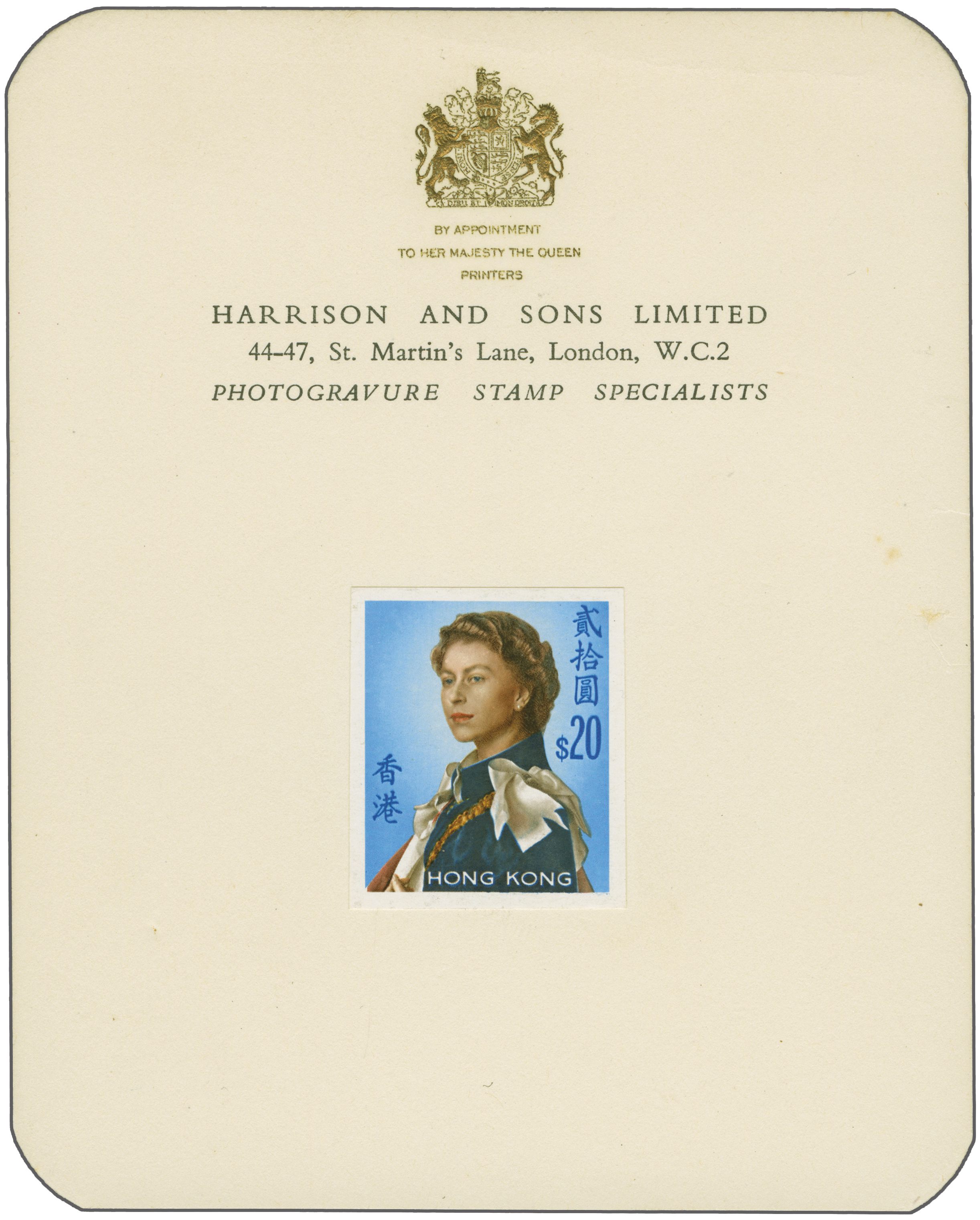 1962: Annigoni $ 20 multicoloured, an imperforate example on embossed Harrison & Sons Limited presentation card (101 x 126 mm.), a fine Proof and of great rarity (Image 1)