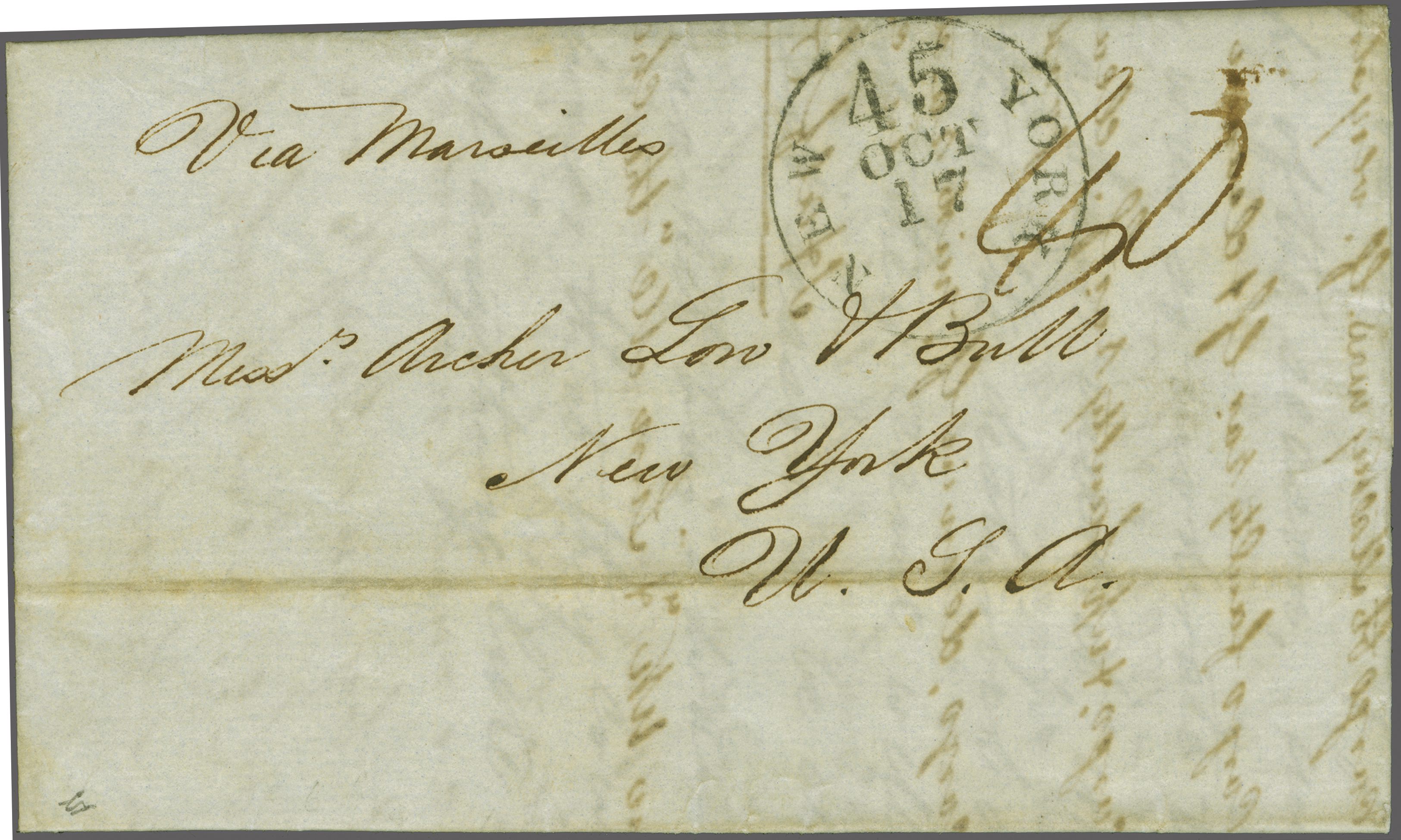 Carried on Cunard steamer "Asia" with manuscript "40" (cents) to pay and struck with New York Exchange Office "45 / NEW YORK" datestamp (Oct 17) in black - rate 40 c. plus 5 c. local postage (Image 1)