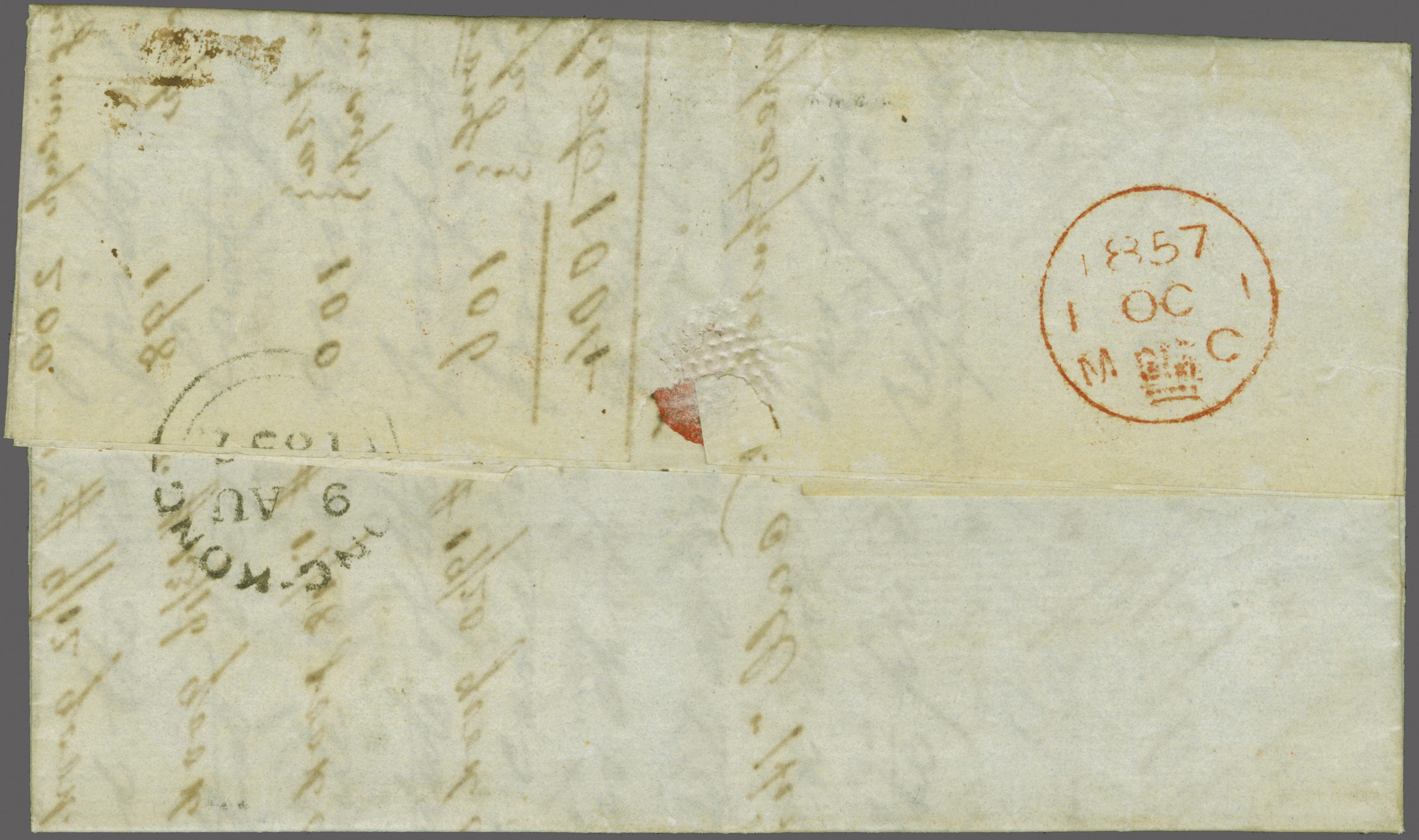 1857 (Aug 9): Entire letter from Augustine Heard & Co. in Hong Kong to New York, endorsed "via Marseilles", with reverse showing HONG KONG double arc despatch cds (Aug 9) in black, London transit cds in red (Oct 1).