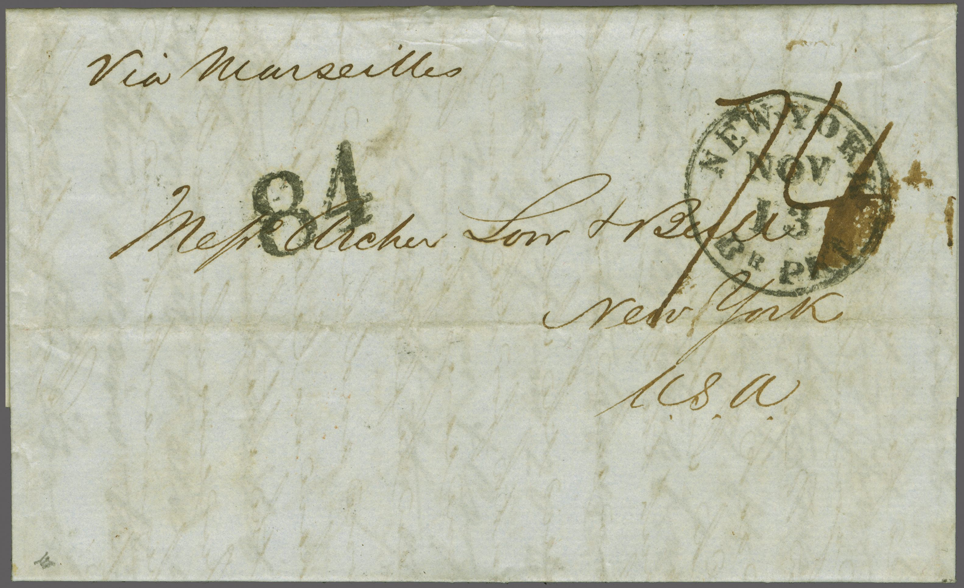 Cunard steamer "Arabia" with manuscript "74" (cents) to pay for double rate, and struck with "NEW YORK / Br. PKT." cds (Nov 13) in black with handstruck "84" (cents) due in black at left. Note: Contents on 2nd Opium War: "The British Fleet have