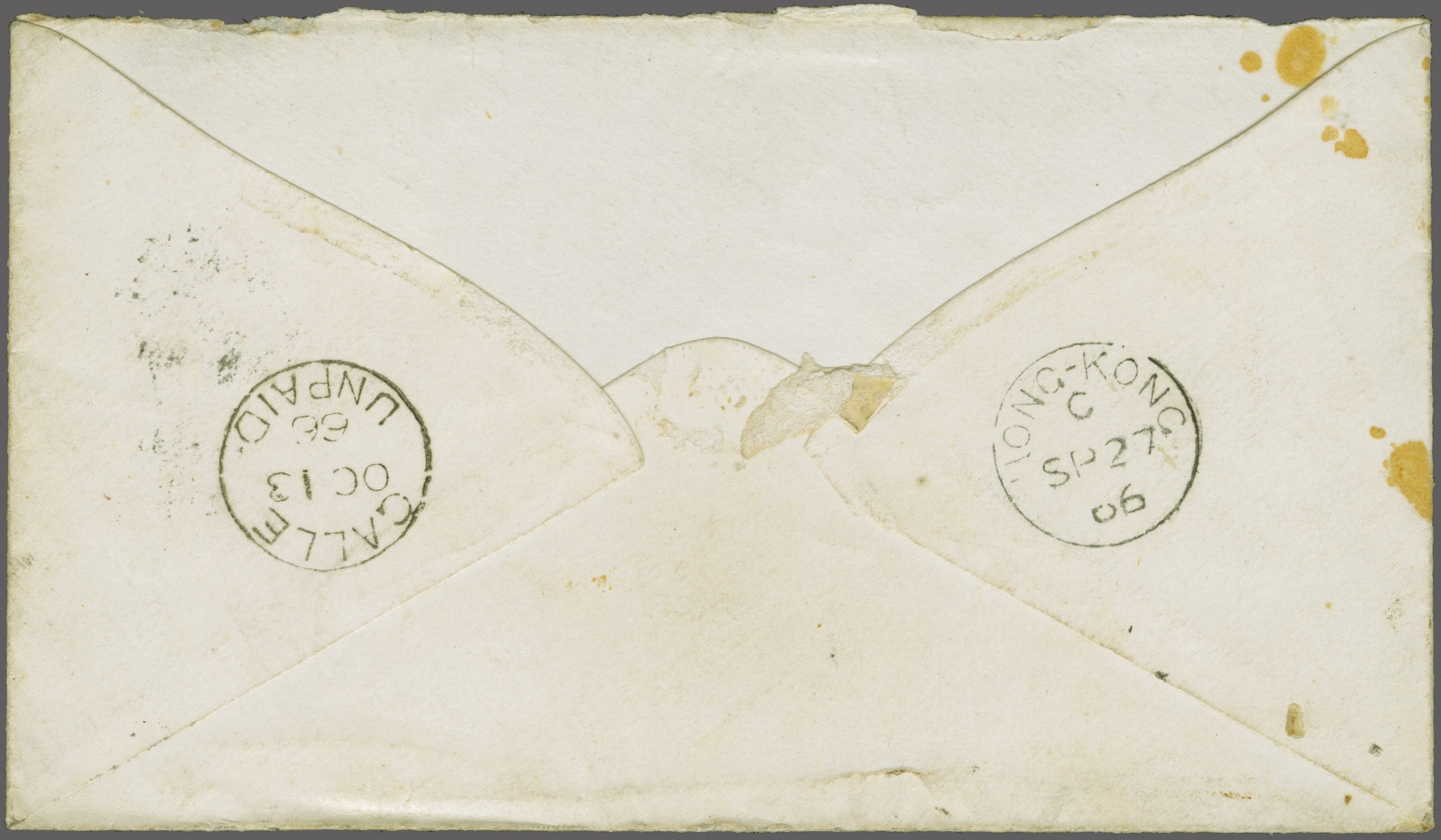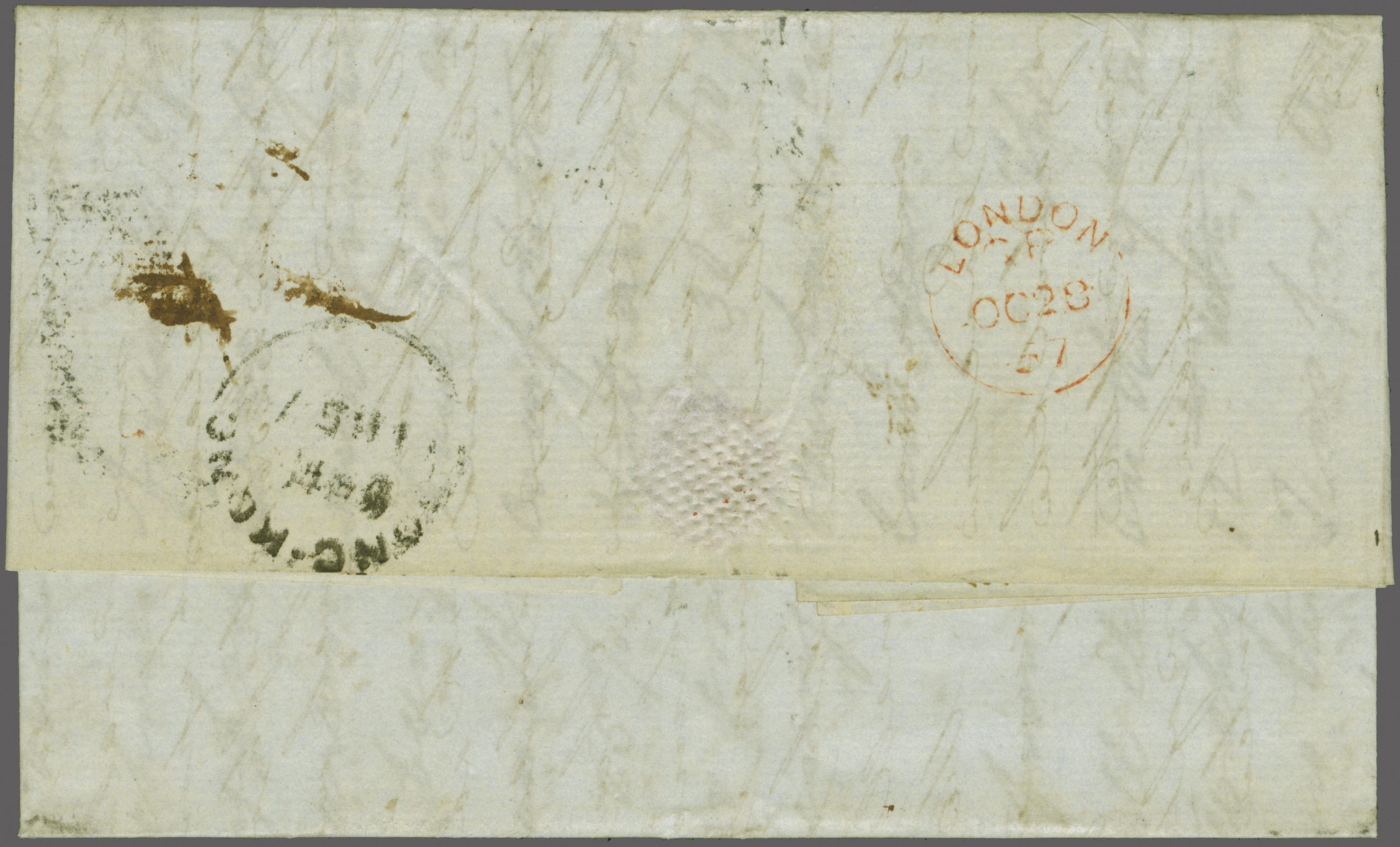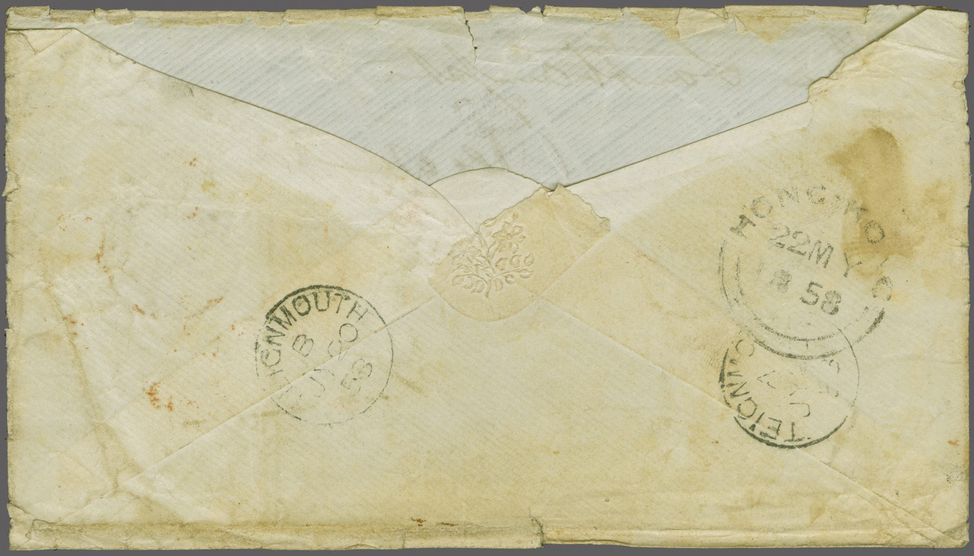 1858 (May 22): Cover and complete contents from Hong Kong to Teignmouth, Devon endorsed "via Southampton", struck with central "♚ / PAID / AT / HONG KONG" in red and rated "6" pence paid in manuscript; "London / Paid" cds at