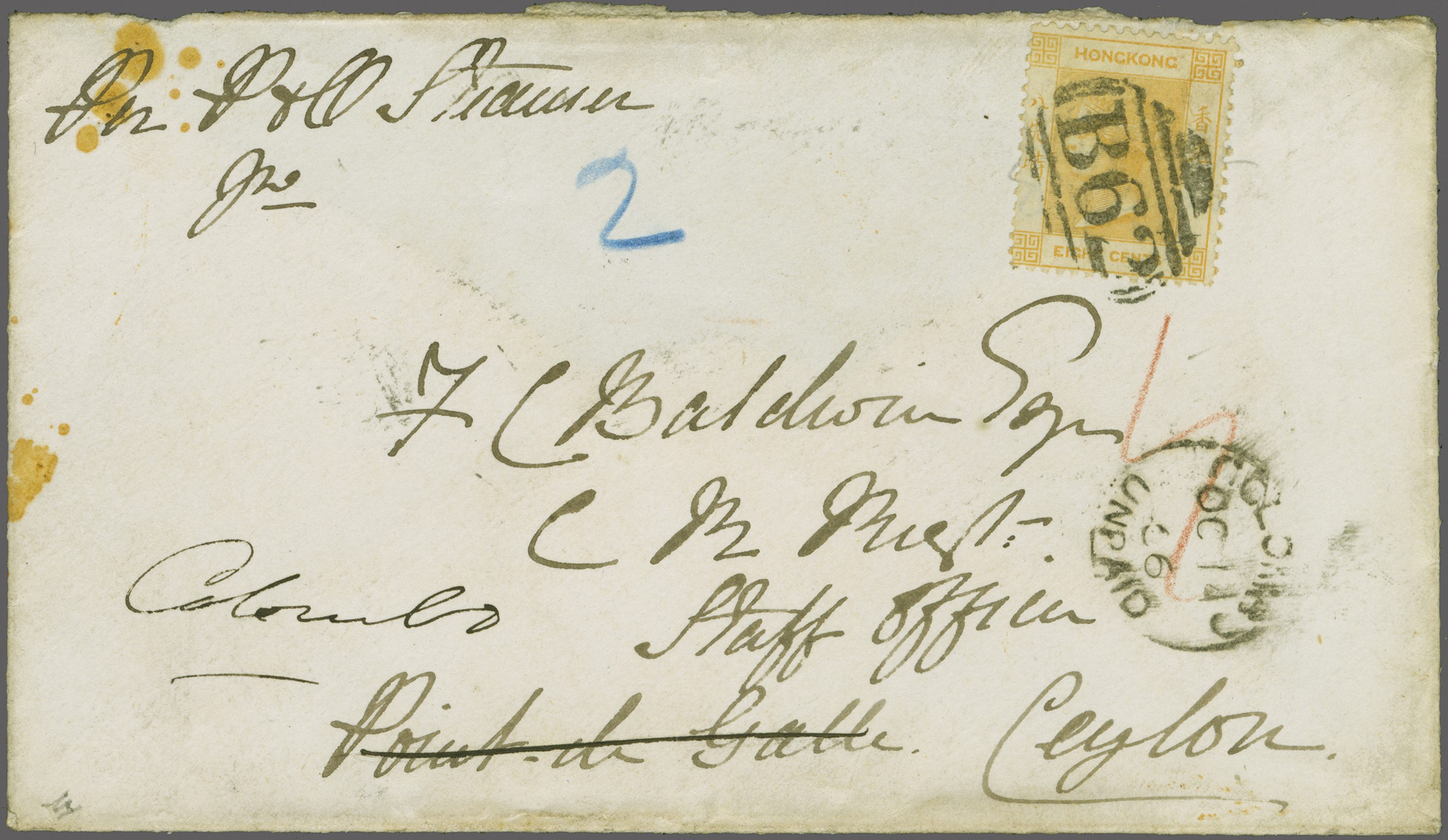 1863/71: 8 c. pale dull orange, a single example used on 1866 cover to Point de Galle, Ceylon endorsed "Per P&O Steamer" tied by "B62" obliterator in black; reverse with HONG KONG code C despatch cds (Sept 27). Red credit