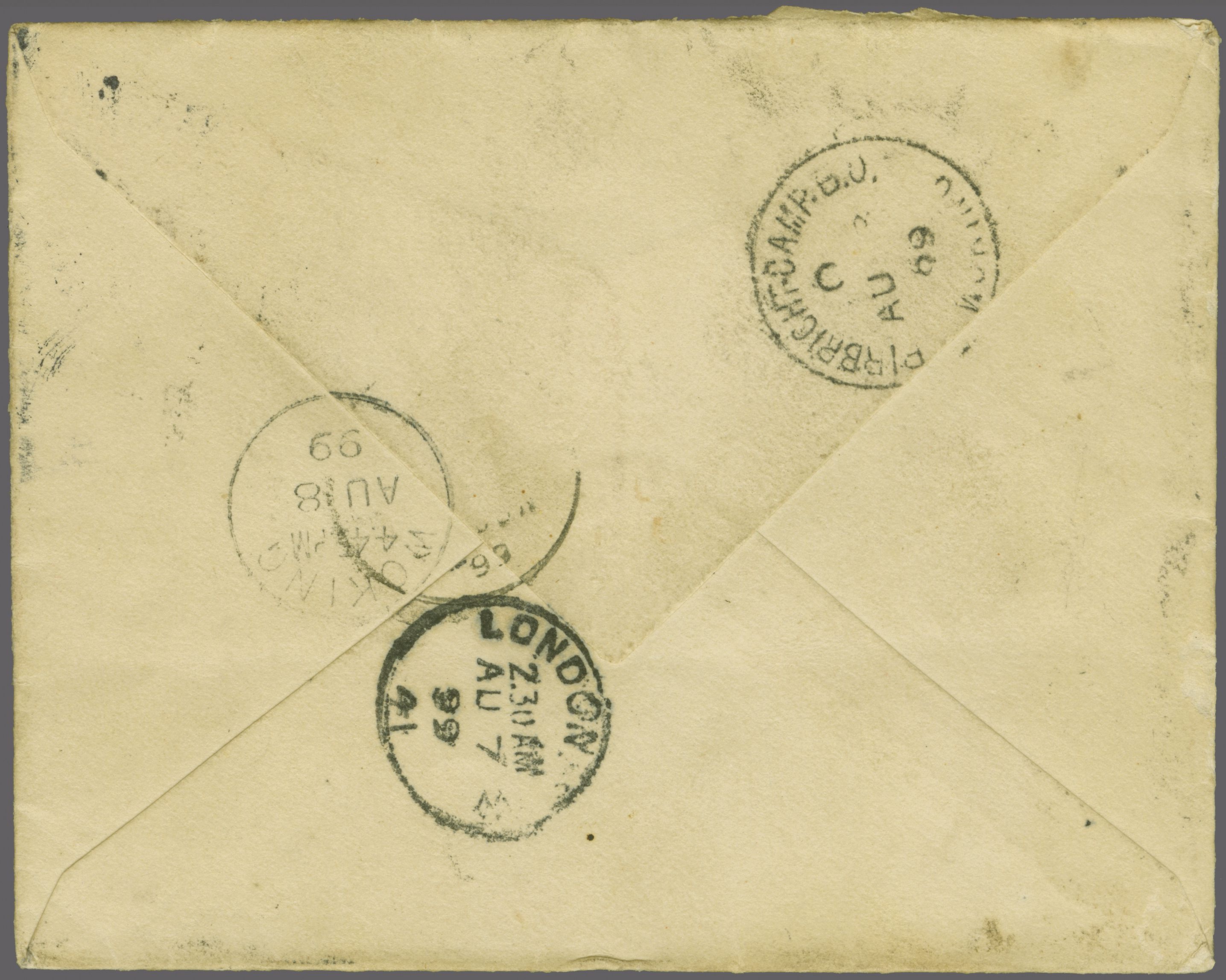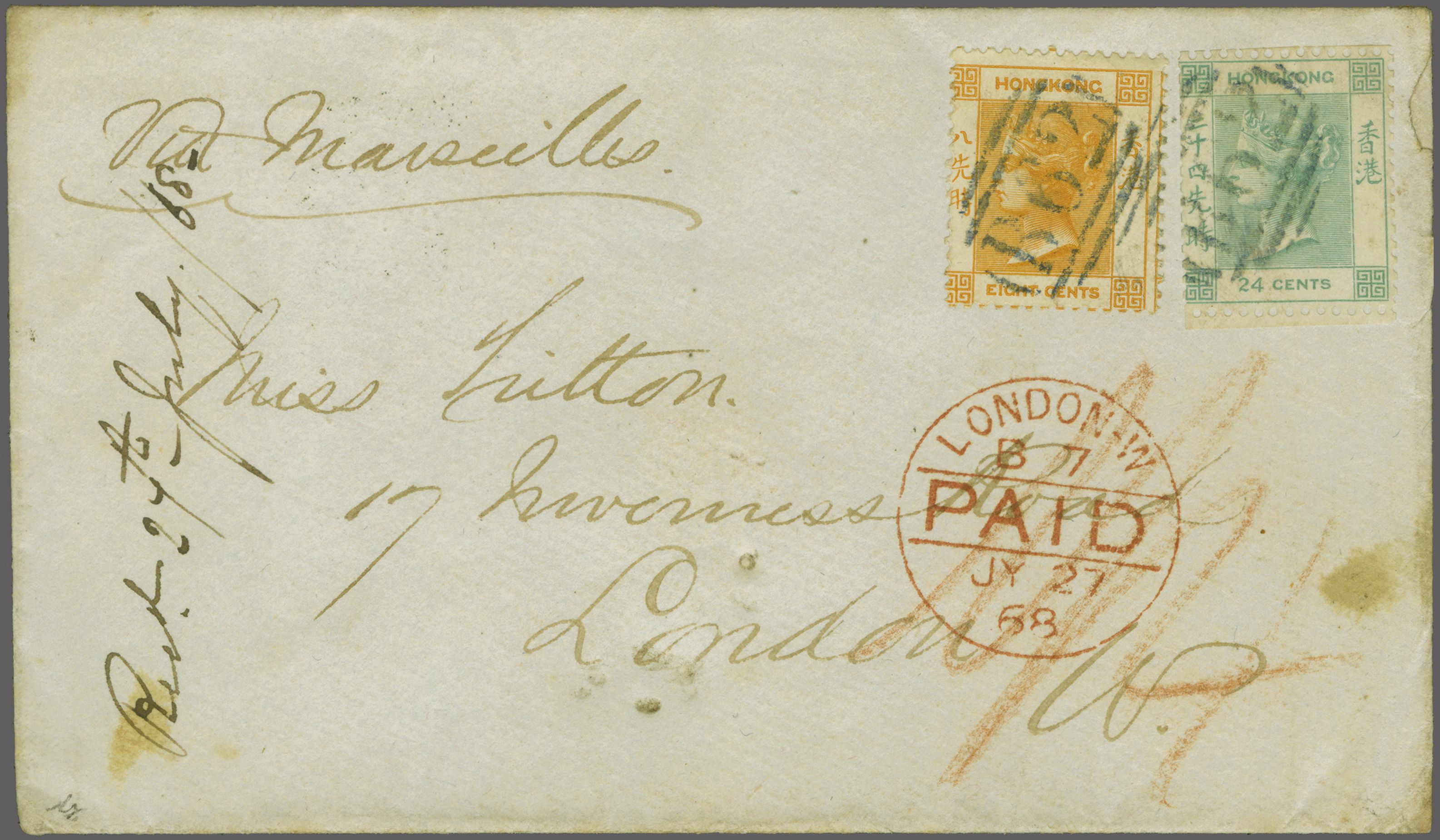 (June 5), HONG-KONG transit cds (June 10) and obverse with "London / Paid" cds (July 27) in red. A fine and most attractive cover (Image 1)