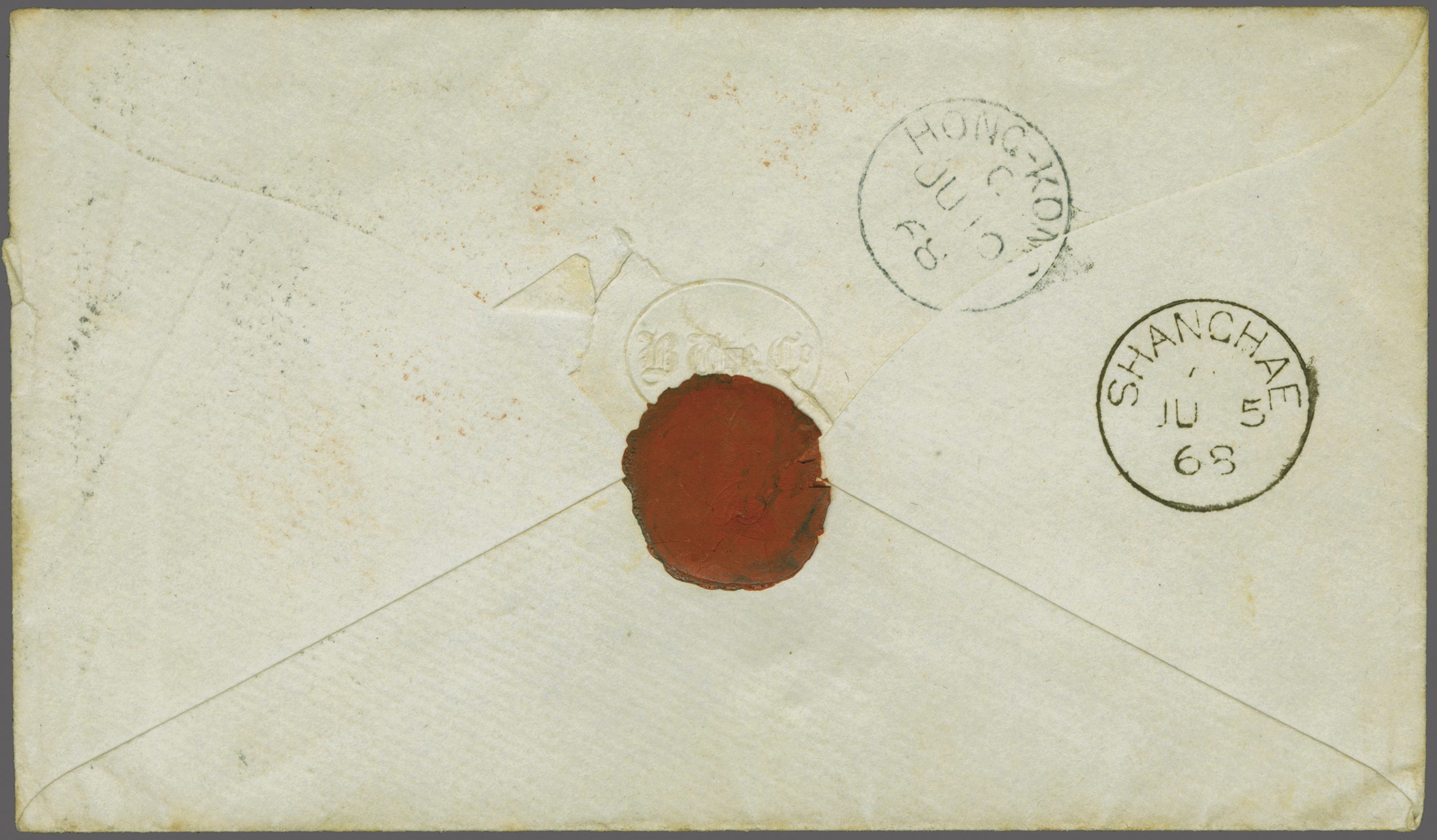 1863/71: 8 c. bright orange and 24 c. pale green used on 1868 cover from Shanghai to London endorsed "via Marseilles", tied by "B62" obliterators in black. Reverse with "SHANGHAE" code C circular datestamp in black of despatch