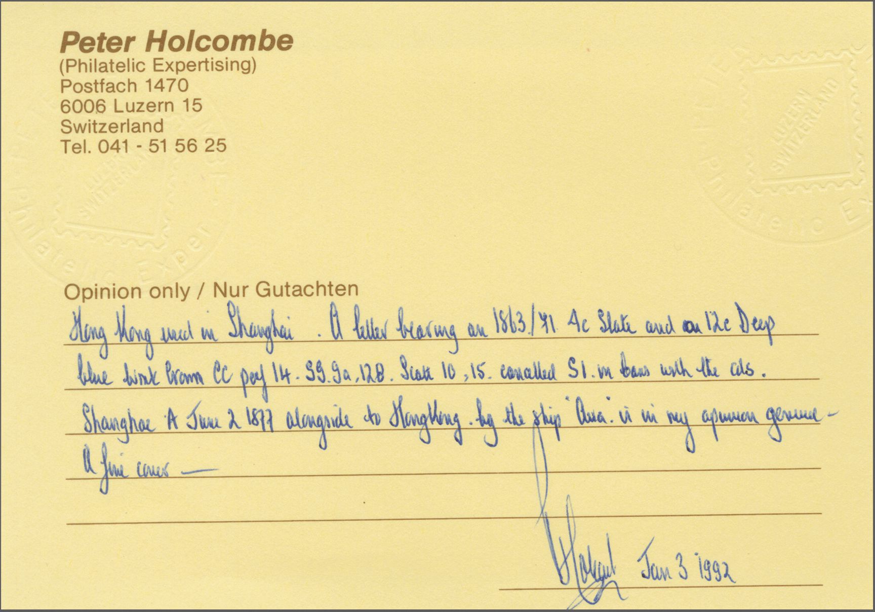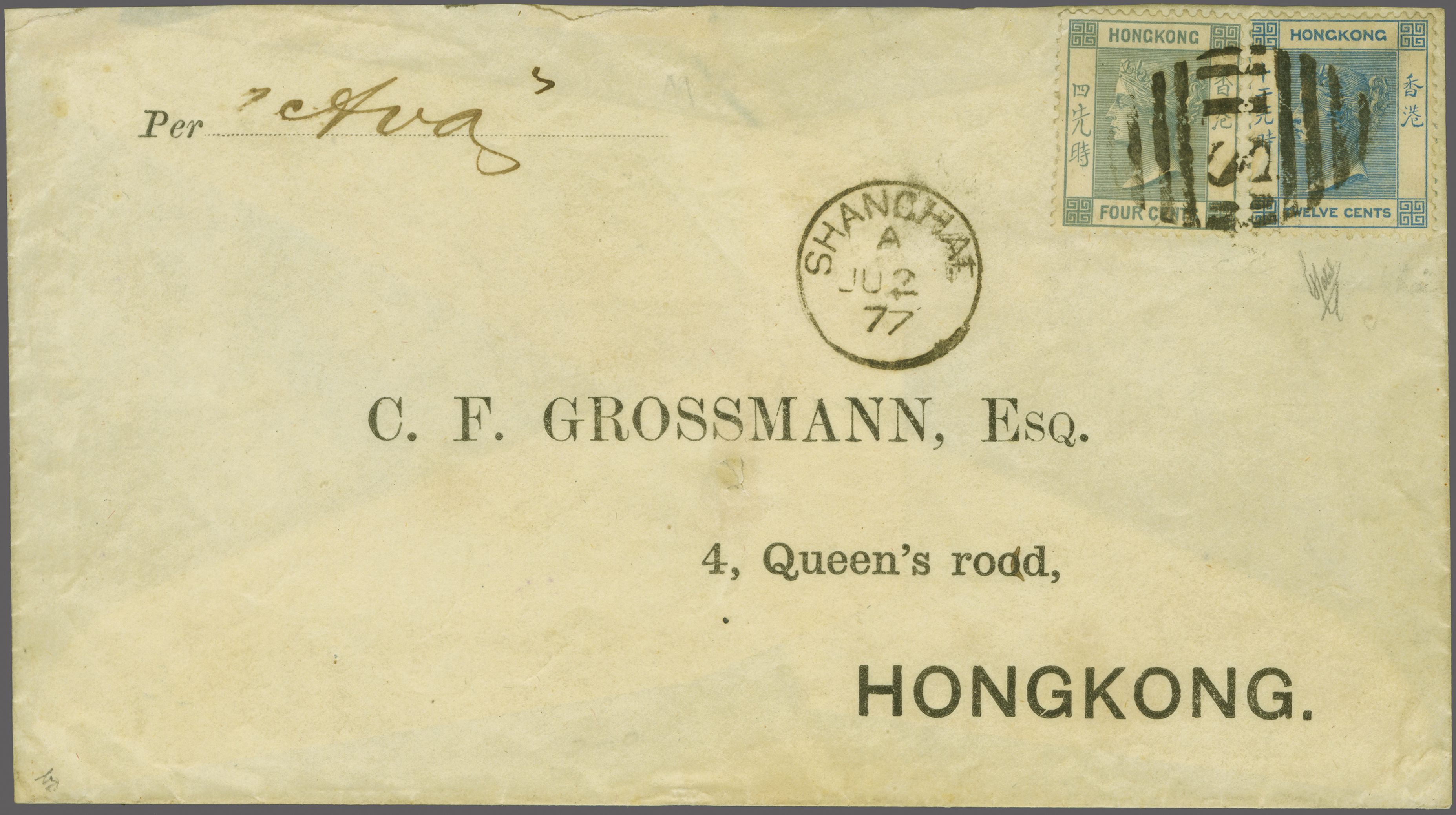 1863/71: 4 c. slate and 12 c. deep blue (Gi Z773+Z776) used on printed 1877 cover from Shanghai to Hong Kong endorsed "per Ava", tied by bold strike of "S1" obliterator with fine "SHANGHAE" code A cds adjacent (June 2) in