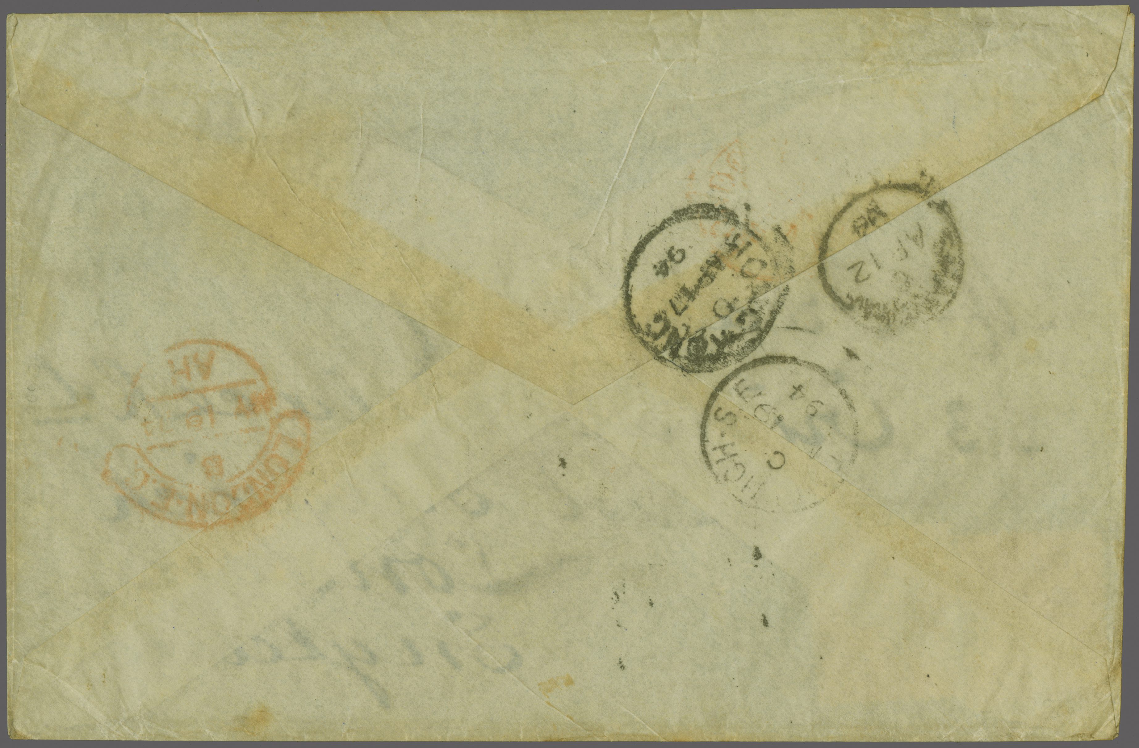 1882/96: 2 c. carmine and 5 c. pale blue, single examples (Gi Z451+Z453) used on 1894 cover from Hankow to London tied by "HANKOW" code C datestamps (April 9) in black. Reverse with SHANGHAE (April 12) and HONG KONG transit