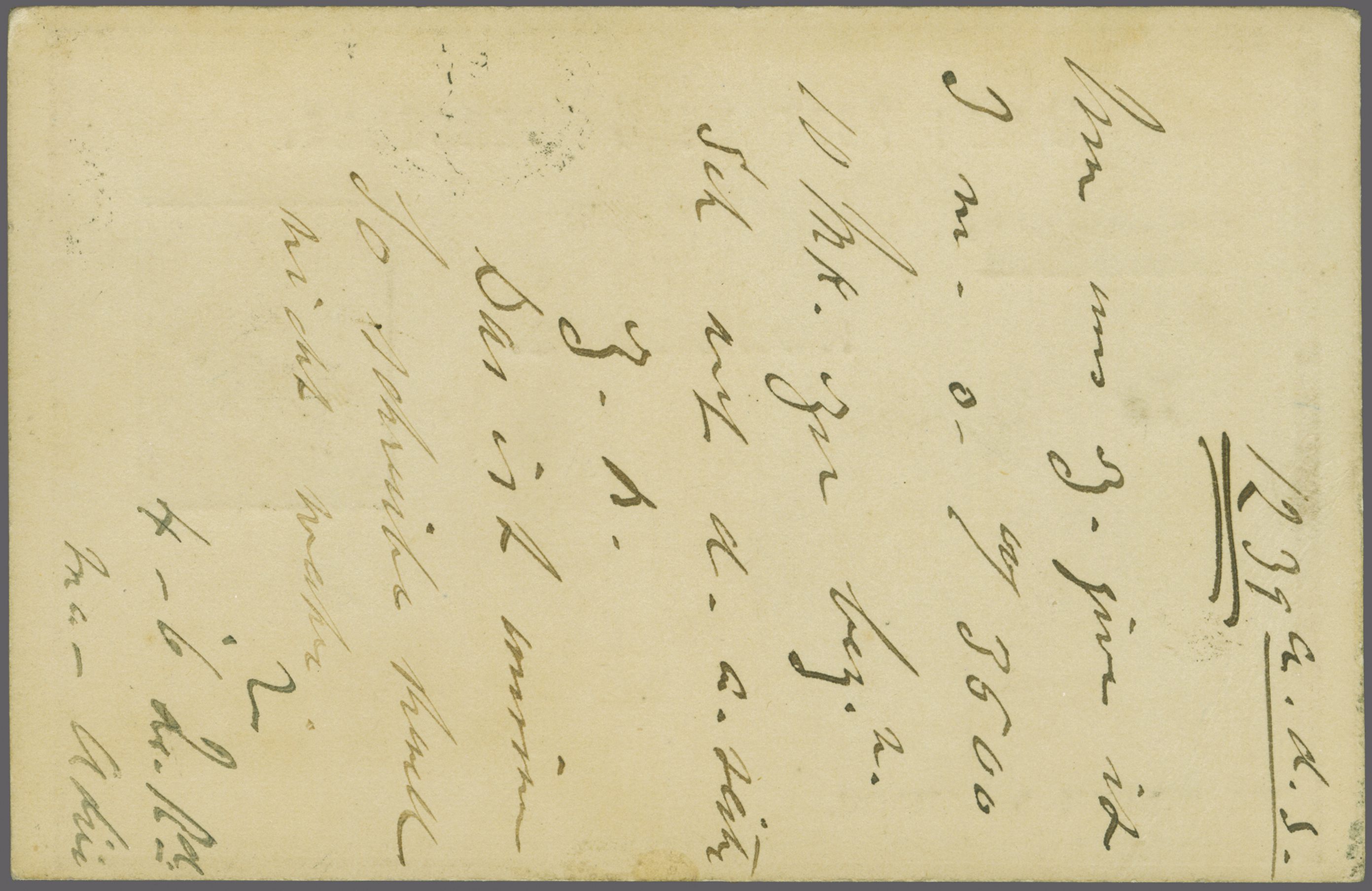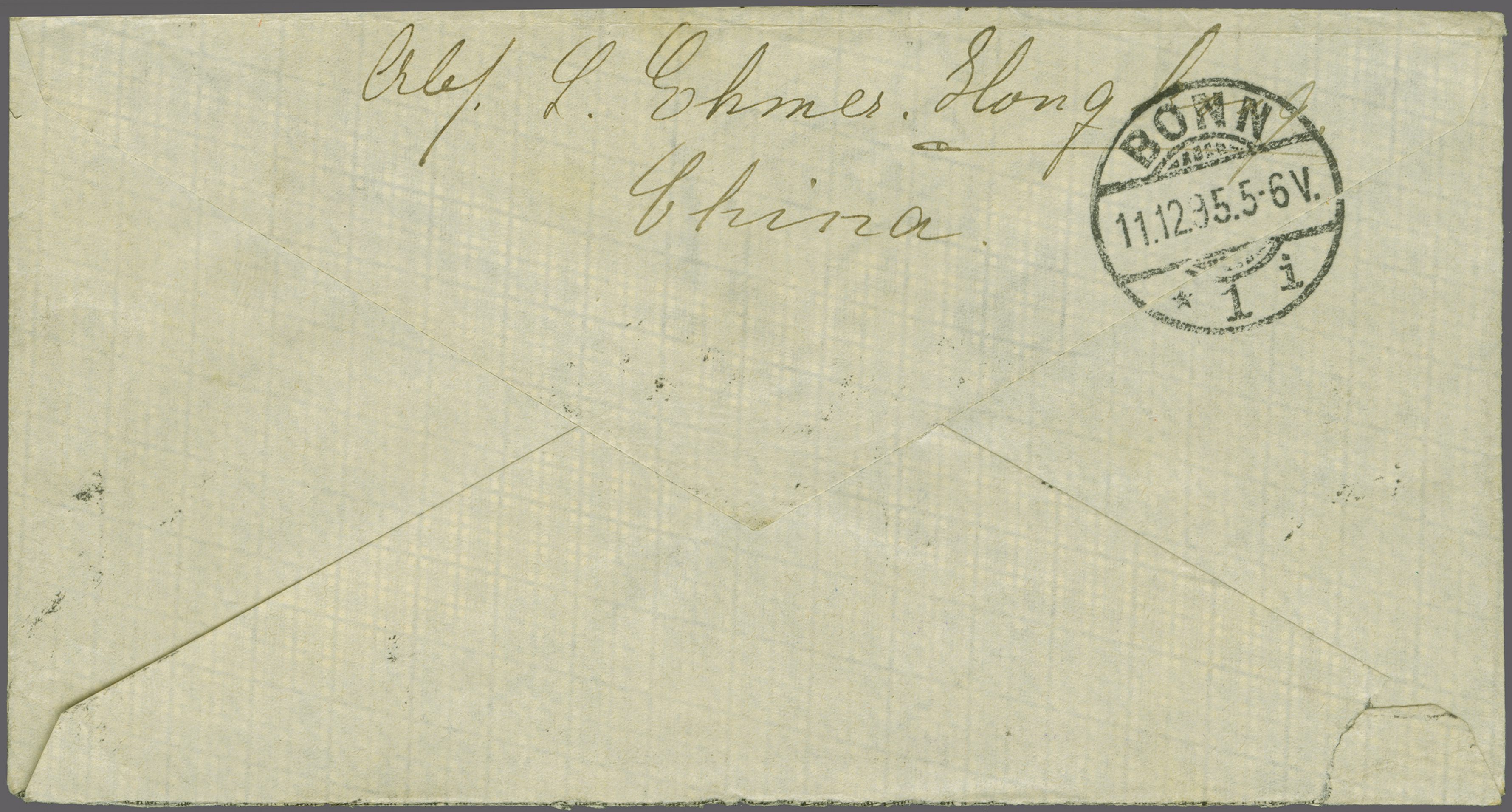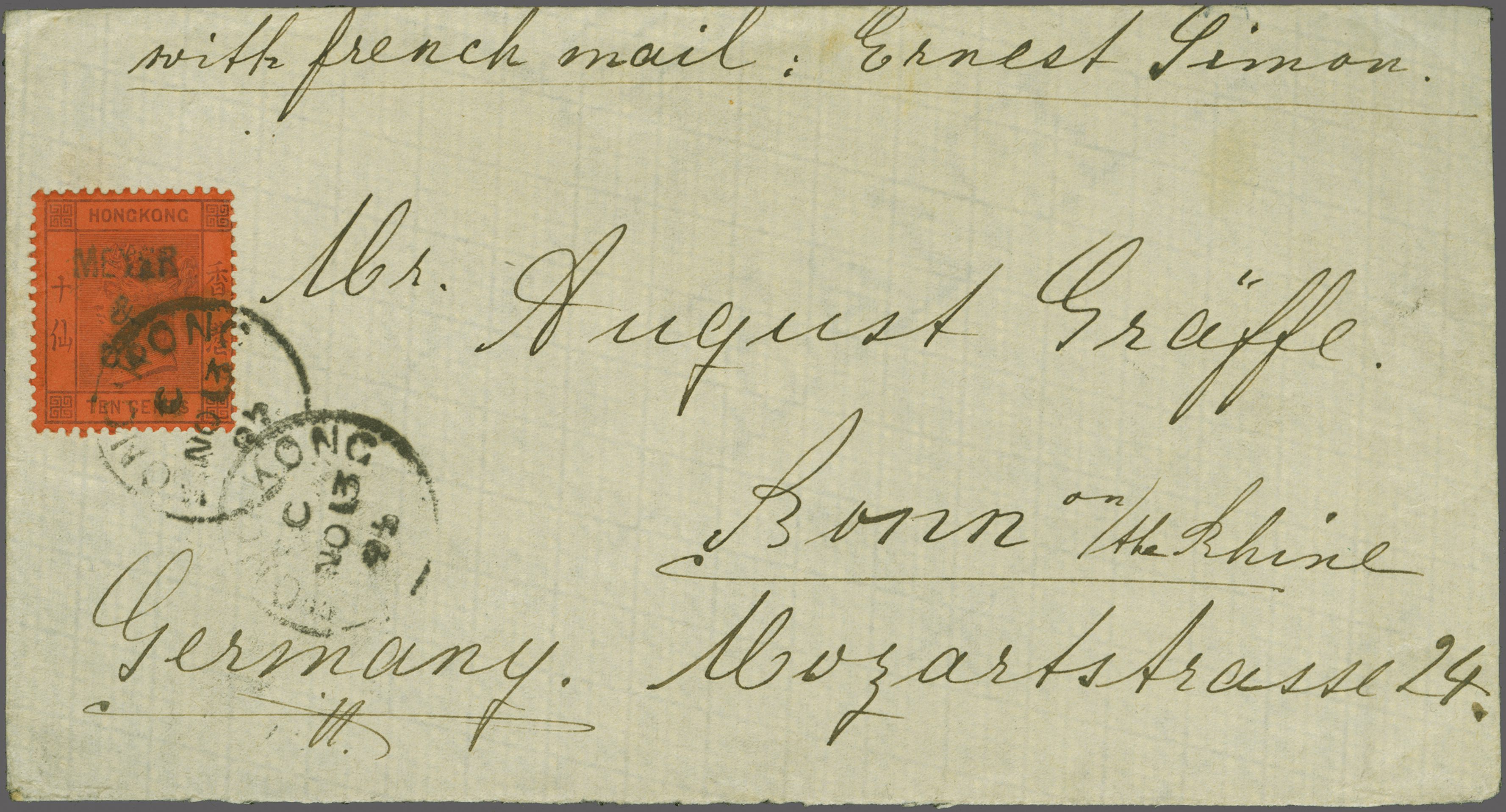 1891: 10 c. purple on red, a single example security handstamped 'MEYER & Co.' in black, used on 1895 cover to Bonn, Germany endorsed "with French mail: Ernest Simon" tied by HONG KONG code C datestamp (Nov 13) in black.