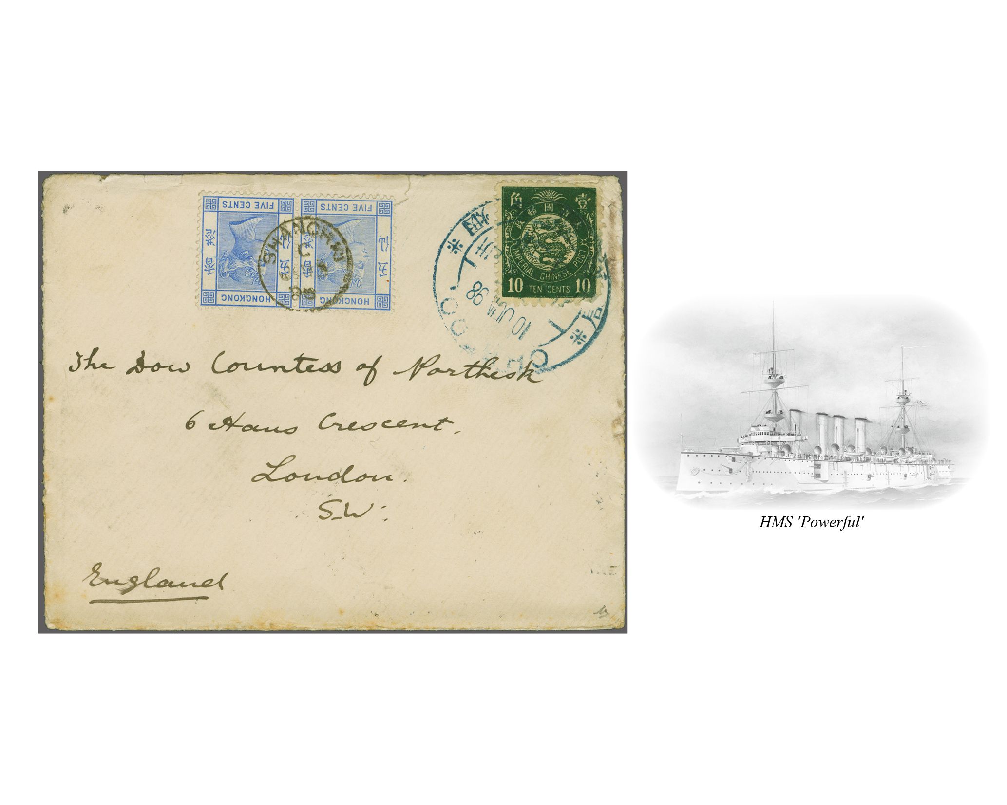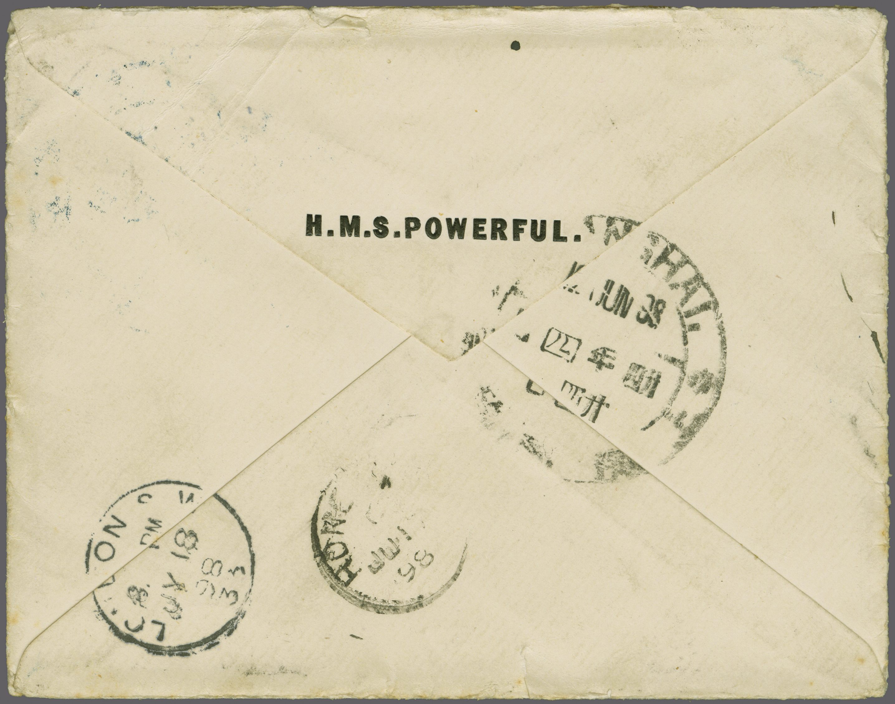 cds code C datestamp (June 13) in black. Reverse with imprinted "HMS Powerful" on flap in black; SHANGHAI dollar chop in black, Hong Kong cds and London (July 18) arrival. A fine and most attractiive cover. Note: HMS Powerful was built expressly for