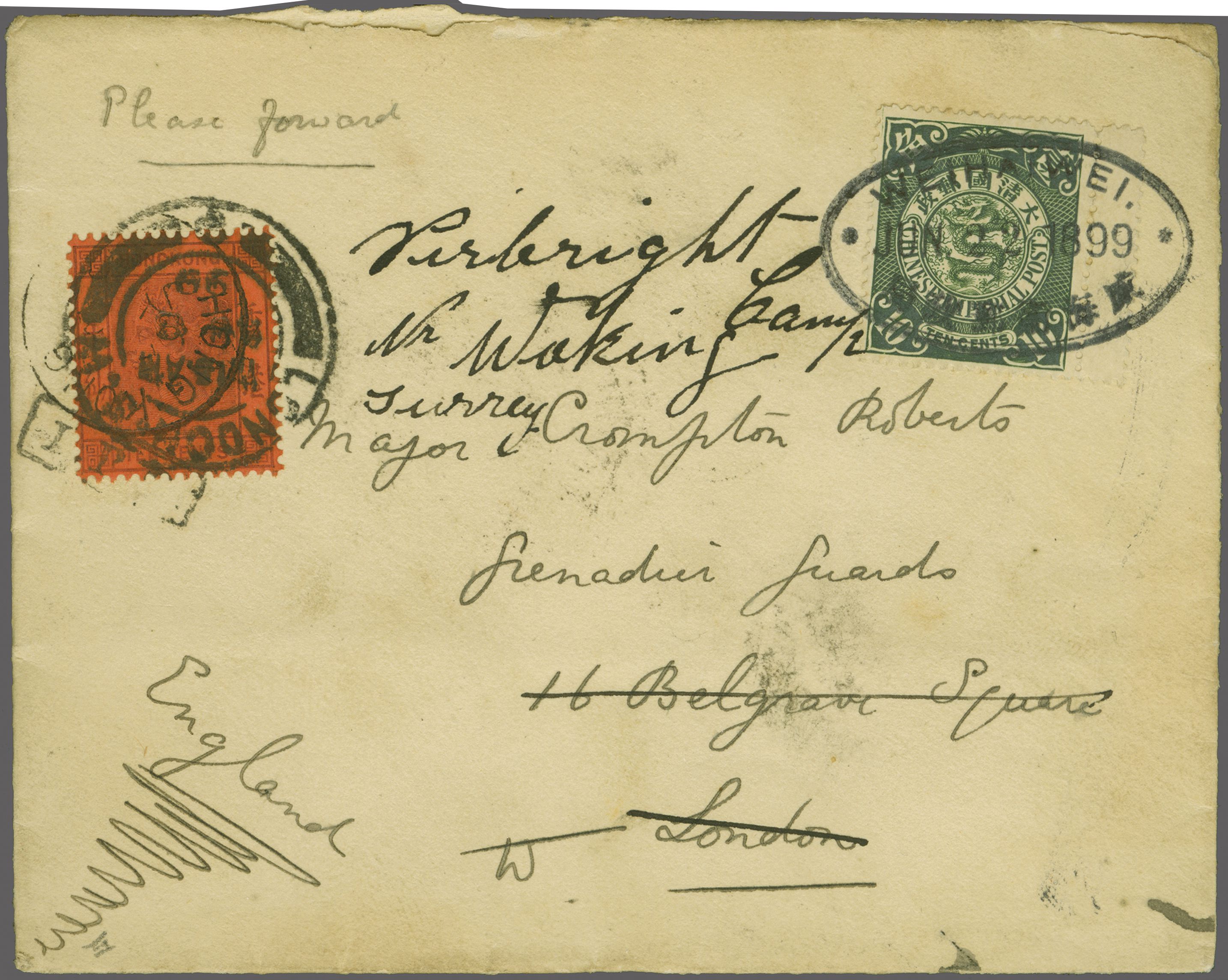 1898: China Coiling Dragon 10 c. deep green, a marginal example (Gi 113), used on 1899 combination cover to London tied by bilingual oval framed "WEI HEI WEI" datestamp in black (June 22). Hong Kong 1882/96 10 c. purple on red