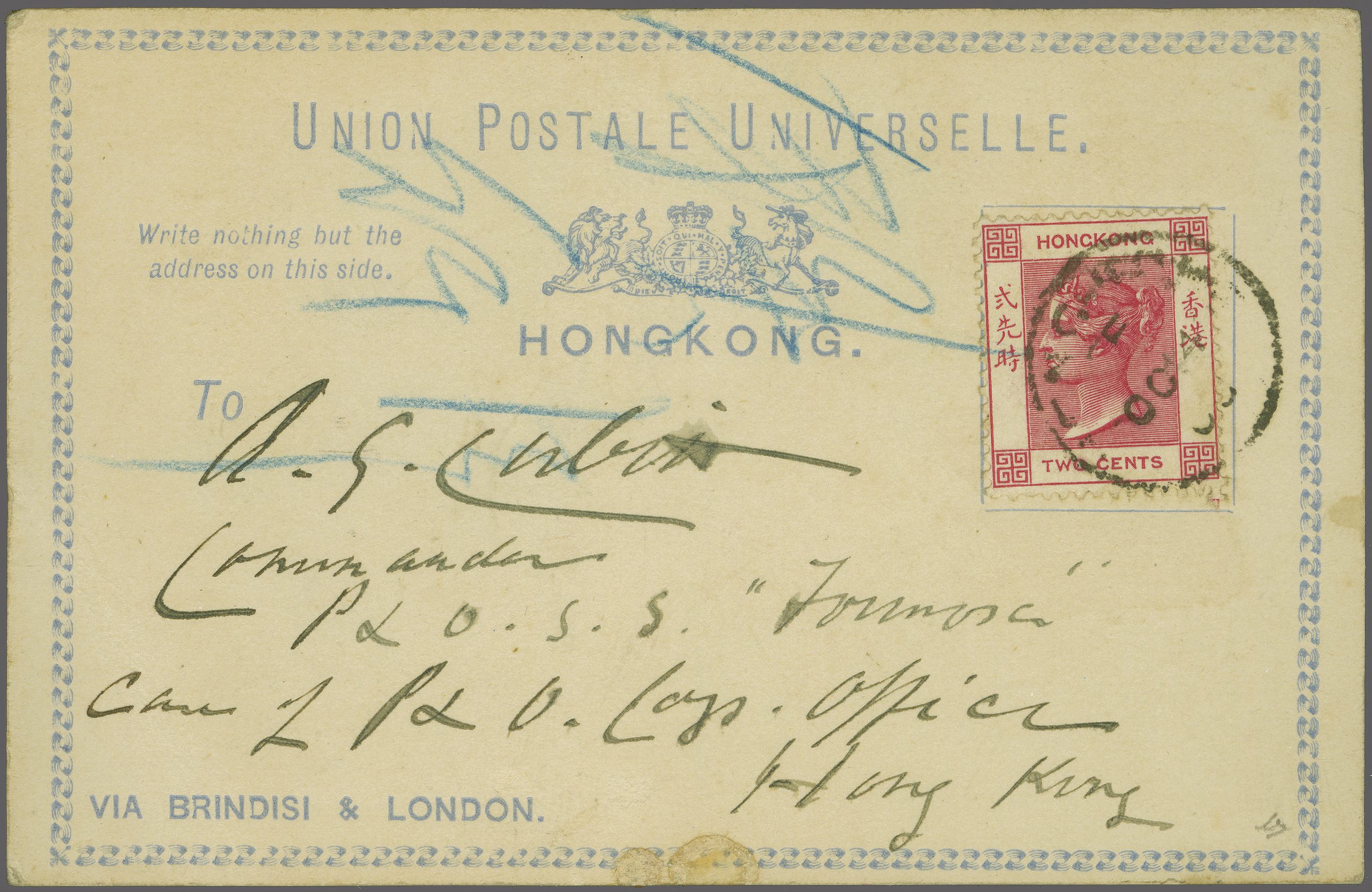 1882/96: 2 c. carmine used on 1879 Hong Kong provisional postal stationery card, addressed to the Commander of the P&O steamer "S.S. Formosa" in Hong Kong tied by SHANGHAE code F datestamp (Oct 14) in black. An unusual