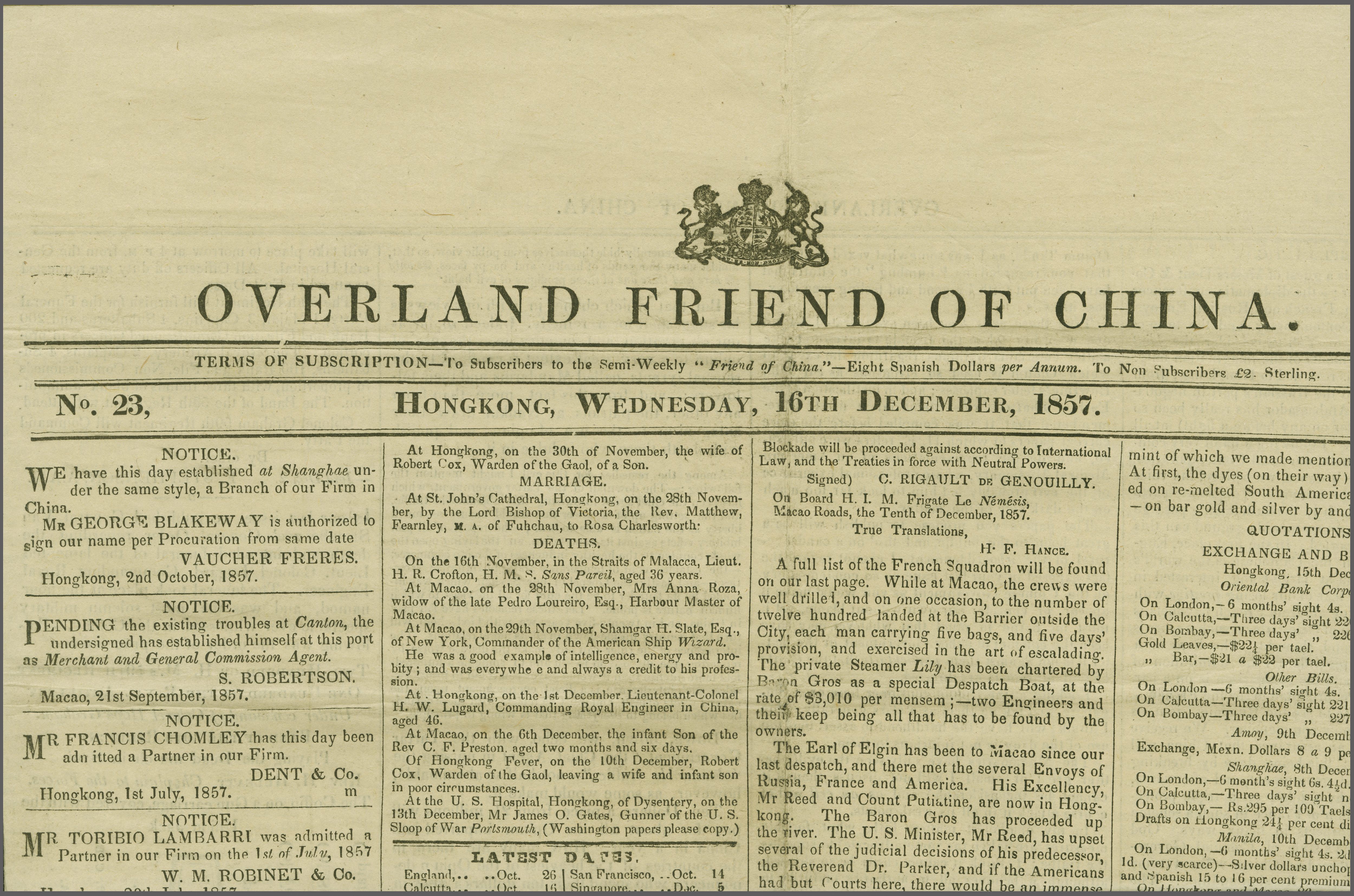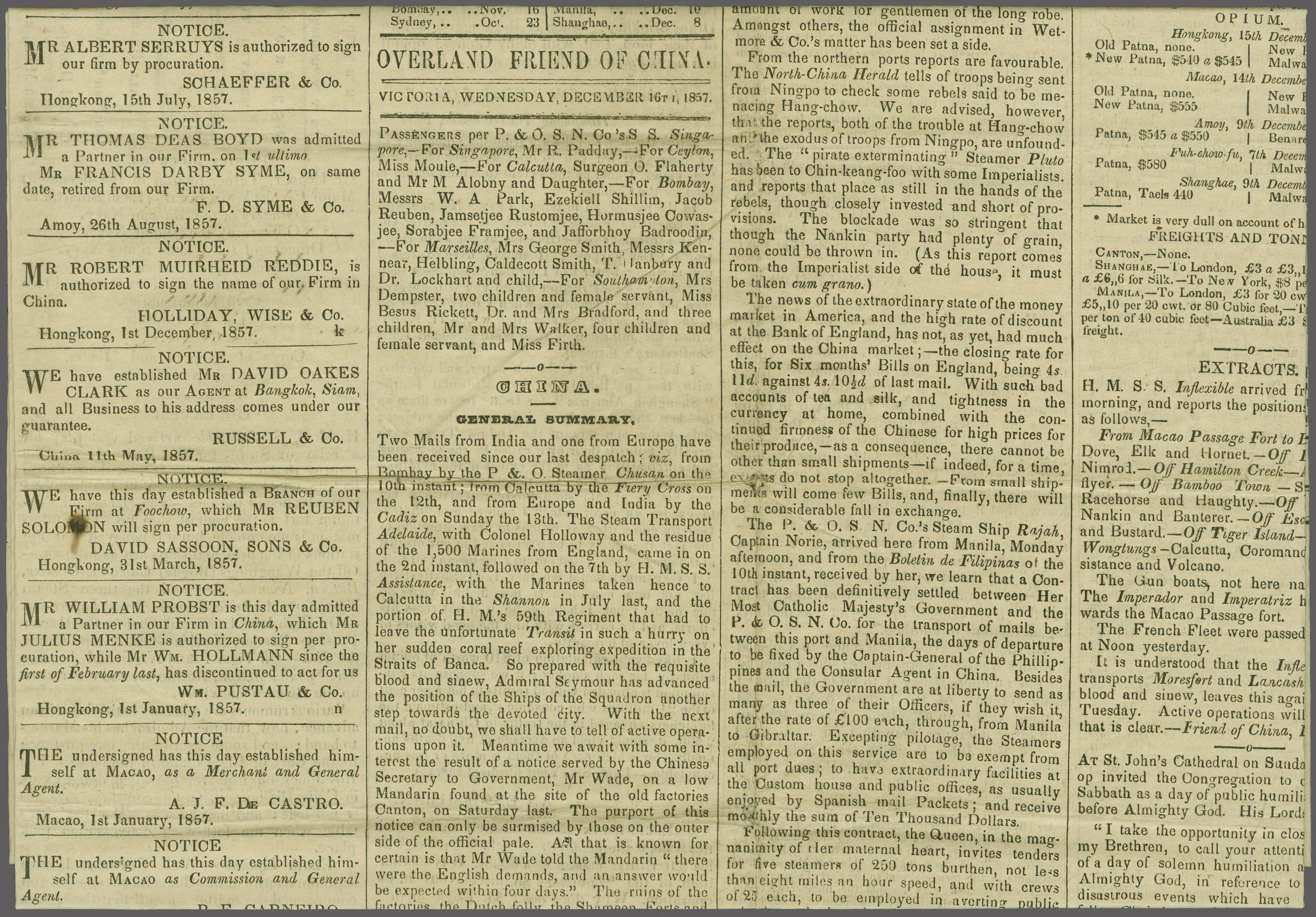 complete Newspaper with much information on the 2nd Opium War "From the 12th of the current month, the River and Port of Canton and their outlets will be held in a state of effective Blockade"; and market quotations for Opium and local correspondence