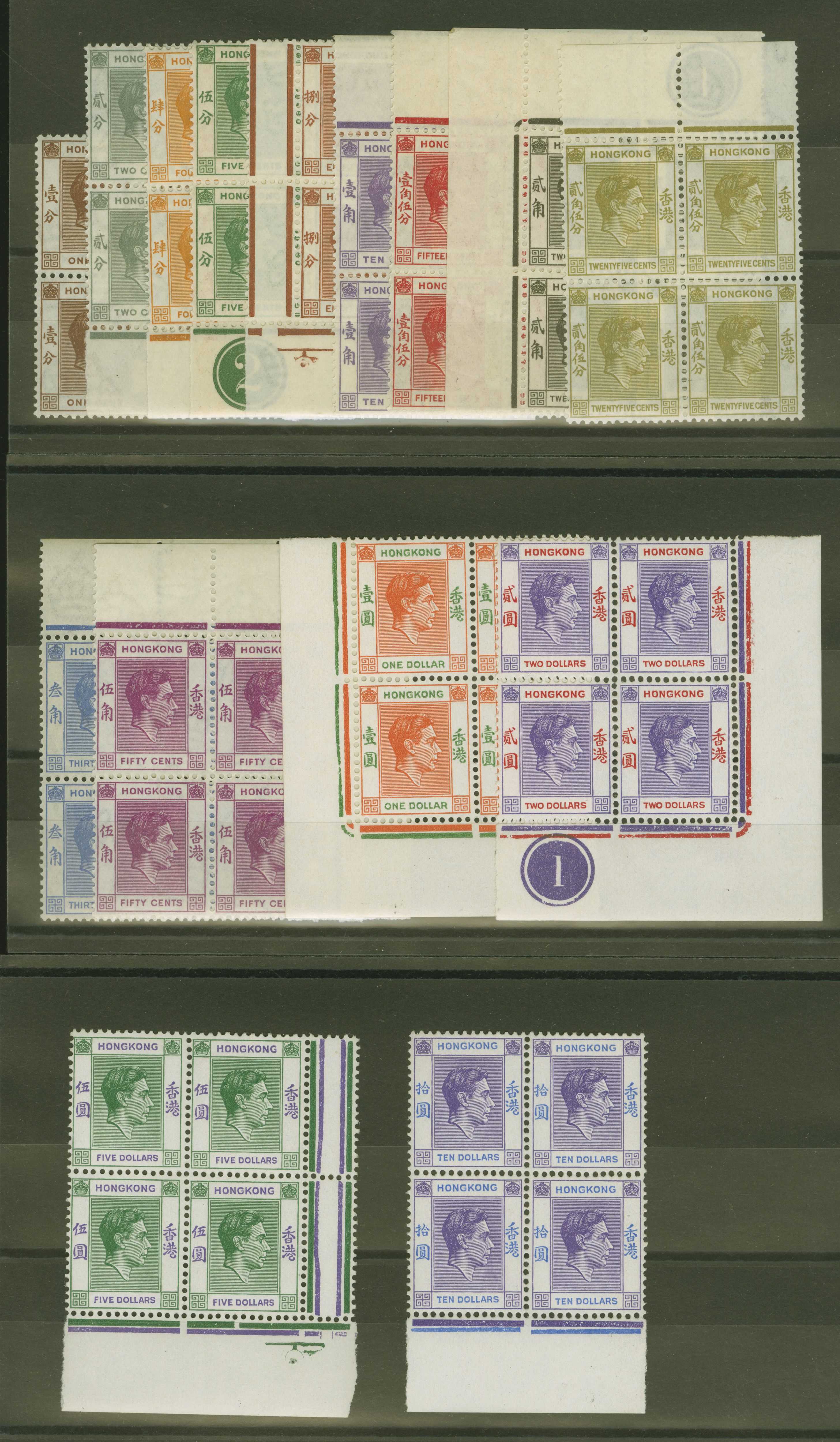 1938/52: Definitives, 1 c. - 20 c. black, 25 c. pale yellow-olive, 30 c. blue, 50 c. purple, $ 1 red-orange & green, $ 2 reddish-violet & scarlet, $ 5 green & violet and $ 10 lilac & blue; all in unused blocks
