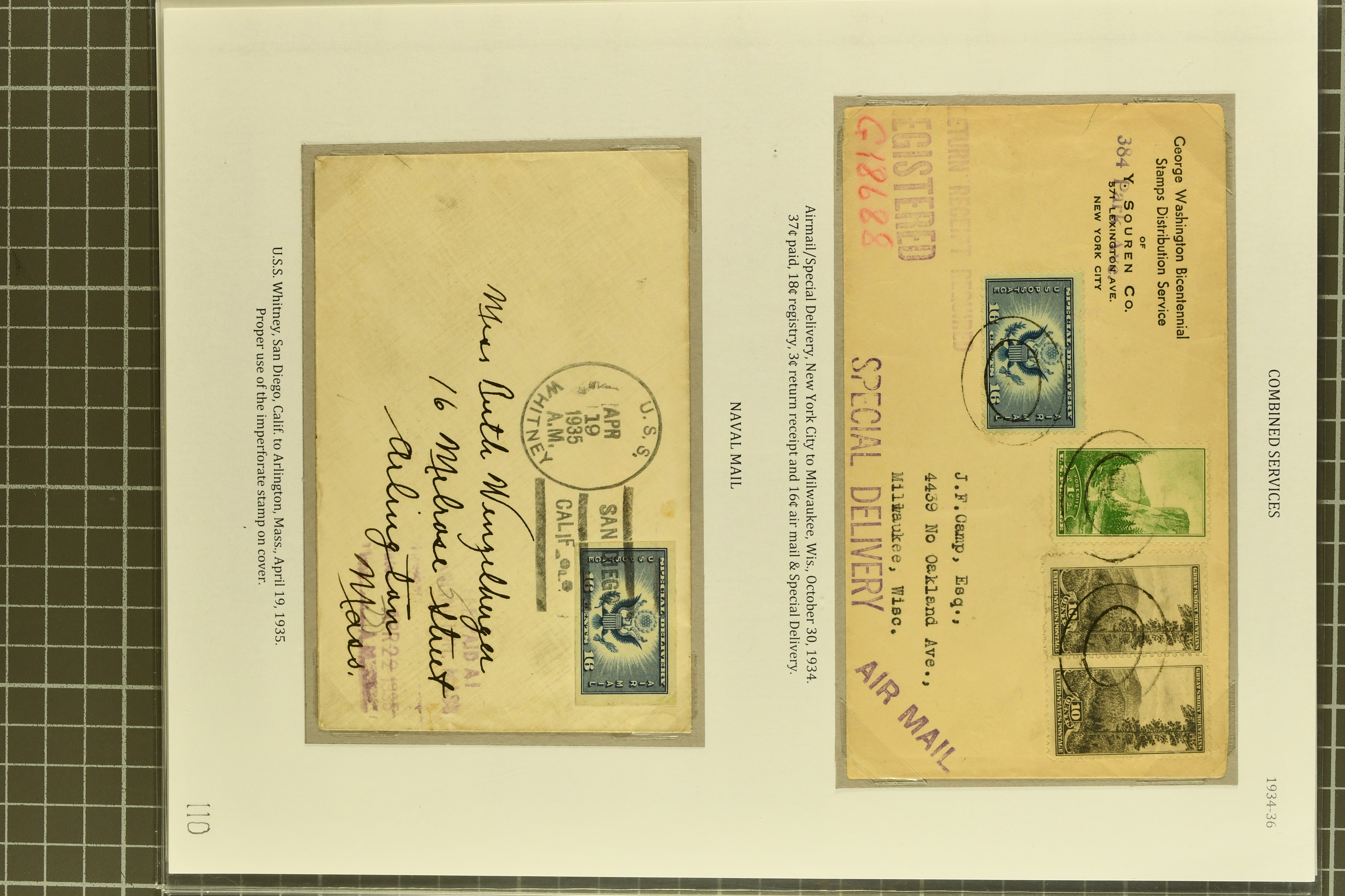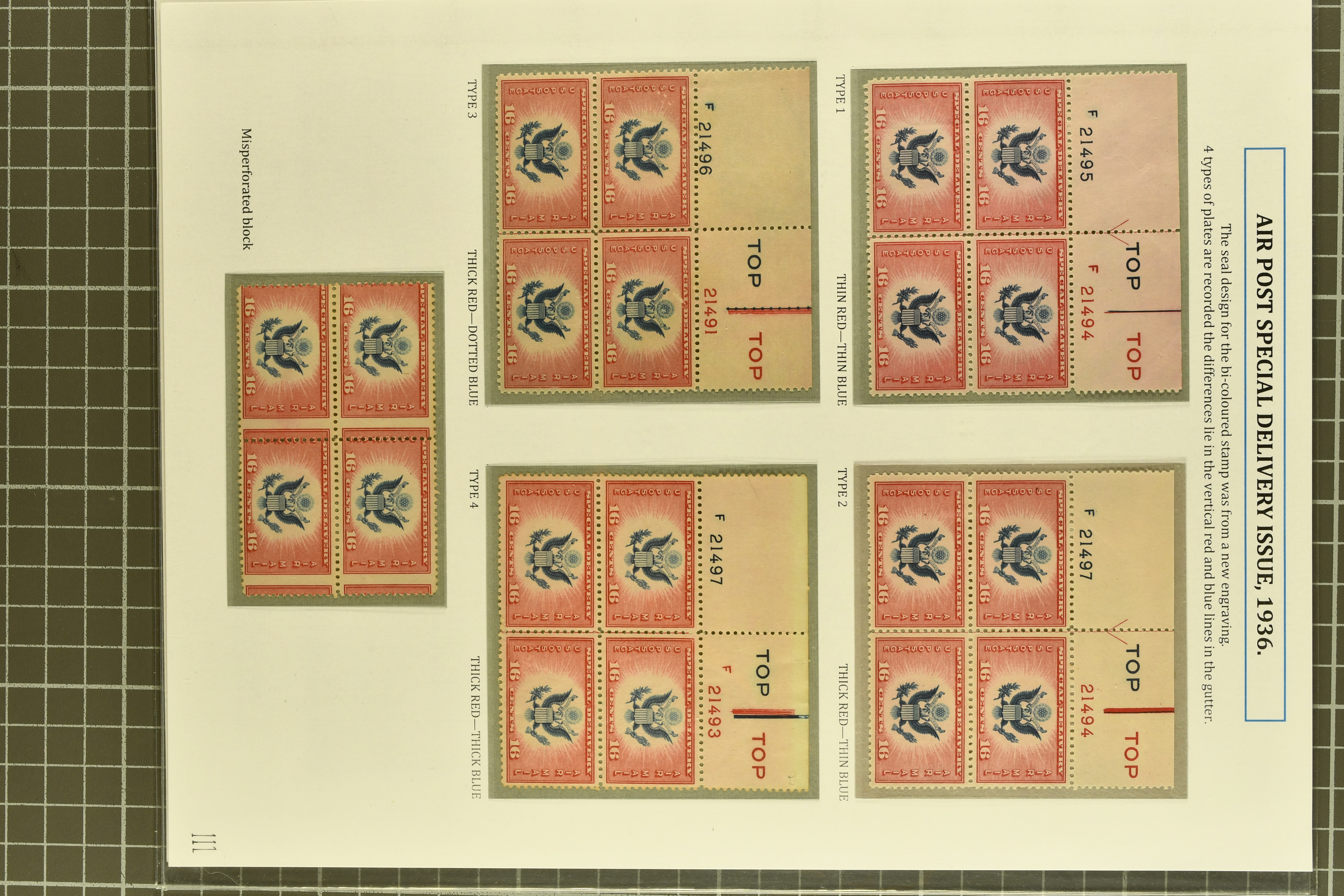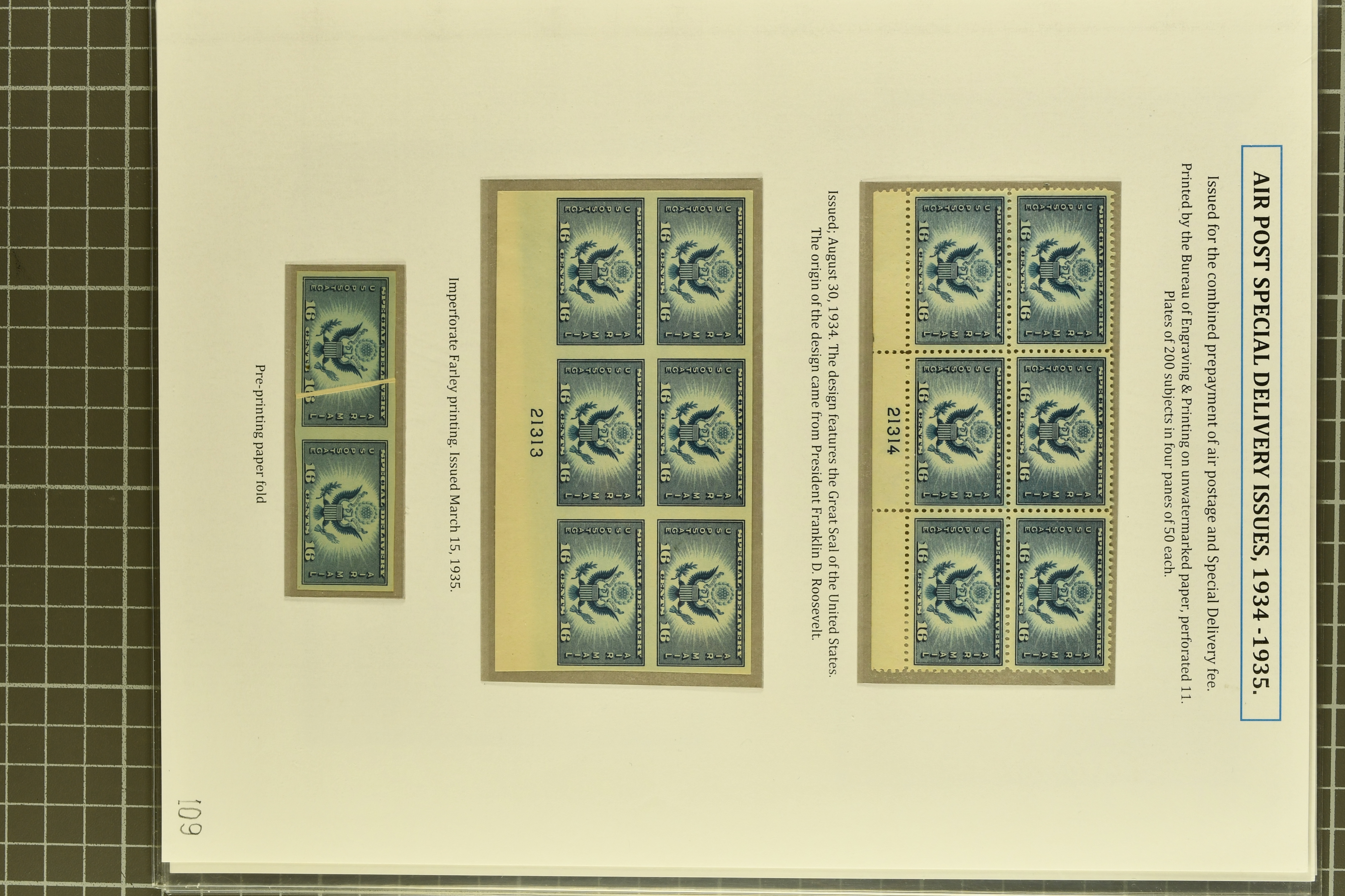 1934-6 Air Mail Special Delivery Issue 1934-6: 16 c. dark blue & 16 c. red & blue, stamp and postal history group, mounted on four exhibit pages, with 1934 issue highlights including imperforate Farley