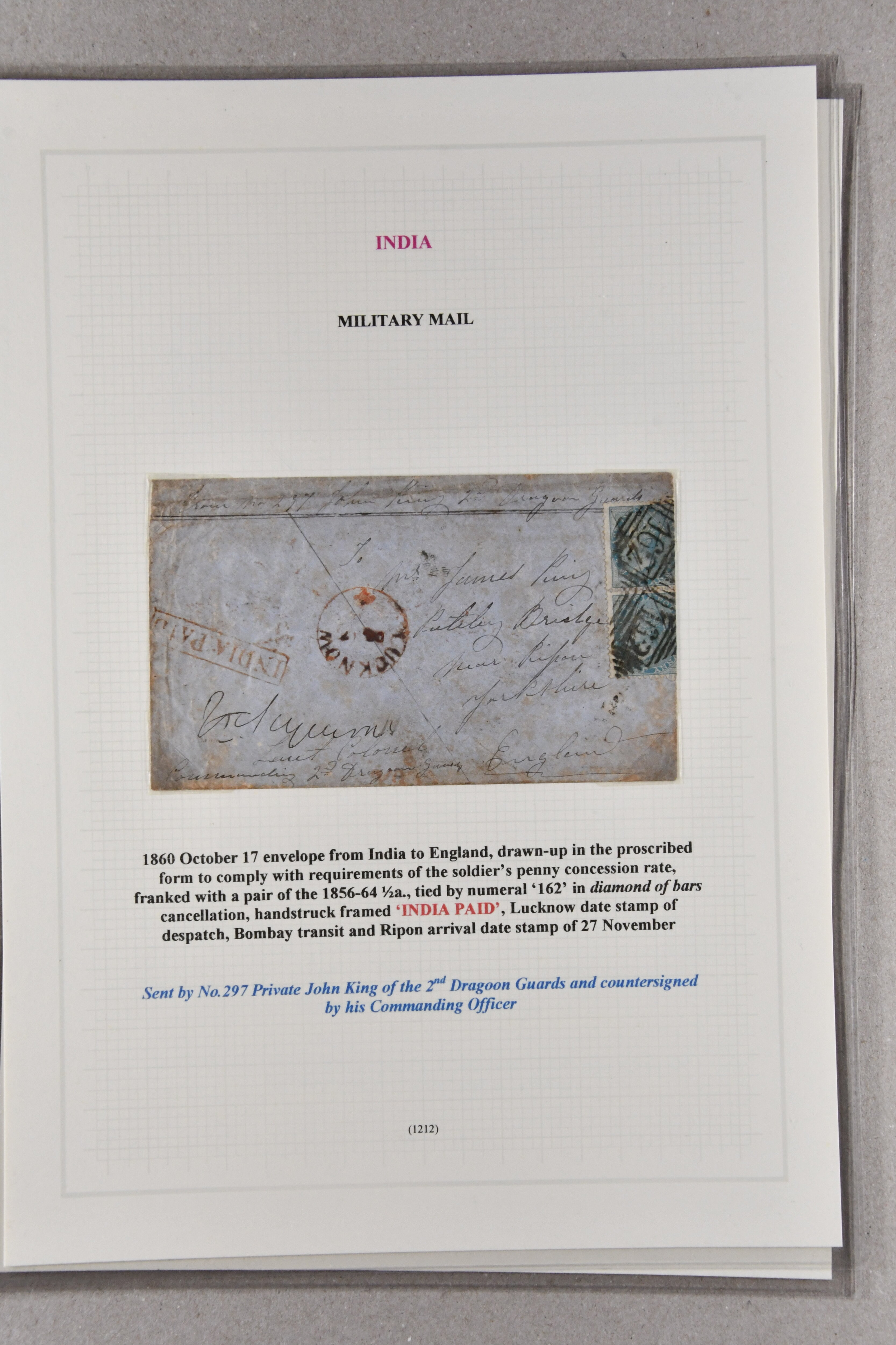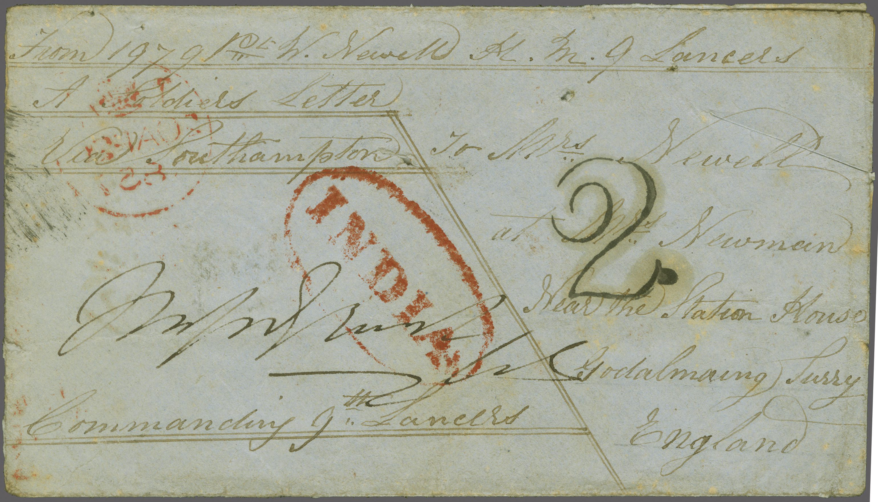 1857 (March 10): Soldier's concessionary rate cover to Godalming, Surrey correctly endorsed "From 1979 Pte. W. Newell, H.M. 9th Lancers; a Soldiers Letter, via Southampton" and countersigned by Commanding Officer of the 9th at