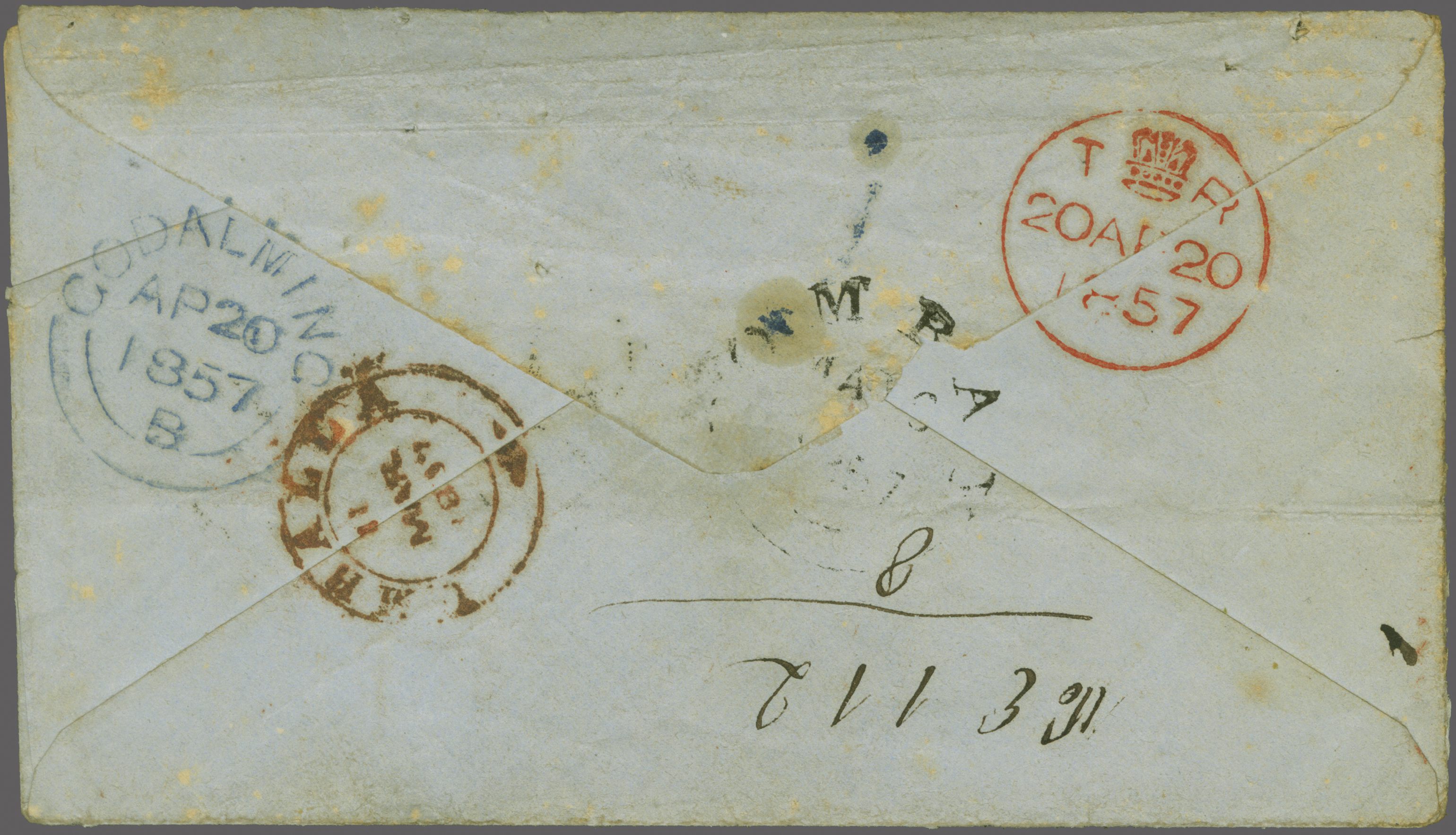 1854/55: 4 a. blue & red, Head Die IIIA, Frame Die II, a cut to shape example with head positioned up and to left, used on 22 Feb 1856 entire letter from Madras endorsed "per Str. "Bentinck" via Galle" to Captain C.W. Huet