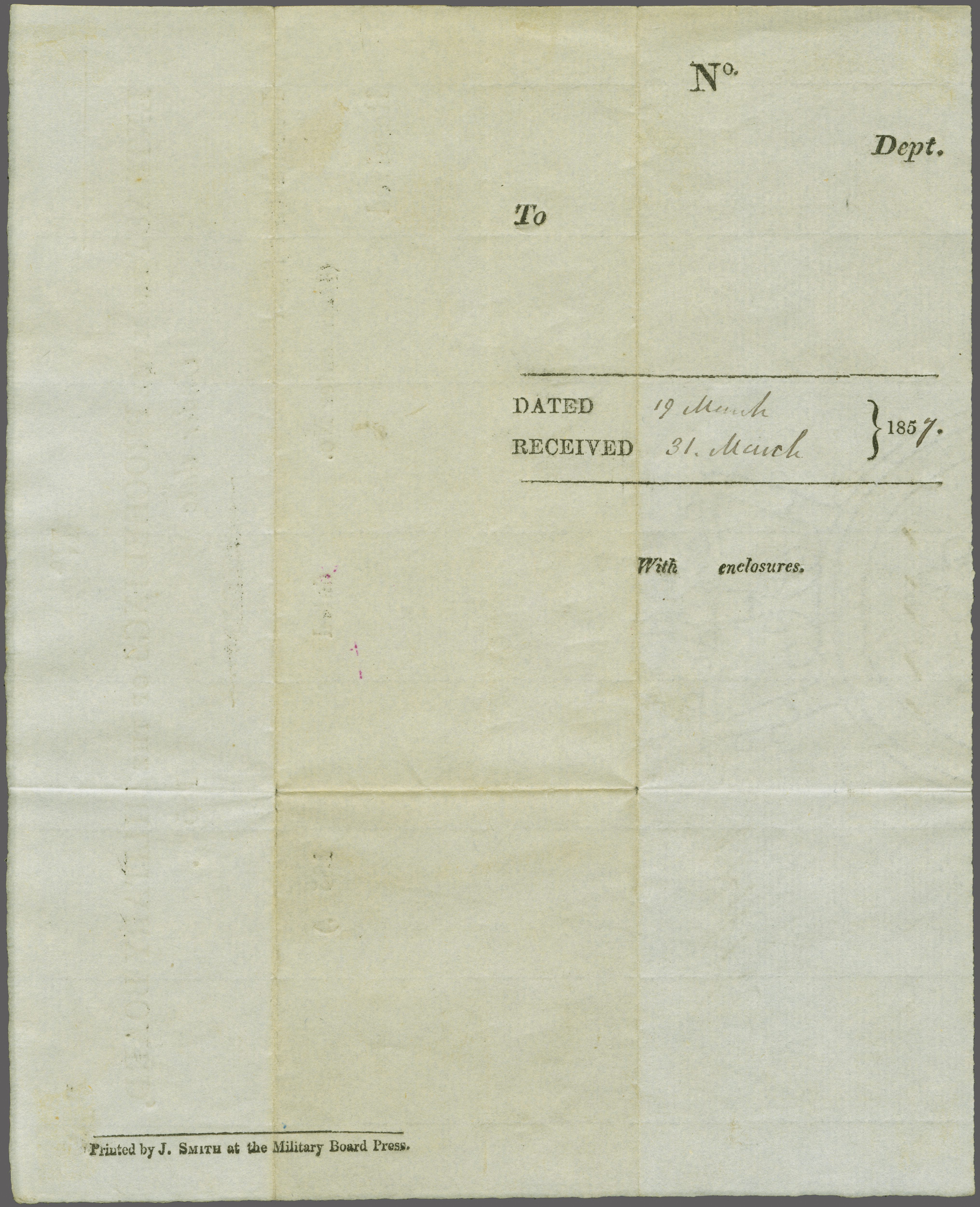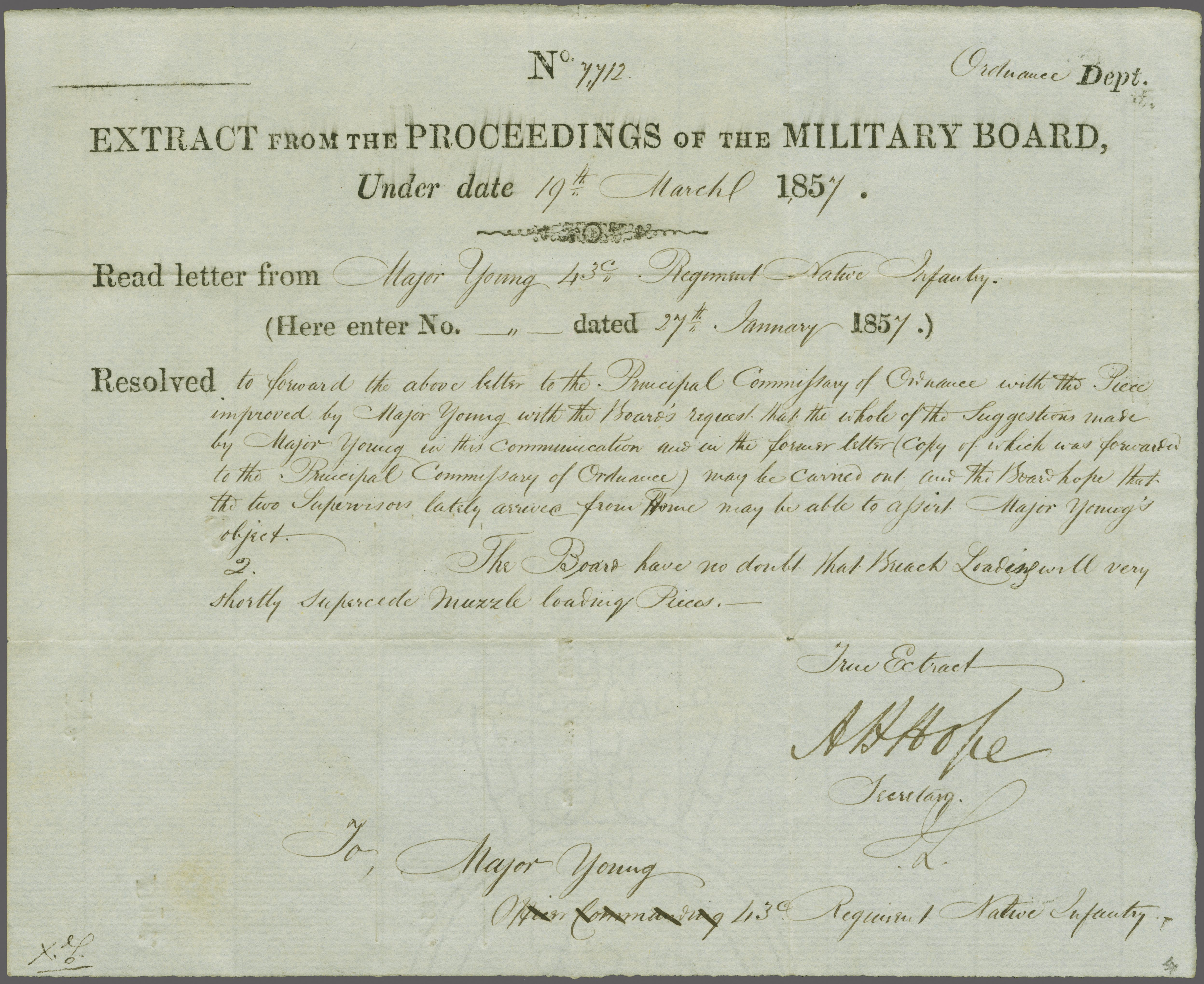 Indian Mutiny 1857 (March 19): Extract from the Ordnance Dept., "Proceedings of the Military Board", printed form with recommendation by one Major Young of the 43rd. Regiment of the Native Infantry, stating "The Board have no