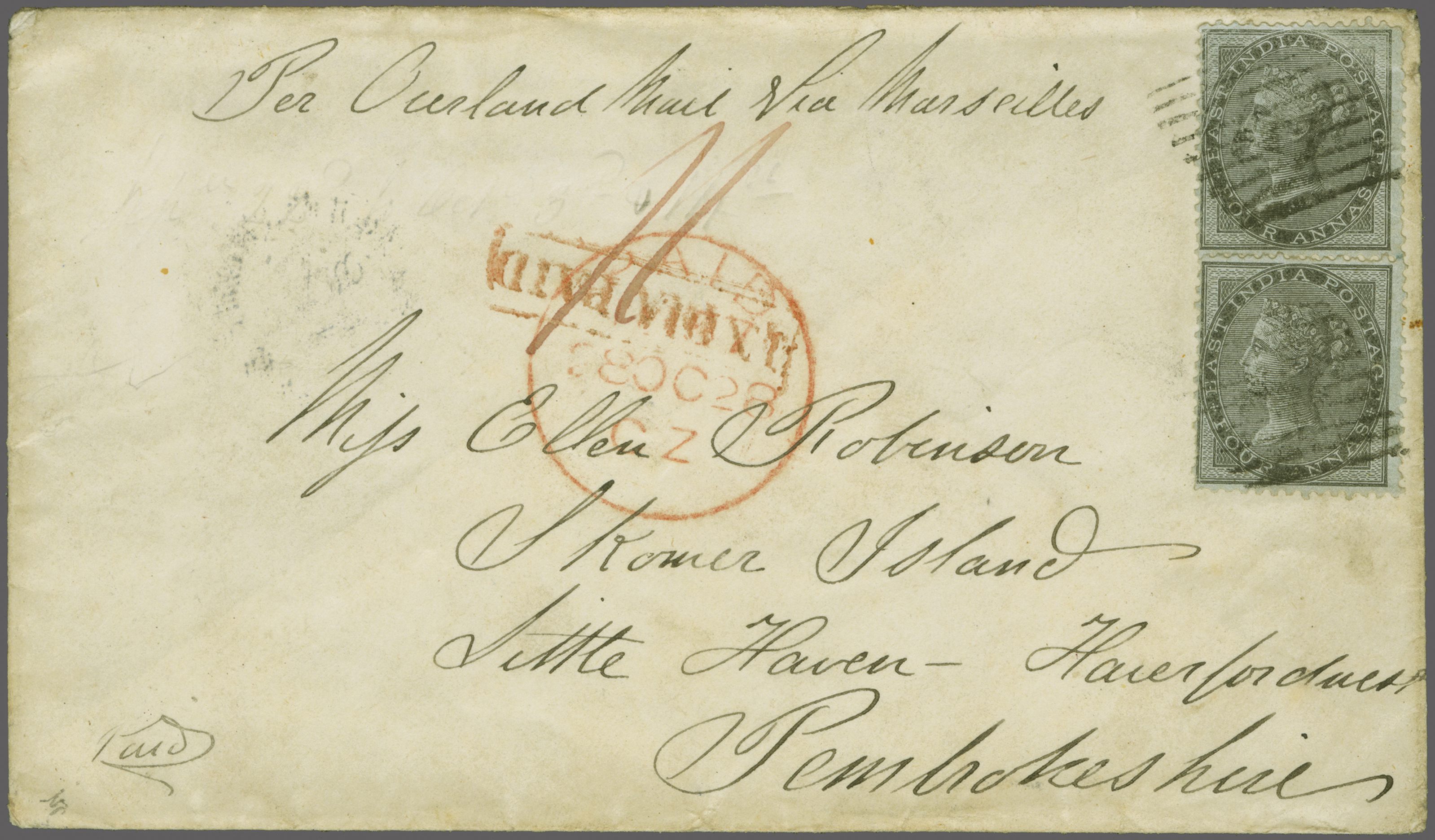 1855: 4 a. black on blue glazed paper, a vertical pair used on 1857 cover to Skomer Island, Pembrokeshire, Wales endorsed "Per Overland Mail via Marseilles" tied by barred '1' numerals, reverse with Bombay despatch cds (Oct 3)