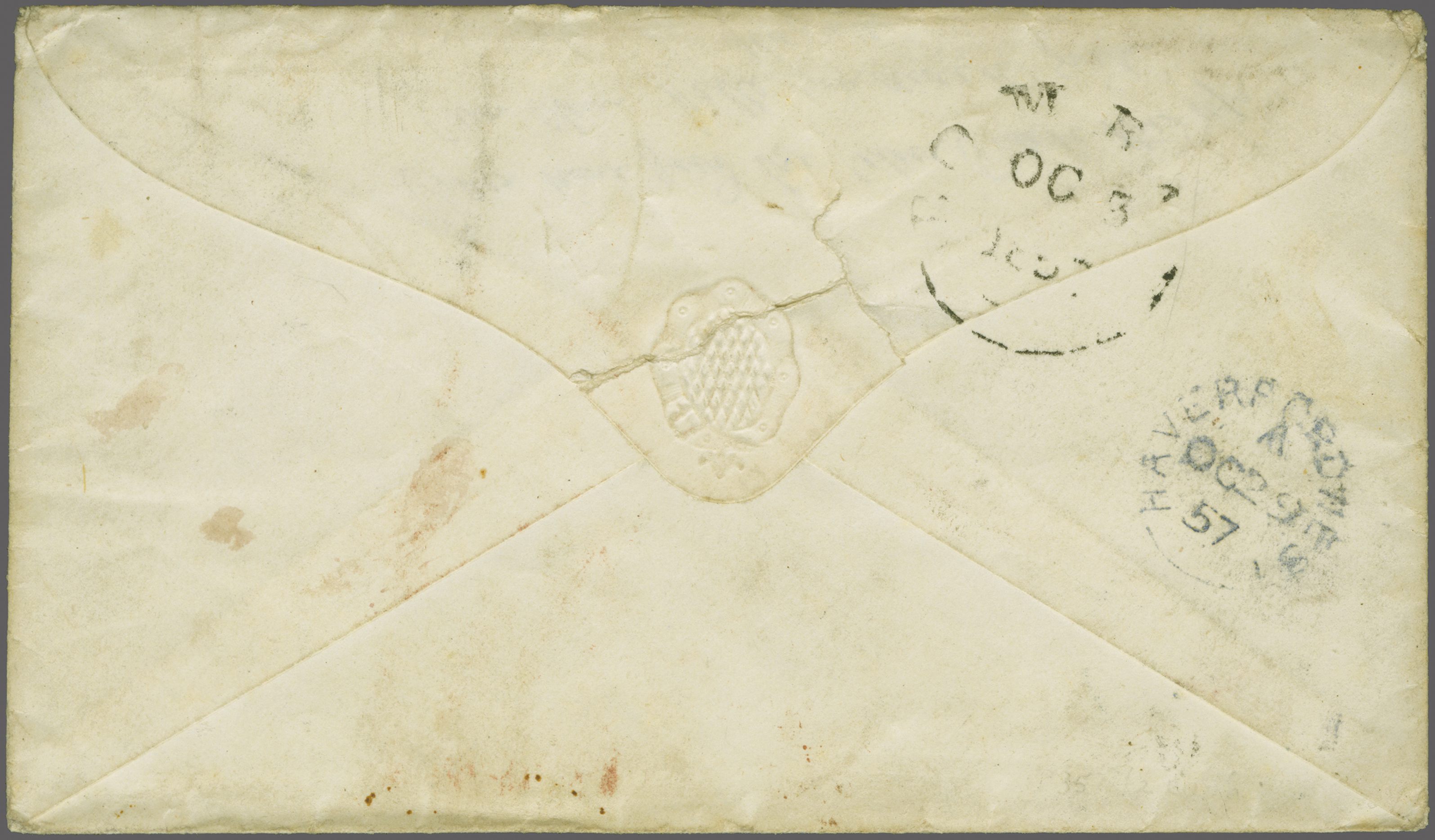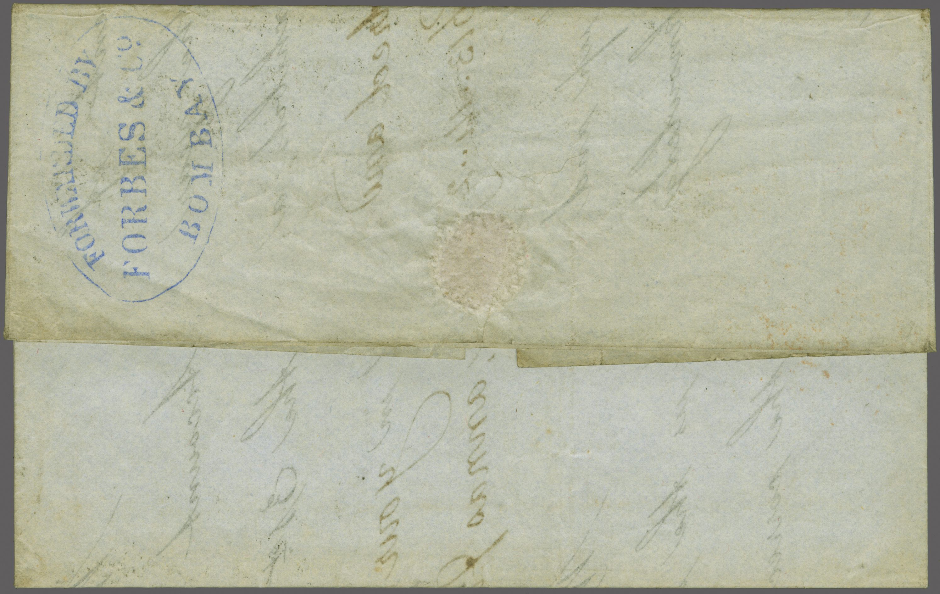 arrrival cds in red at left (Aug 7). Reverse with oval framed "Forwarded By / Forbes & Co. / Bombay" cachet in blue. A most attractive entire (Image