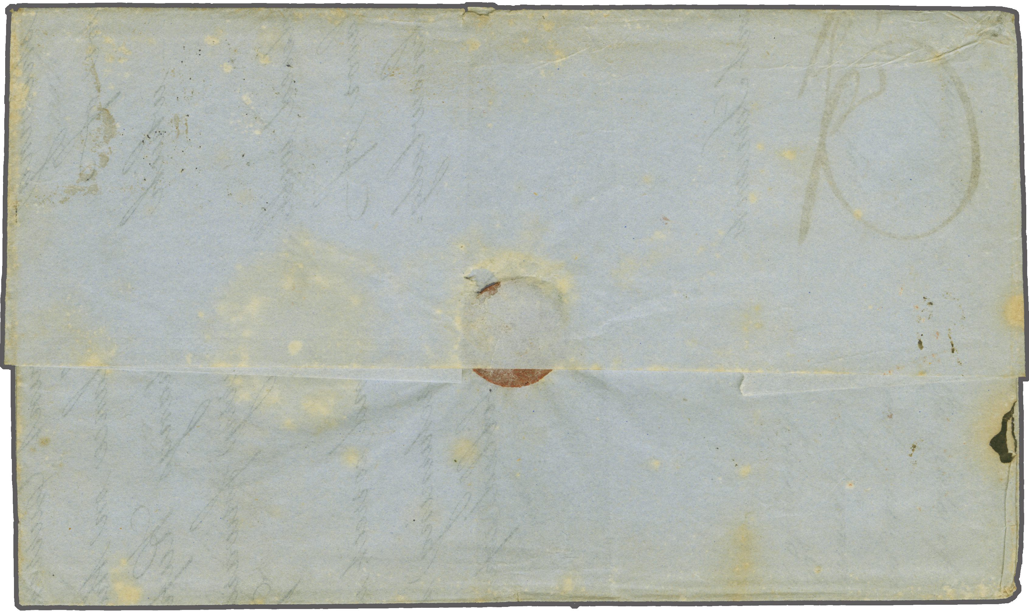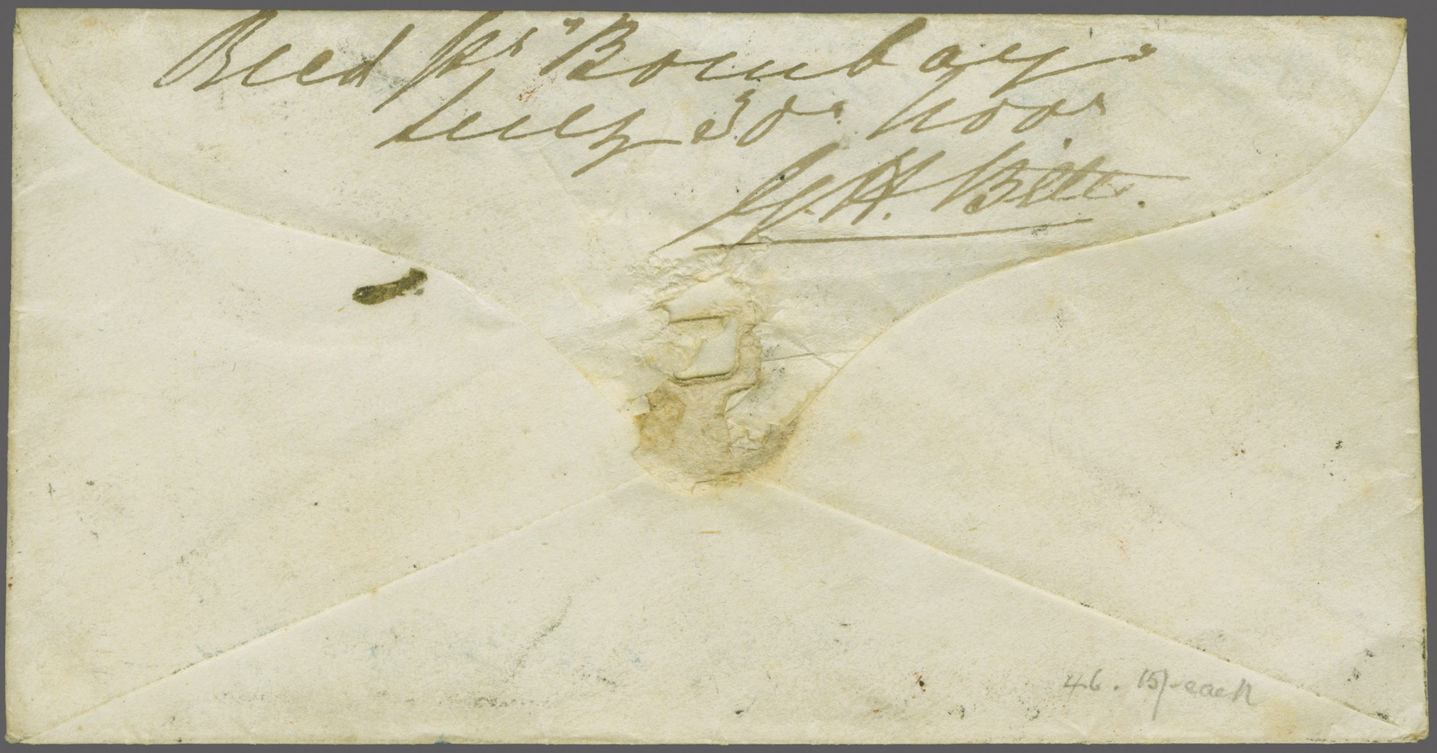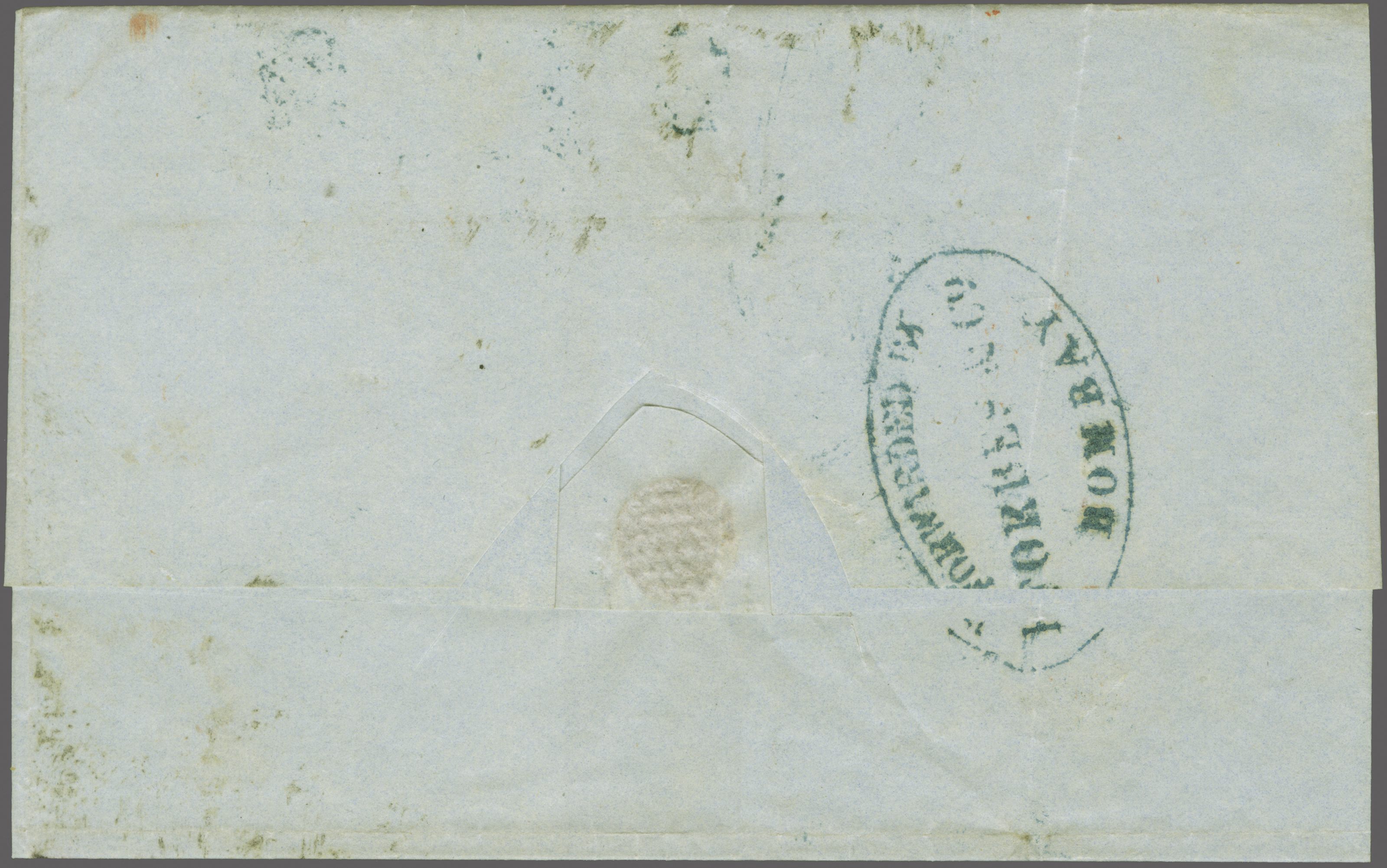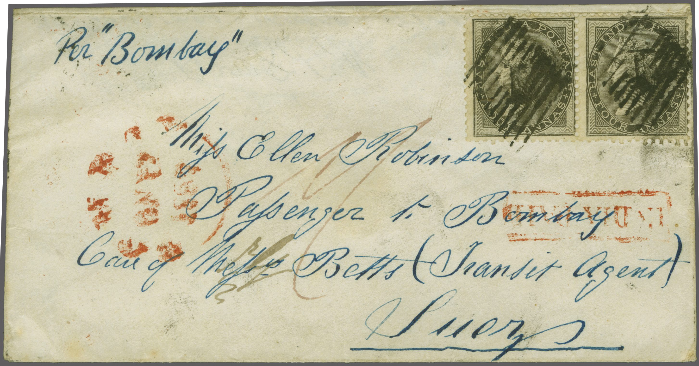 black. Bombay despatch cds and framed INDIA PAID in red below; inside the flap of the envelope a notation "If Miss Robinson has passed Suez, please return the enclosure" and, on the flap "Rec'd per "Bombay", Suez, 30th Nov." and signed G.H. Betts. A