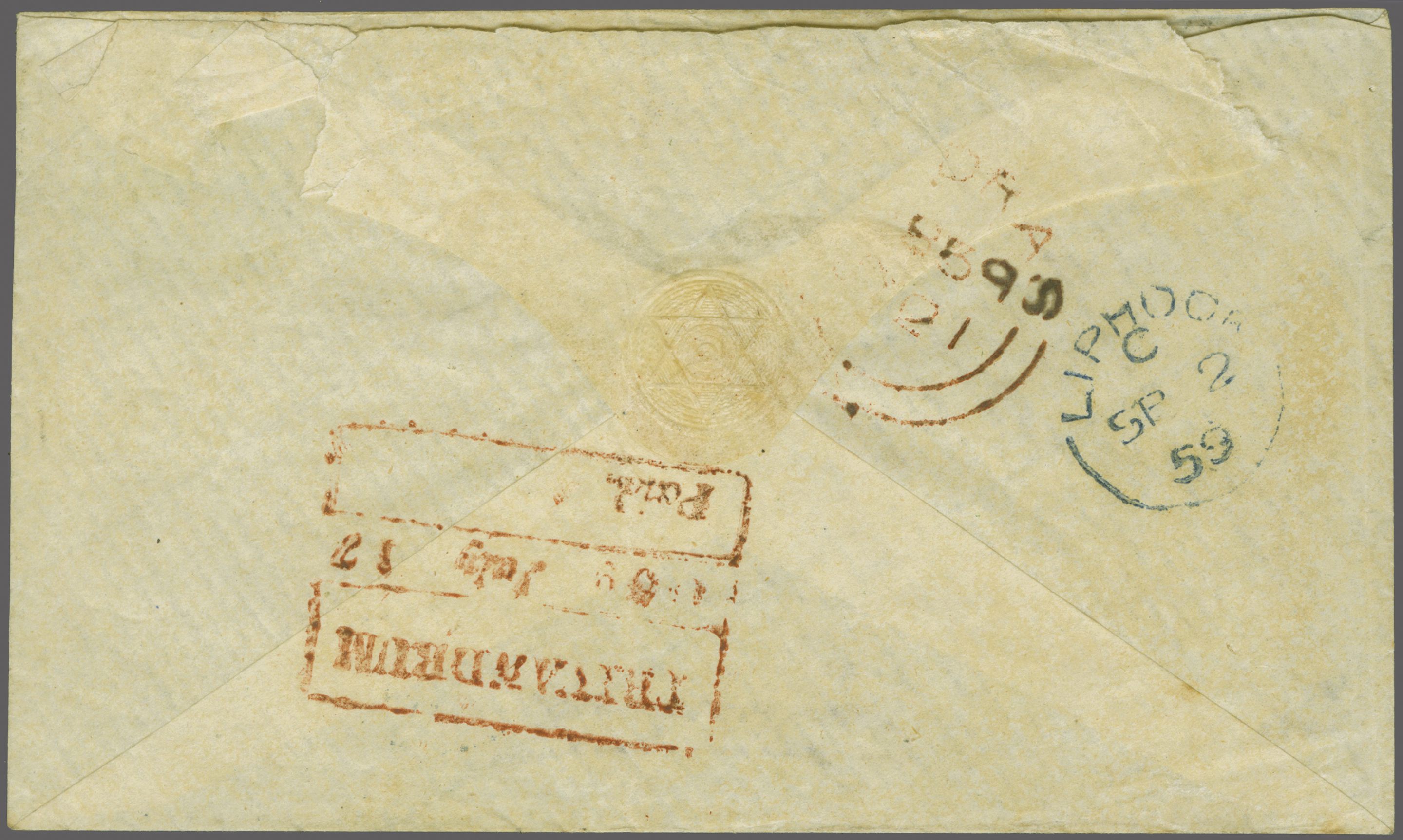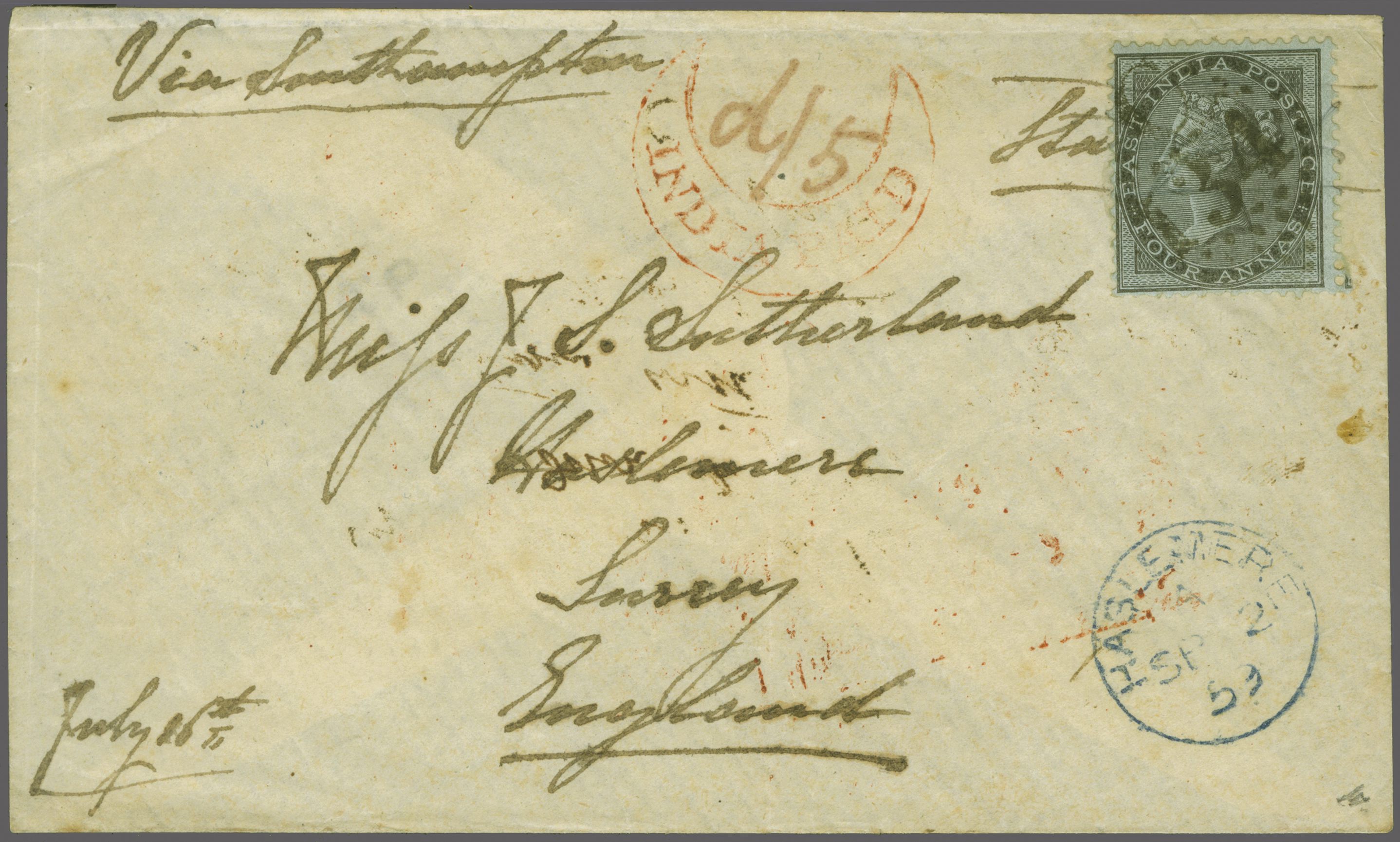 1855: 4 a. black on blue glazed paper, a single example used on 1859 cover from Trivandrum to Haslemere, Surrey tied by dotted "134" numeral in black, curved "INDIA PAID" adjacent. Reverse with corresponding framed "TRIVANDRUM