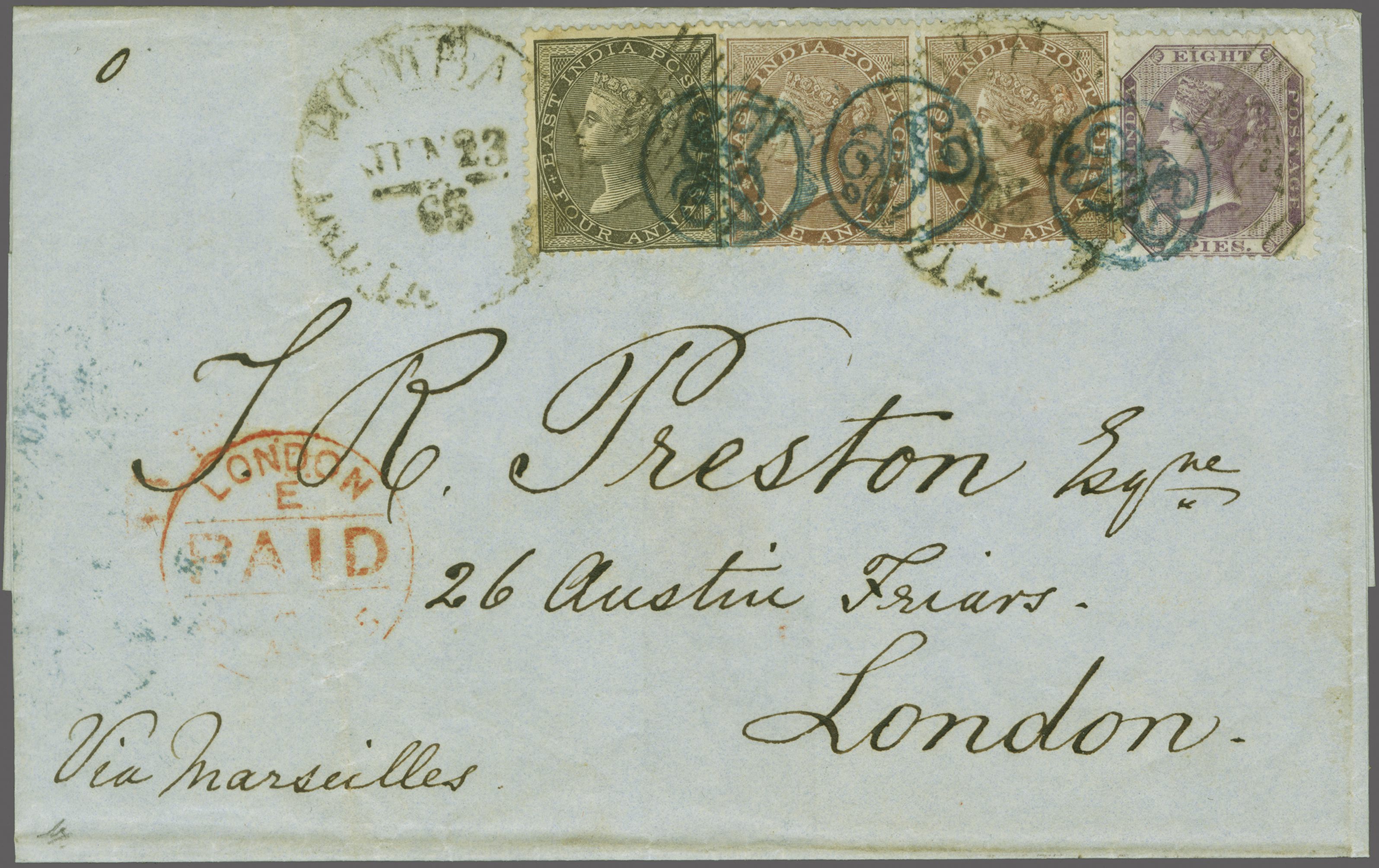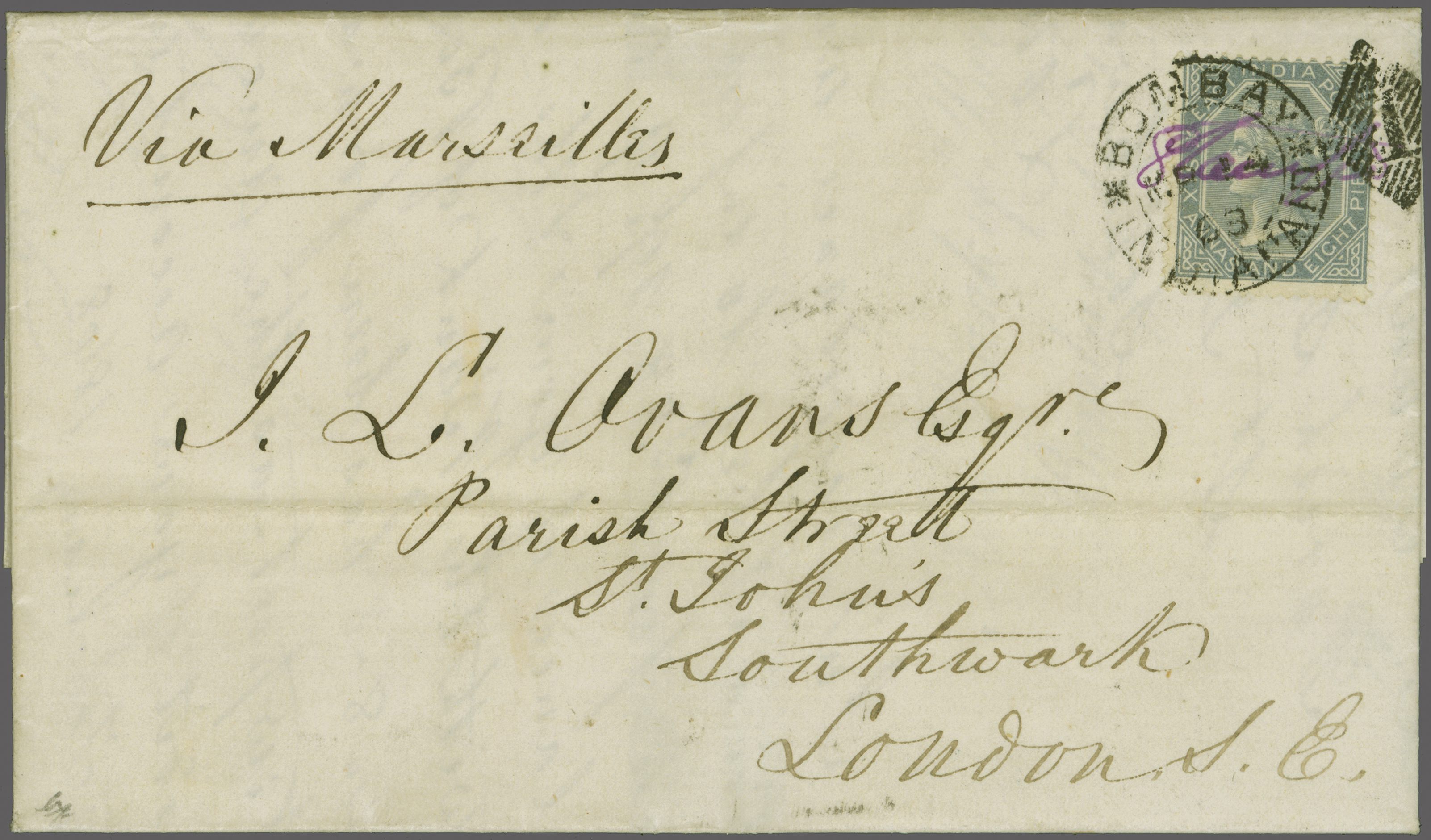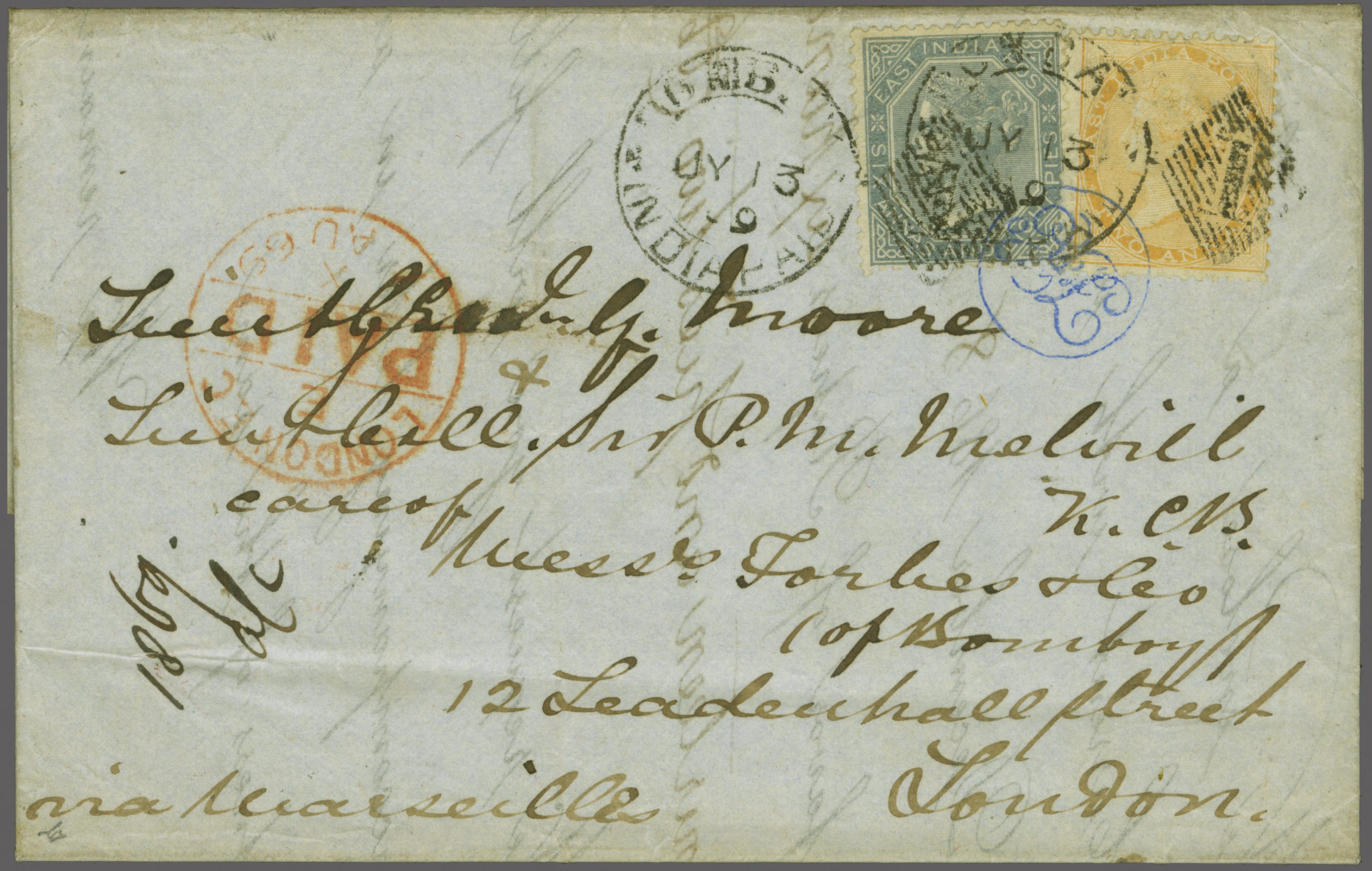1867: 6 a. 8 p. grey and 1865 2 a. pale orange, used on 1869 entire letter to London (care of Forbes & Co. of Bombay) endorsed "via Marseilles" tied by "Bombay India Paid / 1" duplex (July 13) in black. 'London / Paid'