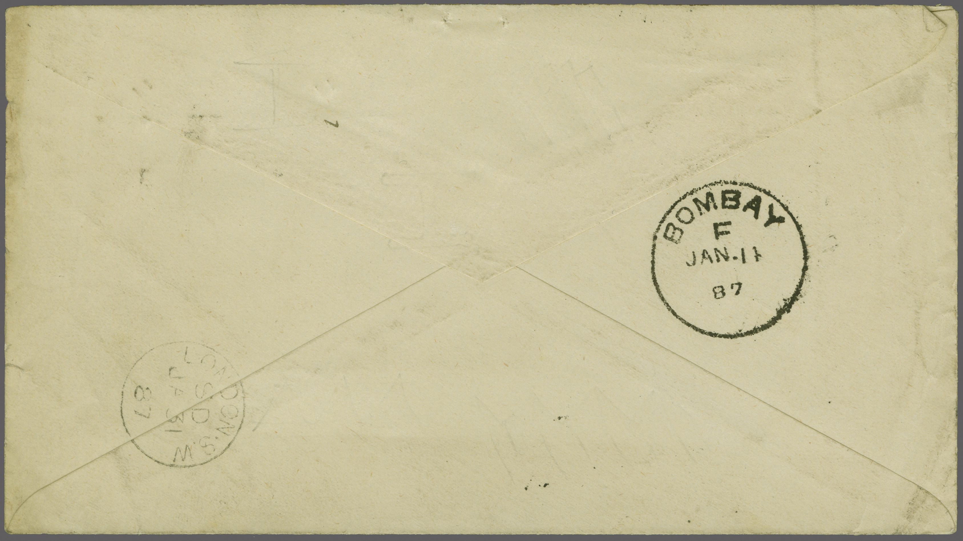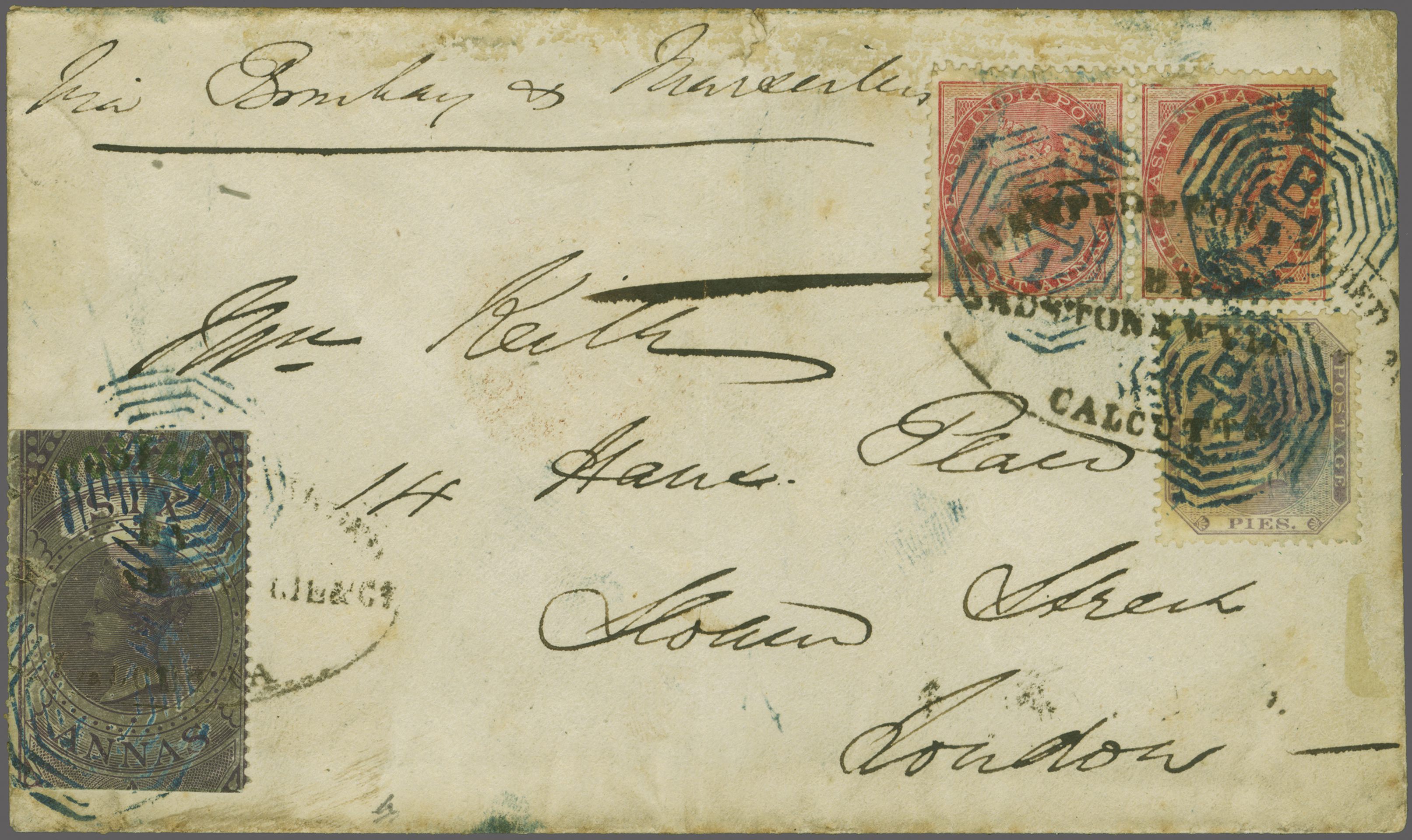 blue and further tied by "Forwarded by / Gladstone Wilson & Co. / Calcutta" cachets in black. Reverse with "Calcutta / India Paid" cds in red (Oct 20) and London arrival cds (Nov 22) in black. Light soiling and the 6 anna typically dulled but
