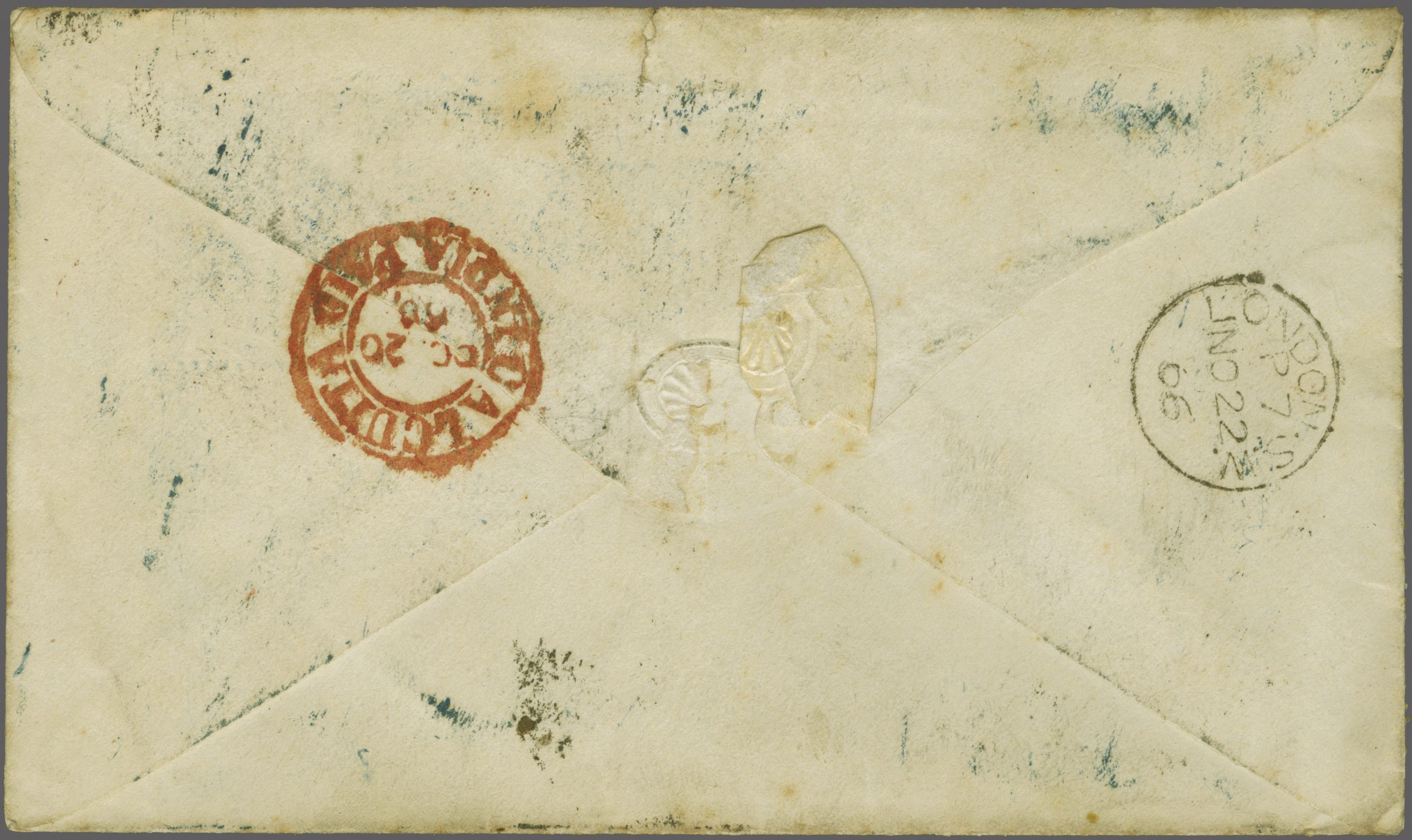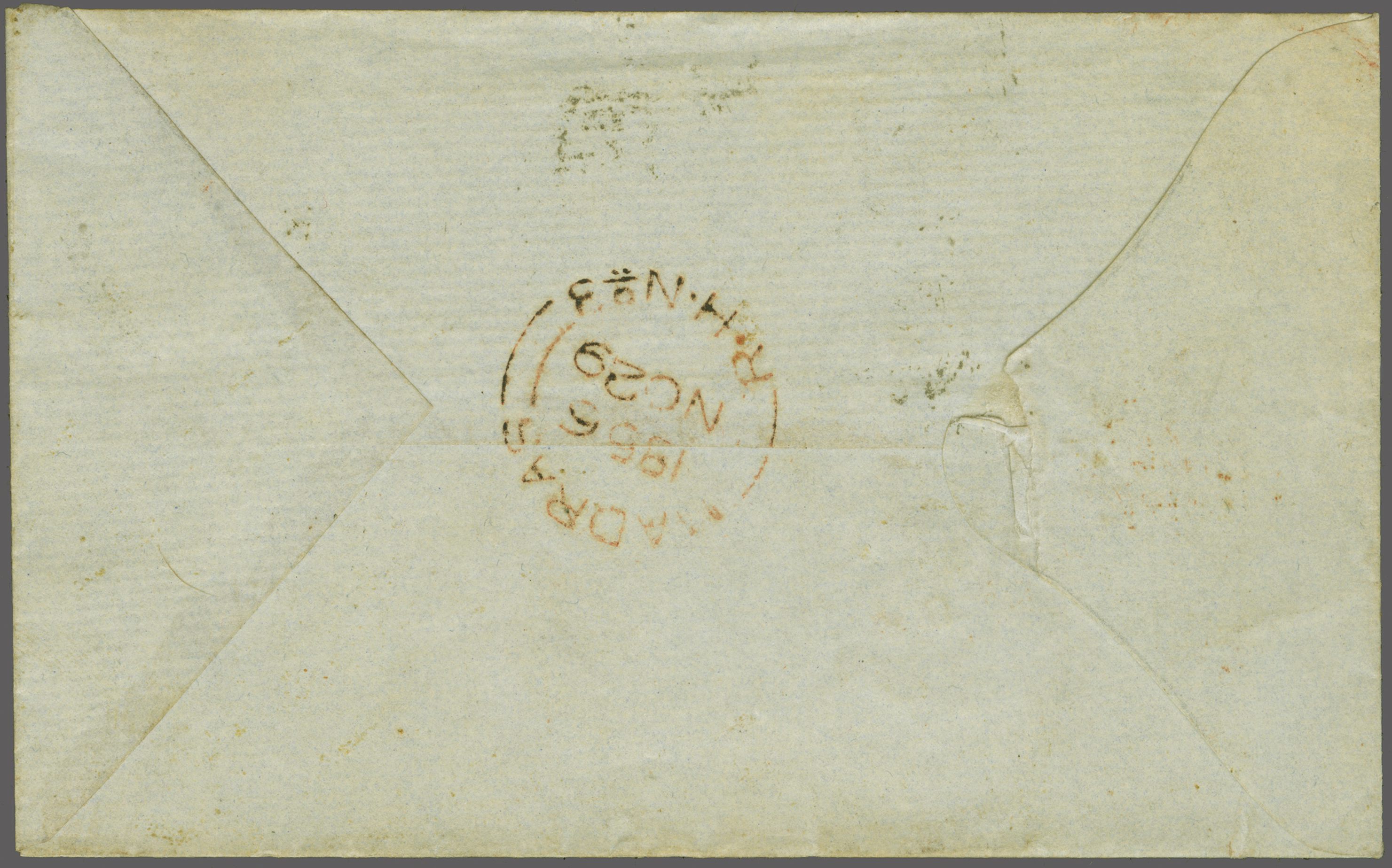 manuscript), framed "TOO LATE" at top in black. Reverse with "MADRAS / R.H. No. 3" cds in red (Nov 29). No postal markings were introduced into Labuan until at least 1864. An outstanding cover of great rarity to an extraordinary destination. Note:
