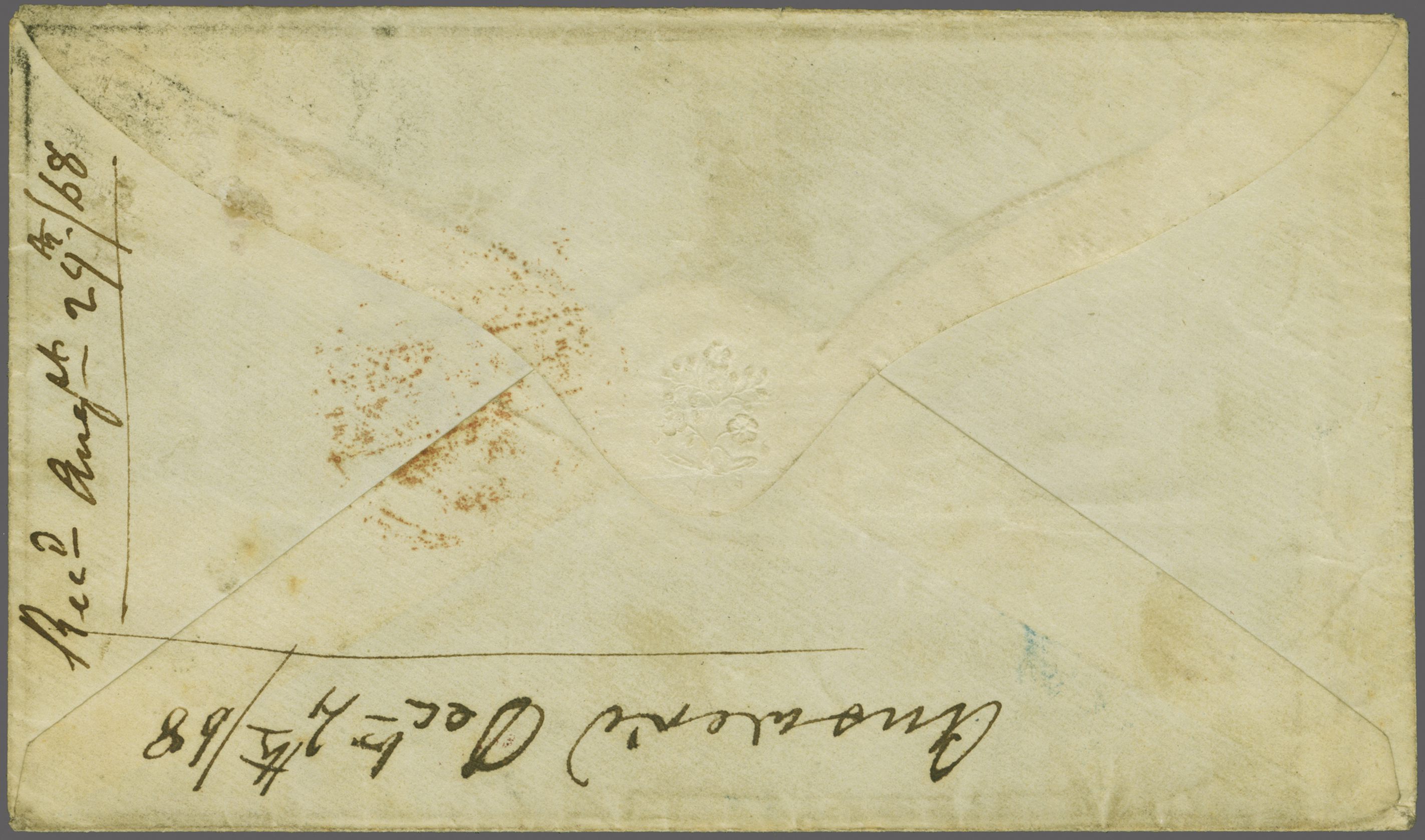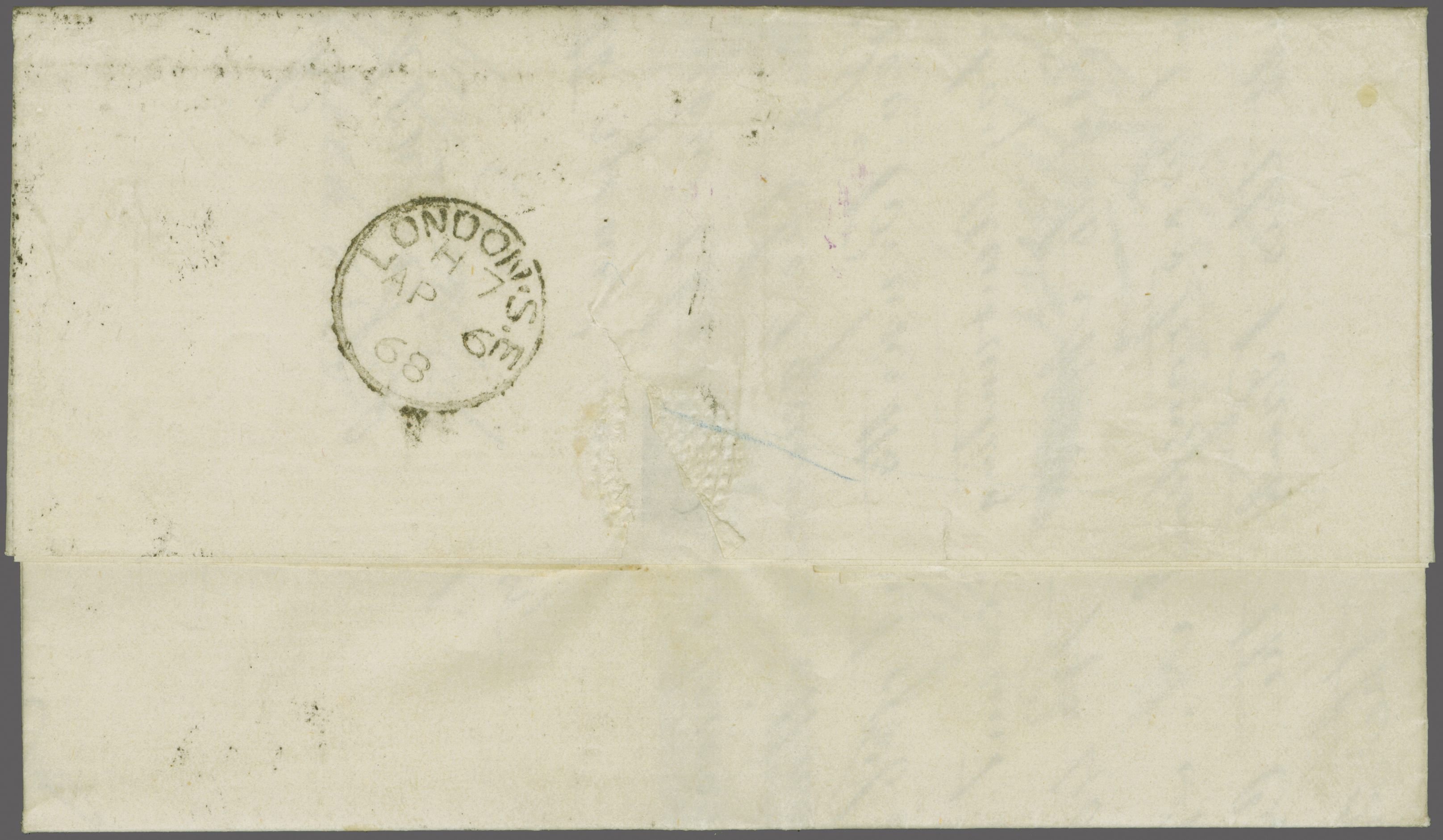 1867: 6 a. 8 p. grey, a single example used on 1868 entire letter to London endorsed "via Marseilles" tied by security signature in violet ink and by "Bombay / 1" duplex (March 14) in black. London arrival cds (April 6) on