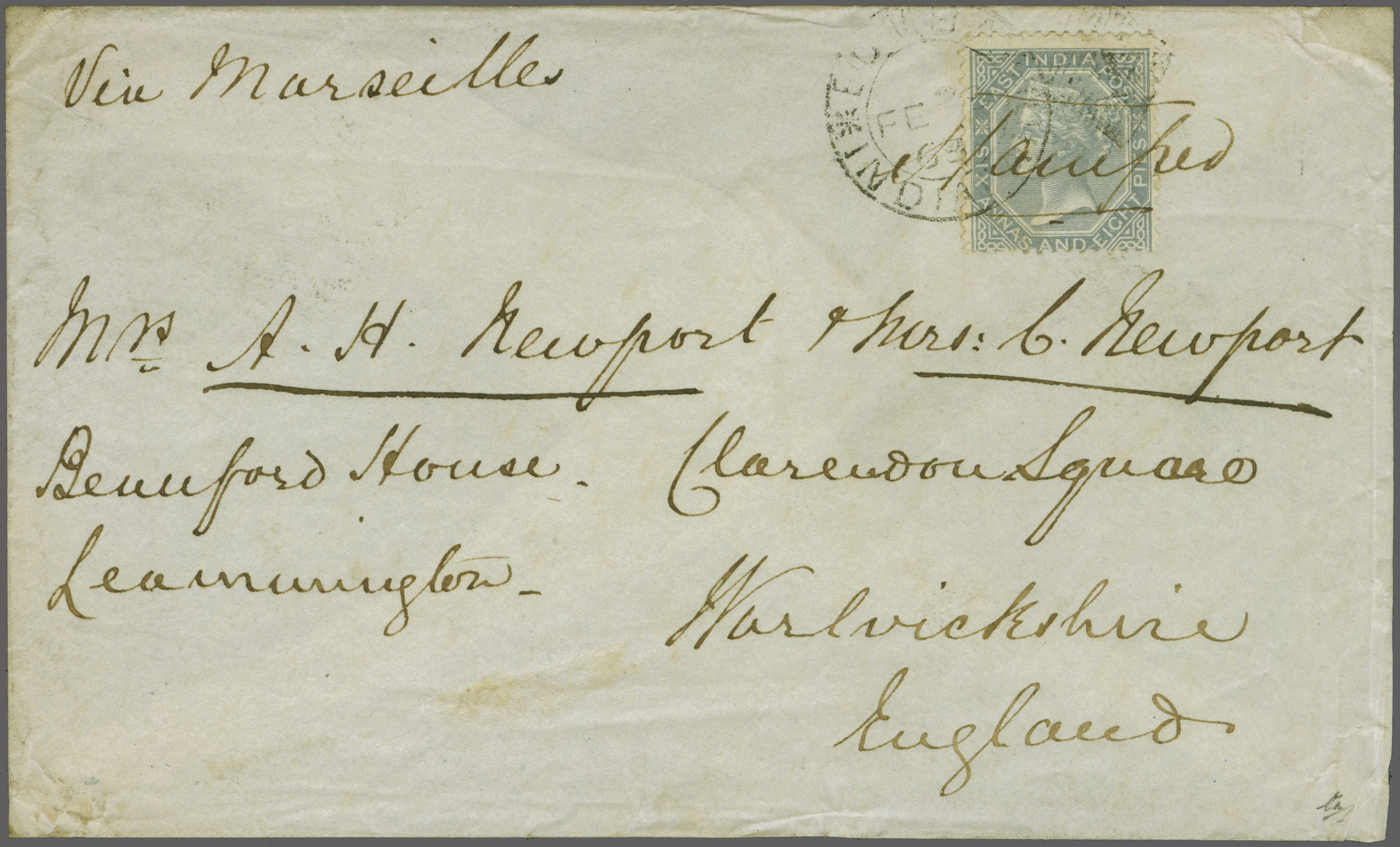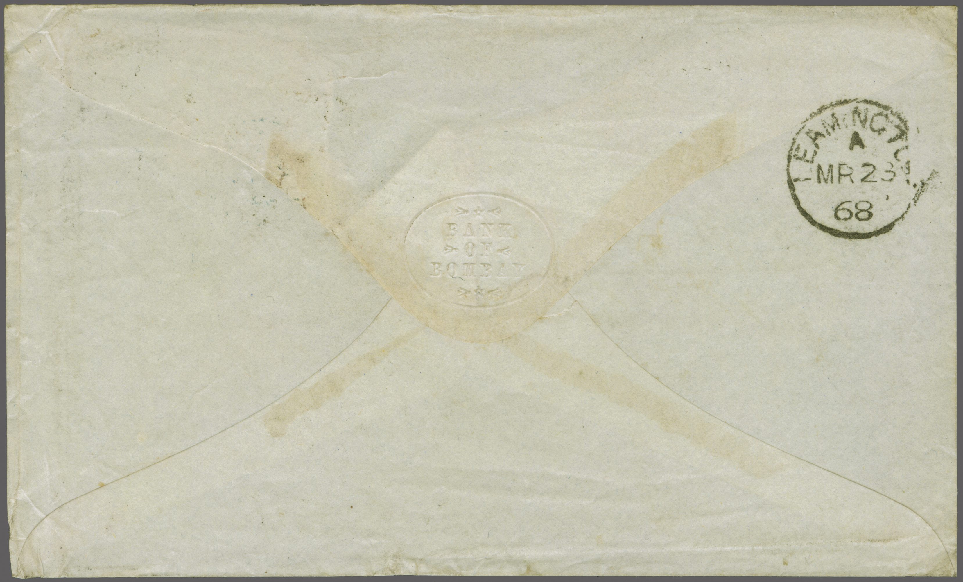 1867: 6 a. 8 p. grey, a single example used on 1868 entire letter to Leamington endorsed "via Marseilles" tied by security "Stamped" in manuscript and by "Bombay India Paid / 1" duplex (Feb 23) in black. Leamington arrival cds