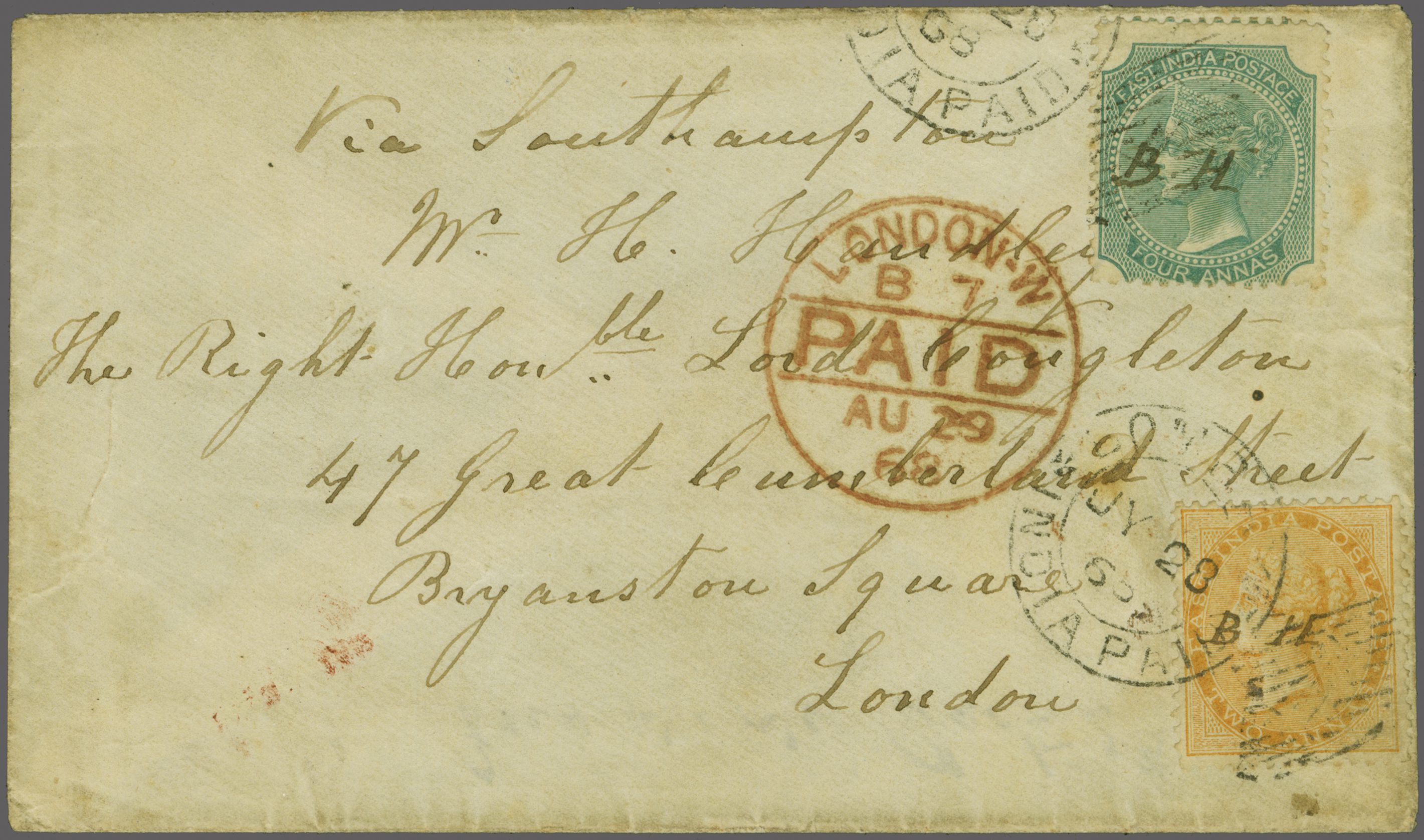 1865: 2 a. orange and 1866 4 a. green, Die I, used on 1868 cover with full contents, addressed to Lord Congleton in London endorsed "via Southampton", tied by "Bombay India Paid / 1" duplex (July 28) in black and manuscript
