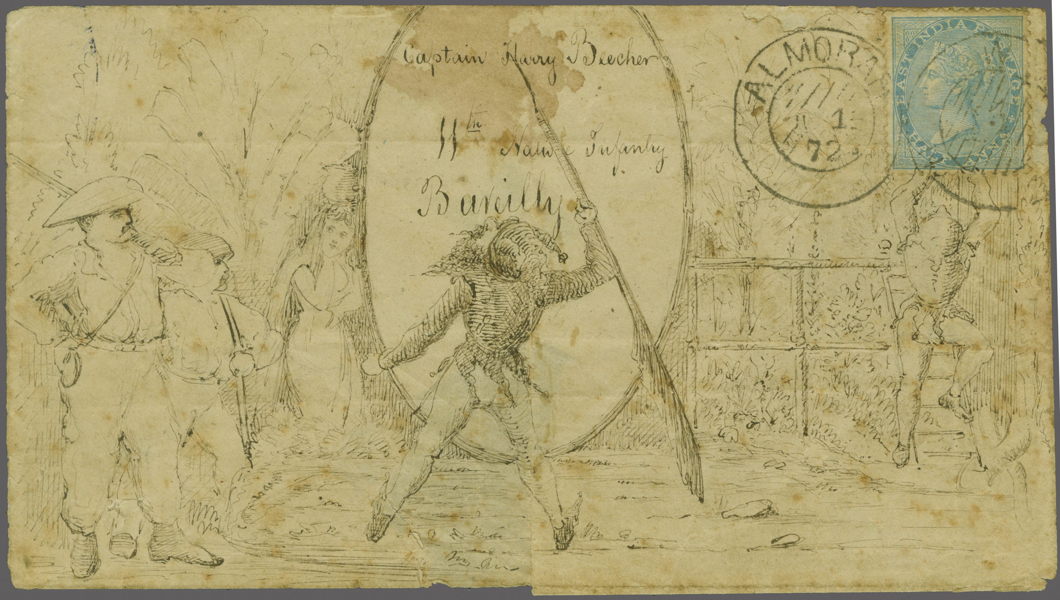1865: ½ a. pale blue, Die I, a single example used on delightfully illustrated 1872 envelope to a Captain Harry Beecher of the 11th Native Infantry in Bareilly, tied by "Almorah" duplex; stamp missing on reverse as sent