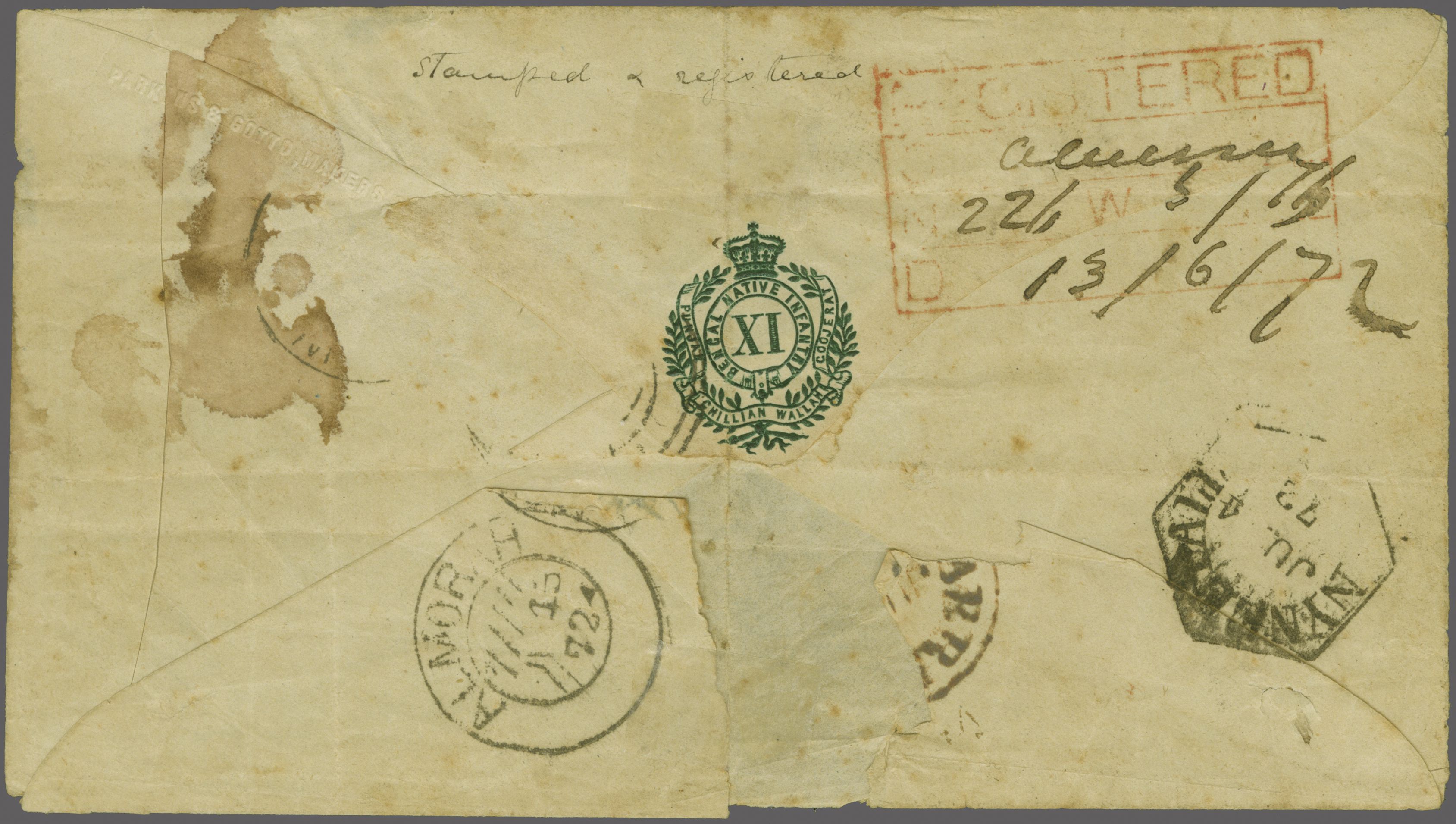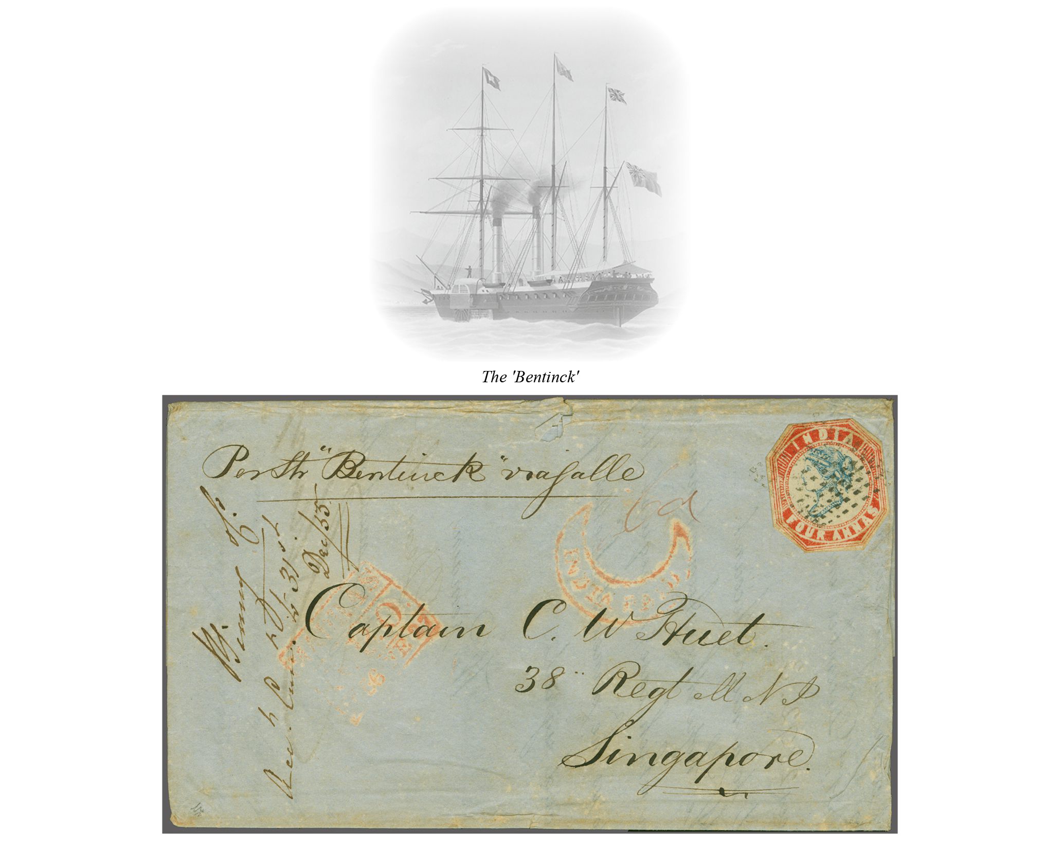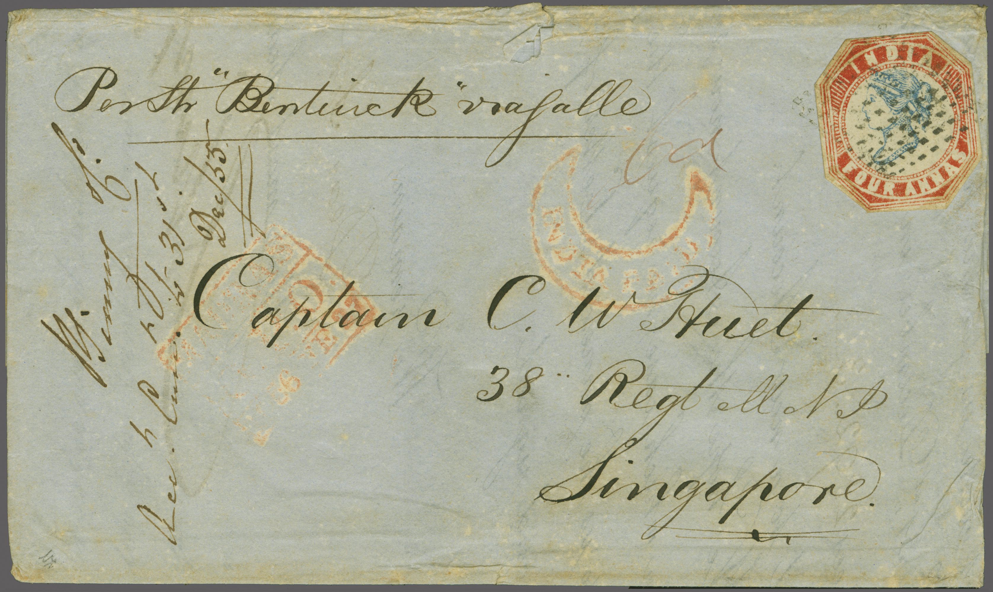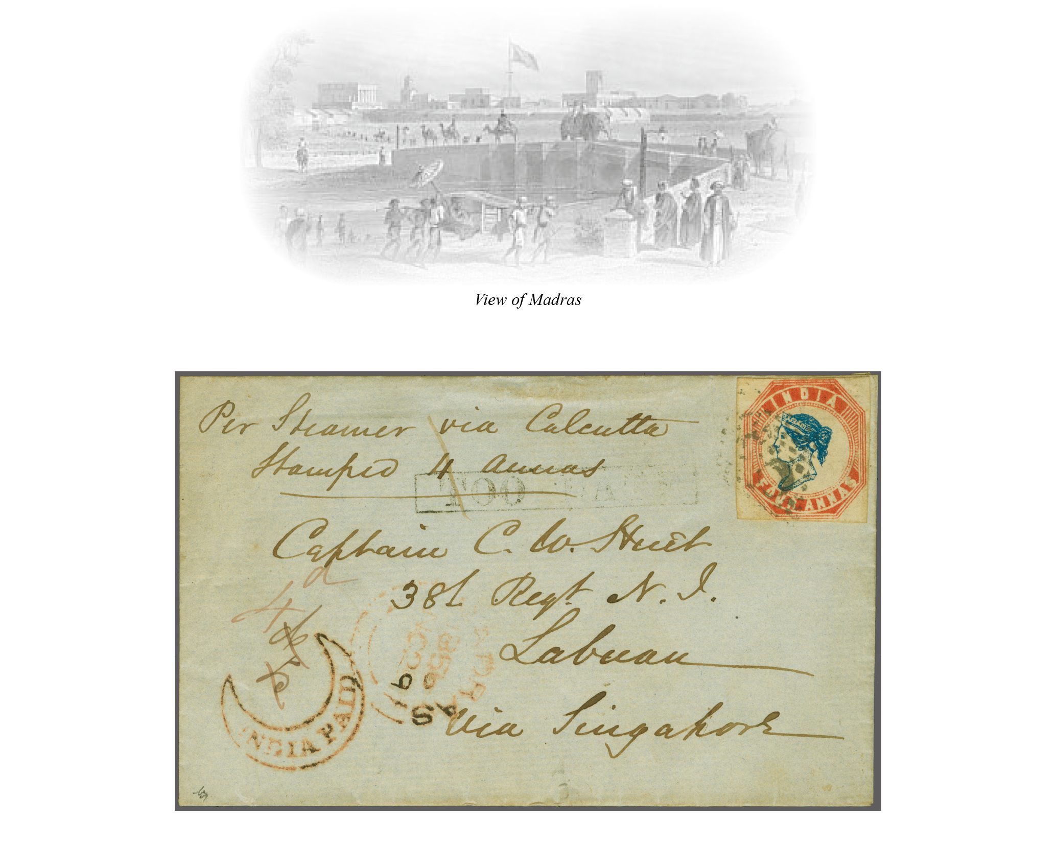 Steamer via Calcutta via Singapore, Stamped 4 annas", tied by Calcutta "C / 1" obliterator in black. MADRAS despatch cds (Nov 29) and curved "INDIA PAID" in red (with manuscript "4a." in red ink, with potential 5 and 6 a. charges crossed through in