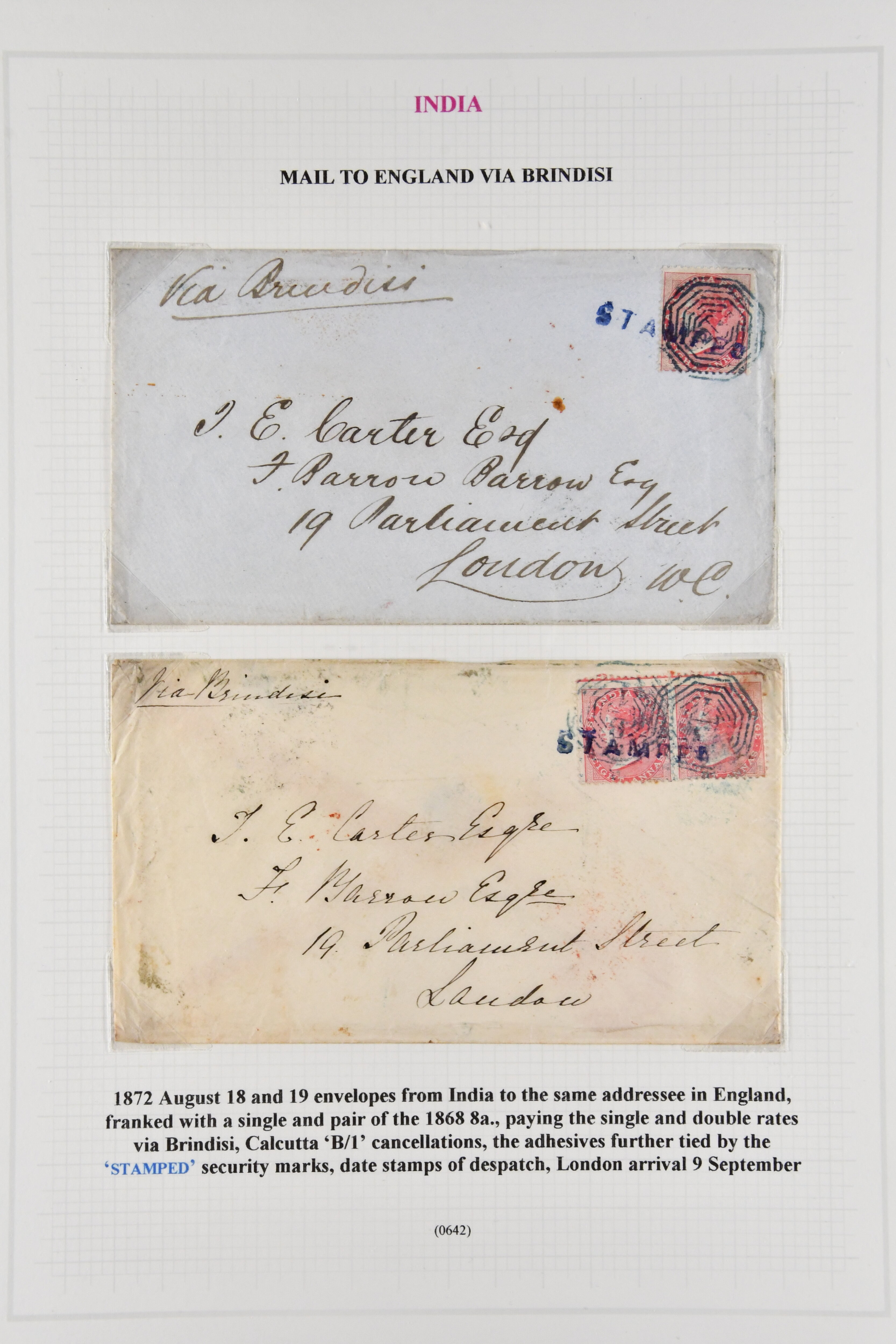 1868: 8 a. rose, Die II, with 1872 covers to London each endorsed "via Brindisi", one at single rate tied by octagonal "B/1" in blue of Calcutta, and a matching double rate 1872 cover also "via Brindisi" bearing