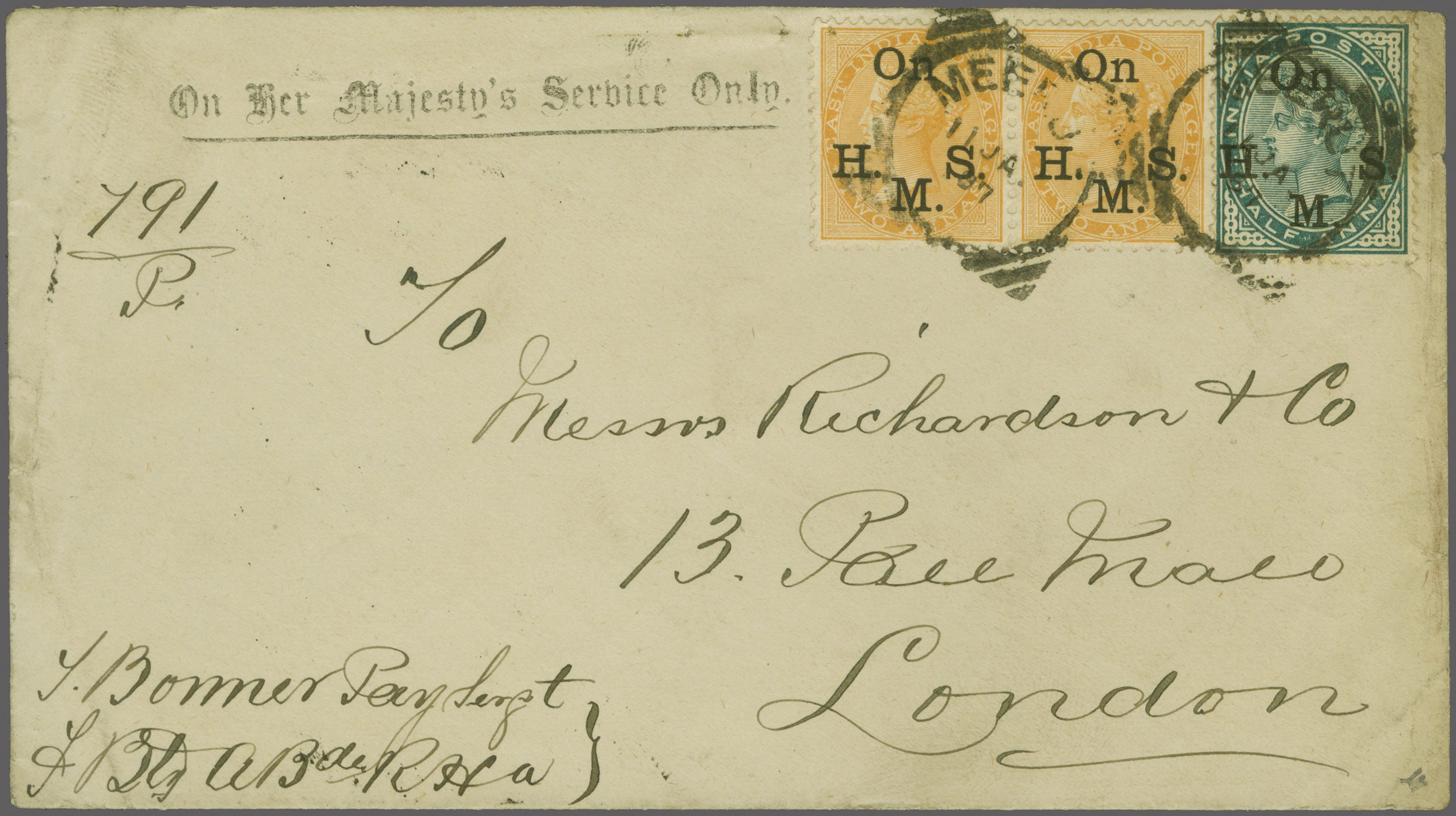 1874/82: OHMS 2 a. orange in a horizontal pair, used with 1883 ½ a. blue-green on 1887 printed OHMS cover to Messrs. Richardson & Co. the Army Agents in London, tied by "MEERUT" squared circle datestamps (Jan 11) in black.