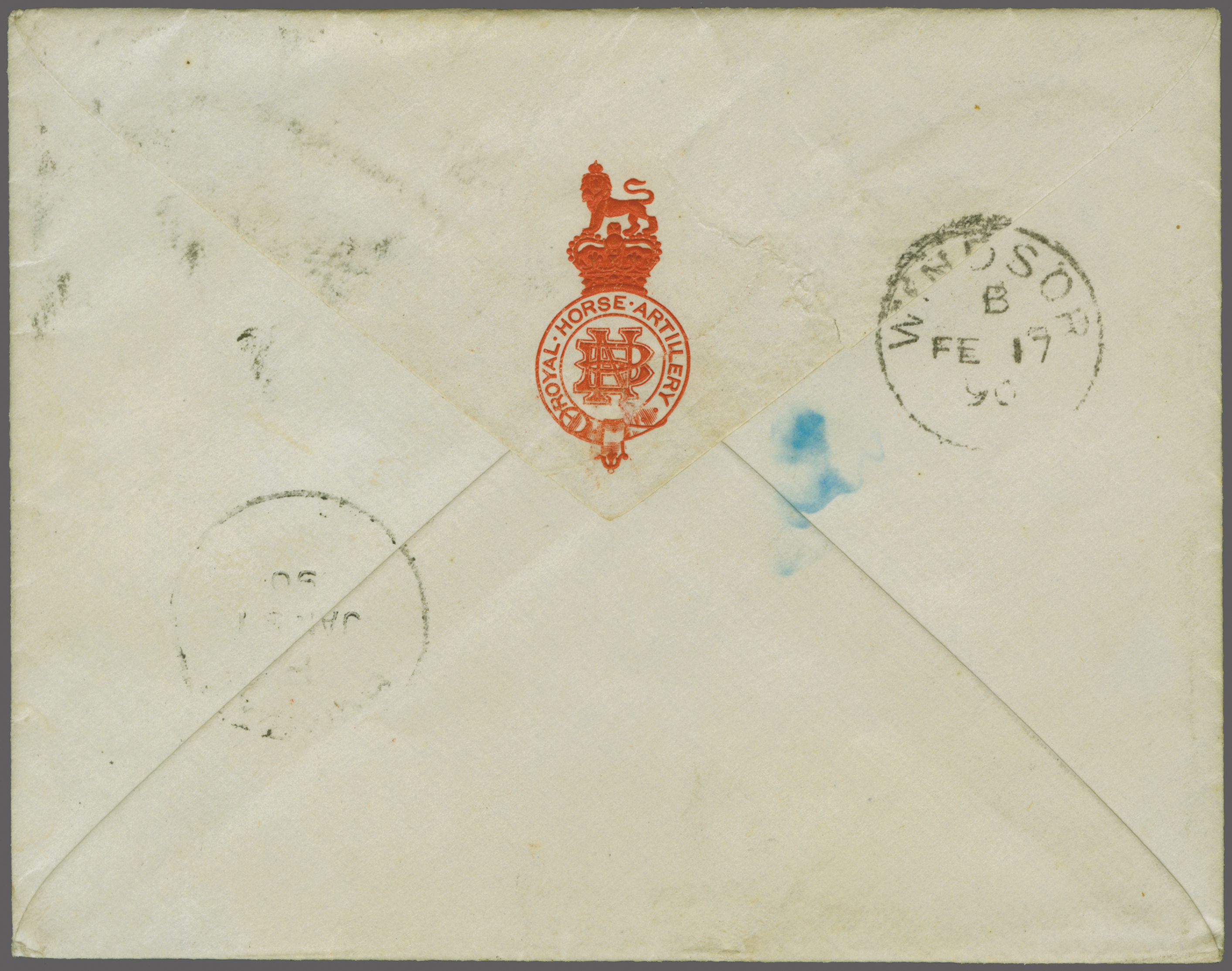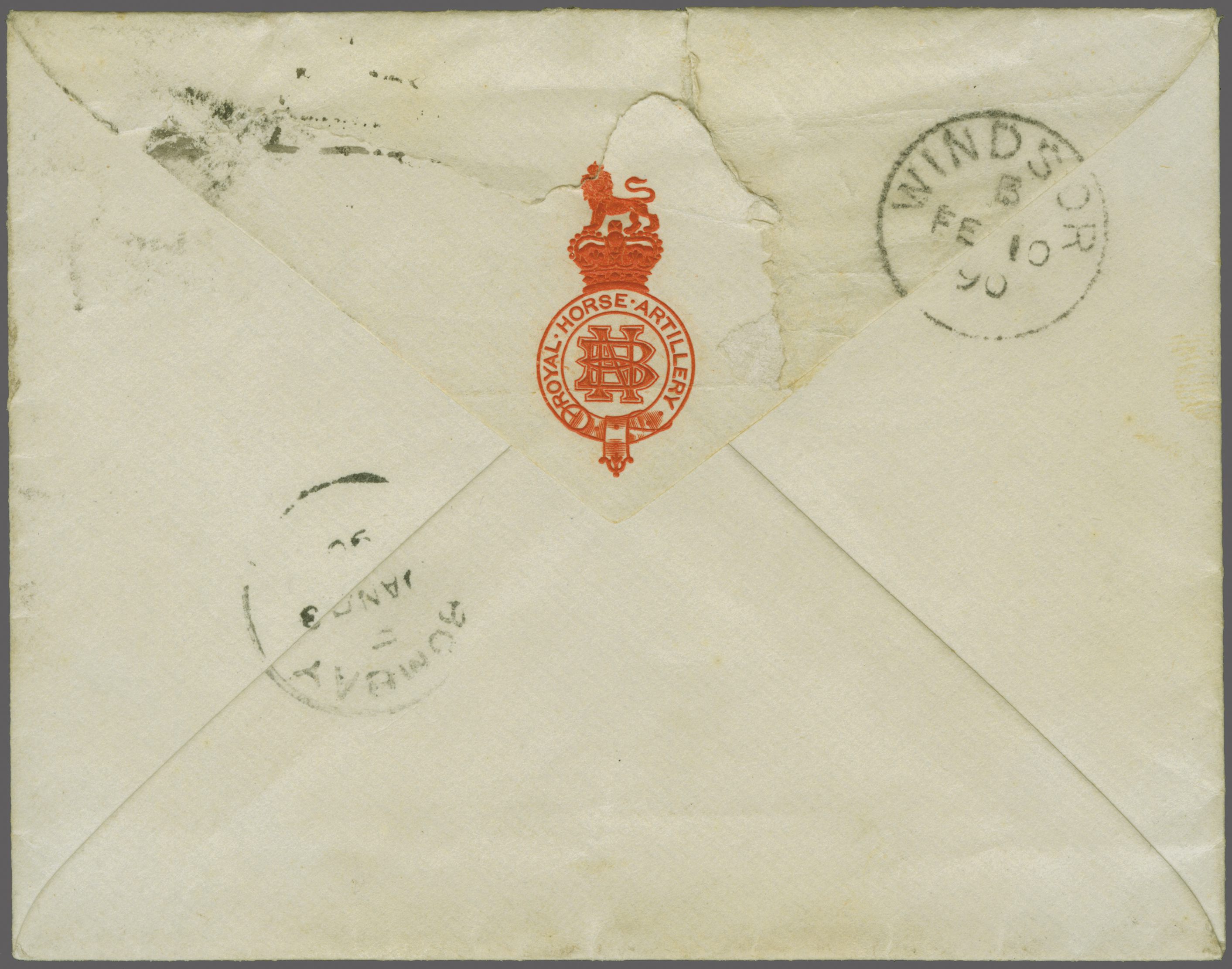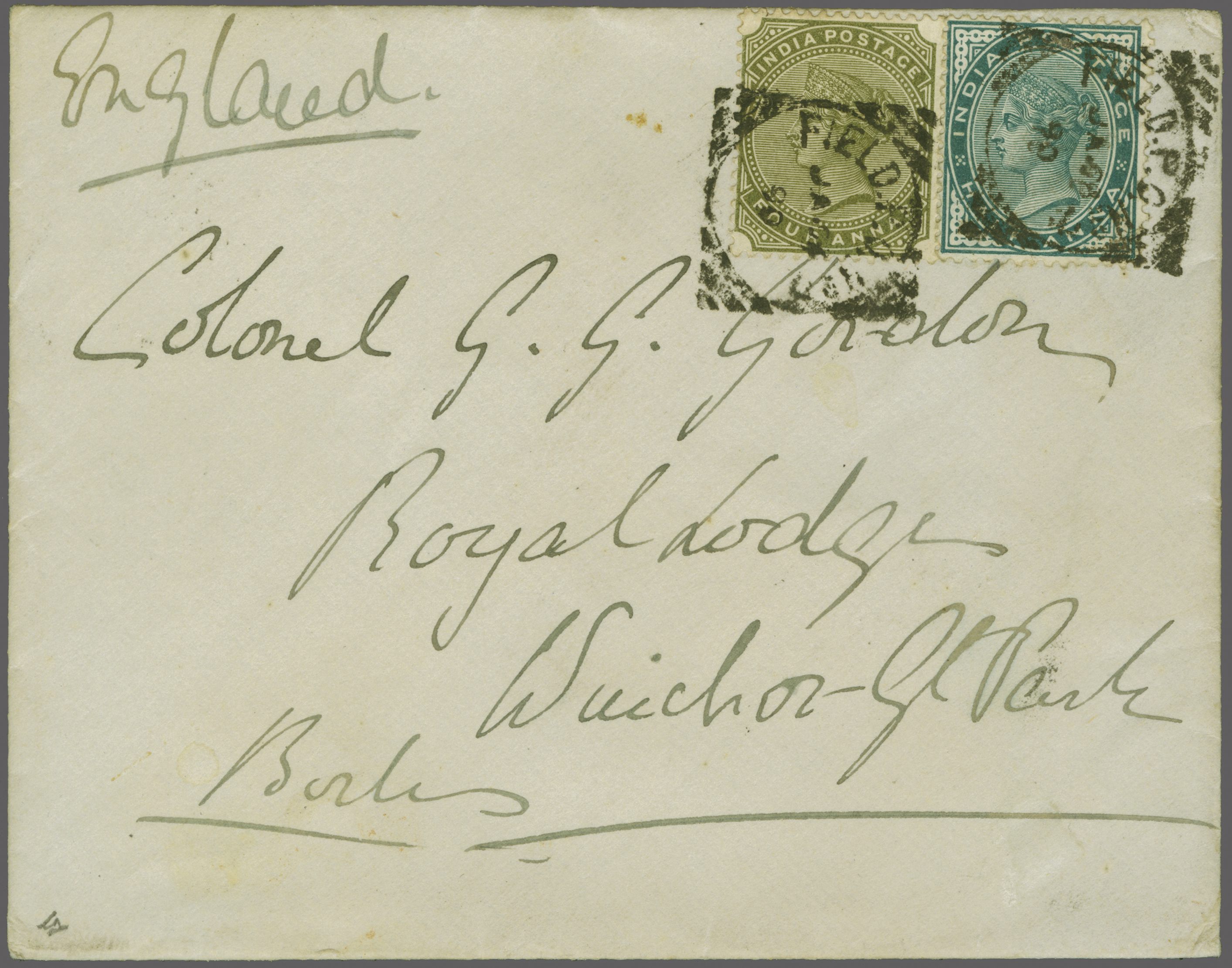 1882/90: ½ a. blue-green and 4 a. olive-green used on 1890 crested envelope of the Royal Horse Artillery to Colonel G.G. Gordon at Royal Lodge, Windsor Great Park, tied by two strikes of "FIELD P.O. No. 7" squared circle