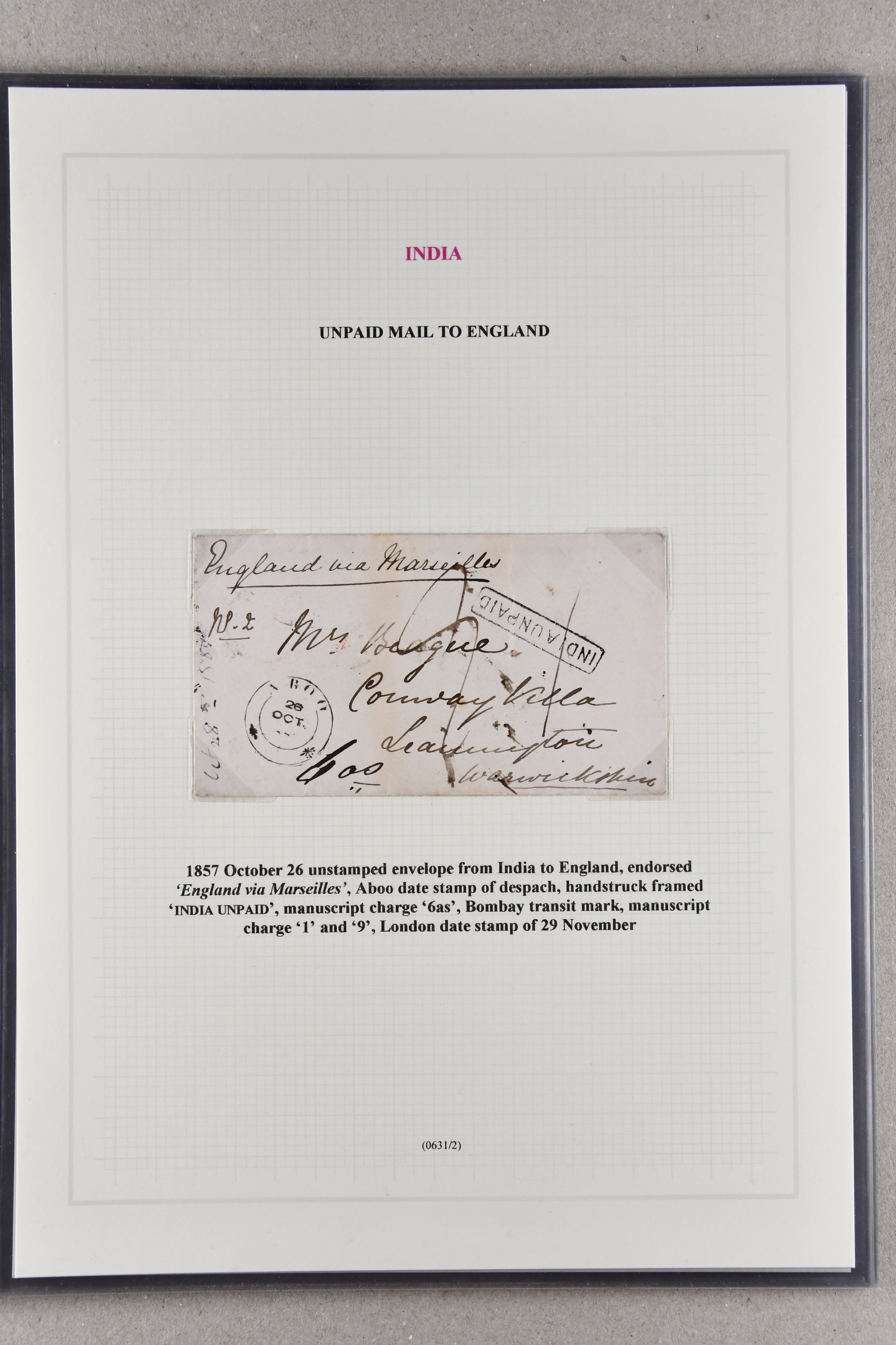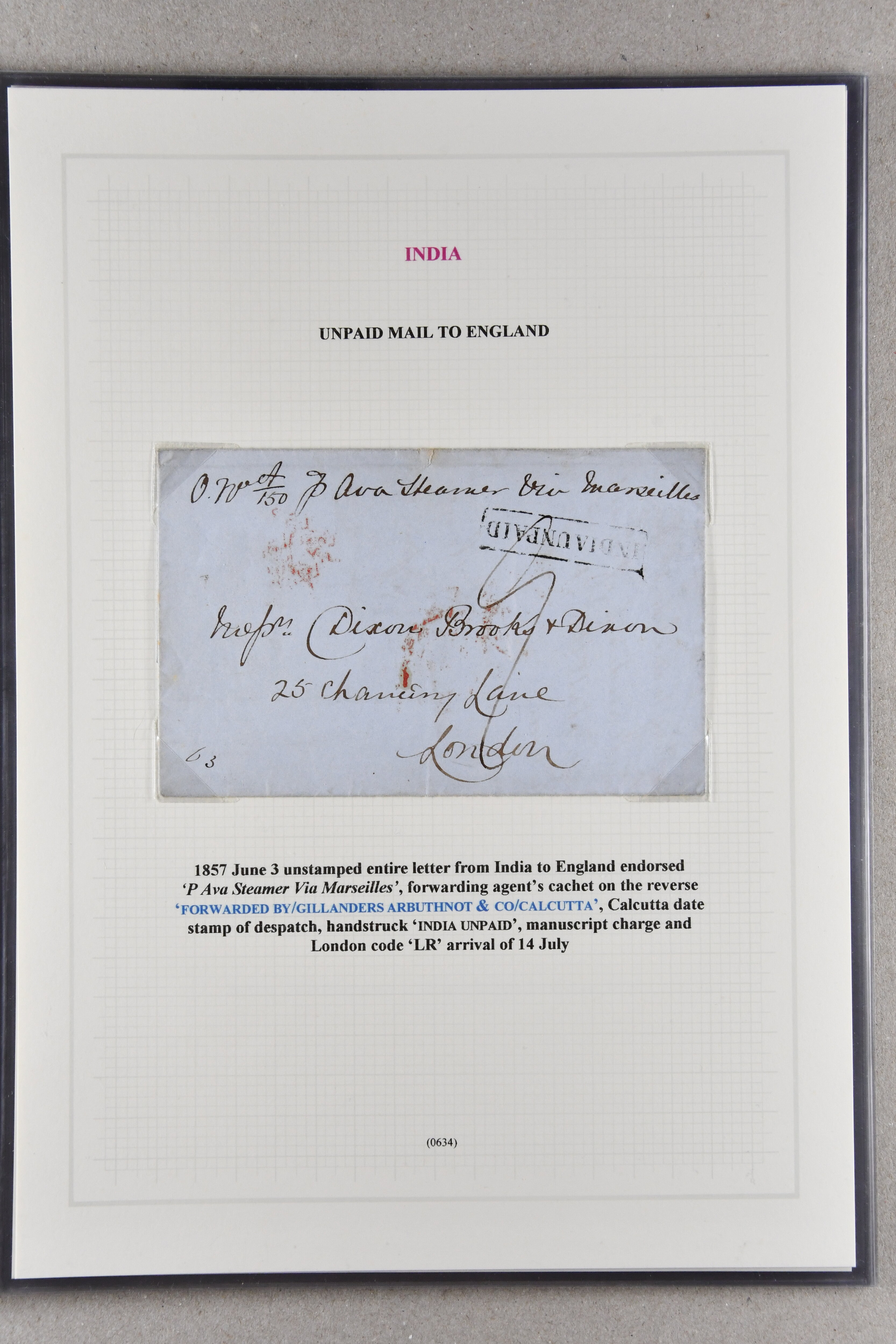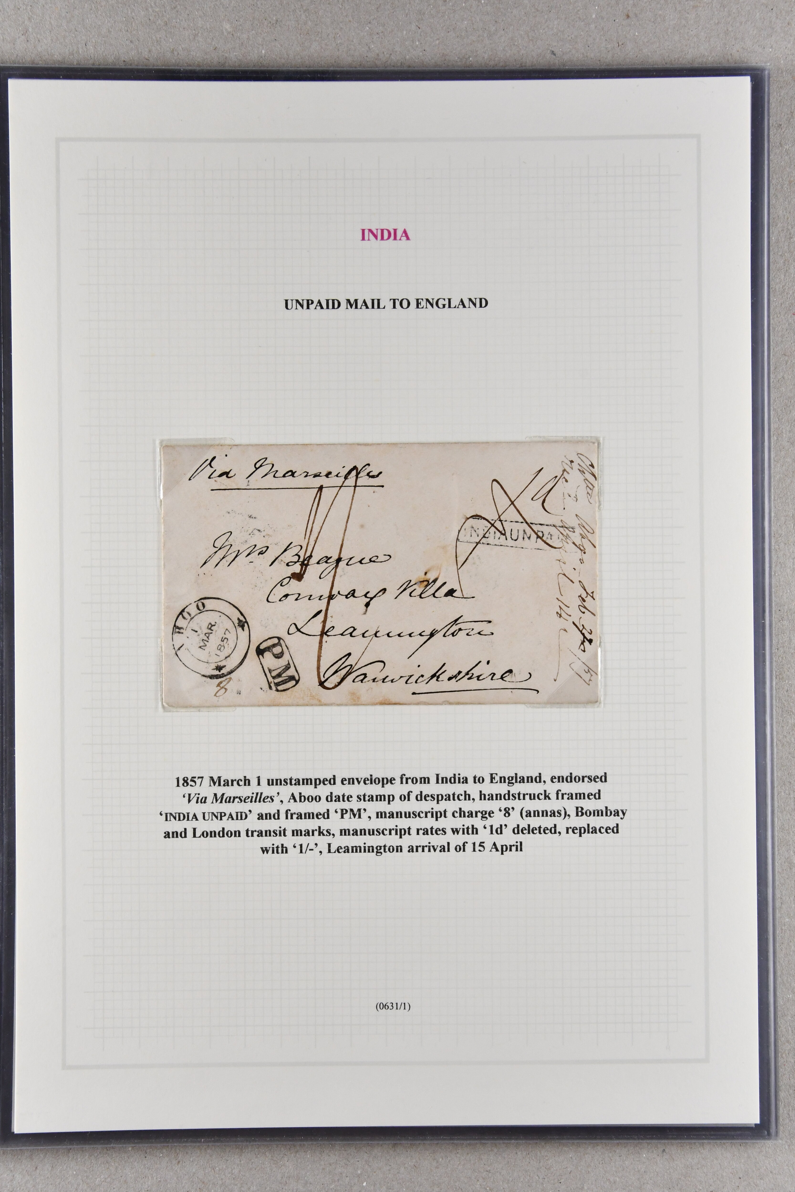 1857/1935: Covers/cards (10) with two fine 1857 covers to England "via Marseilles" each with "ABOO" cds's and "INDIA UNPAID" in black; 1857 entire letter from Calcutta "per Ava Steamer" with framed "INDIA UNPAID",