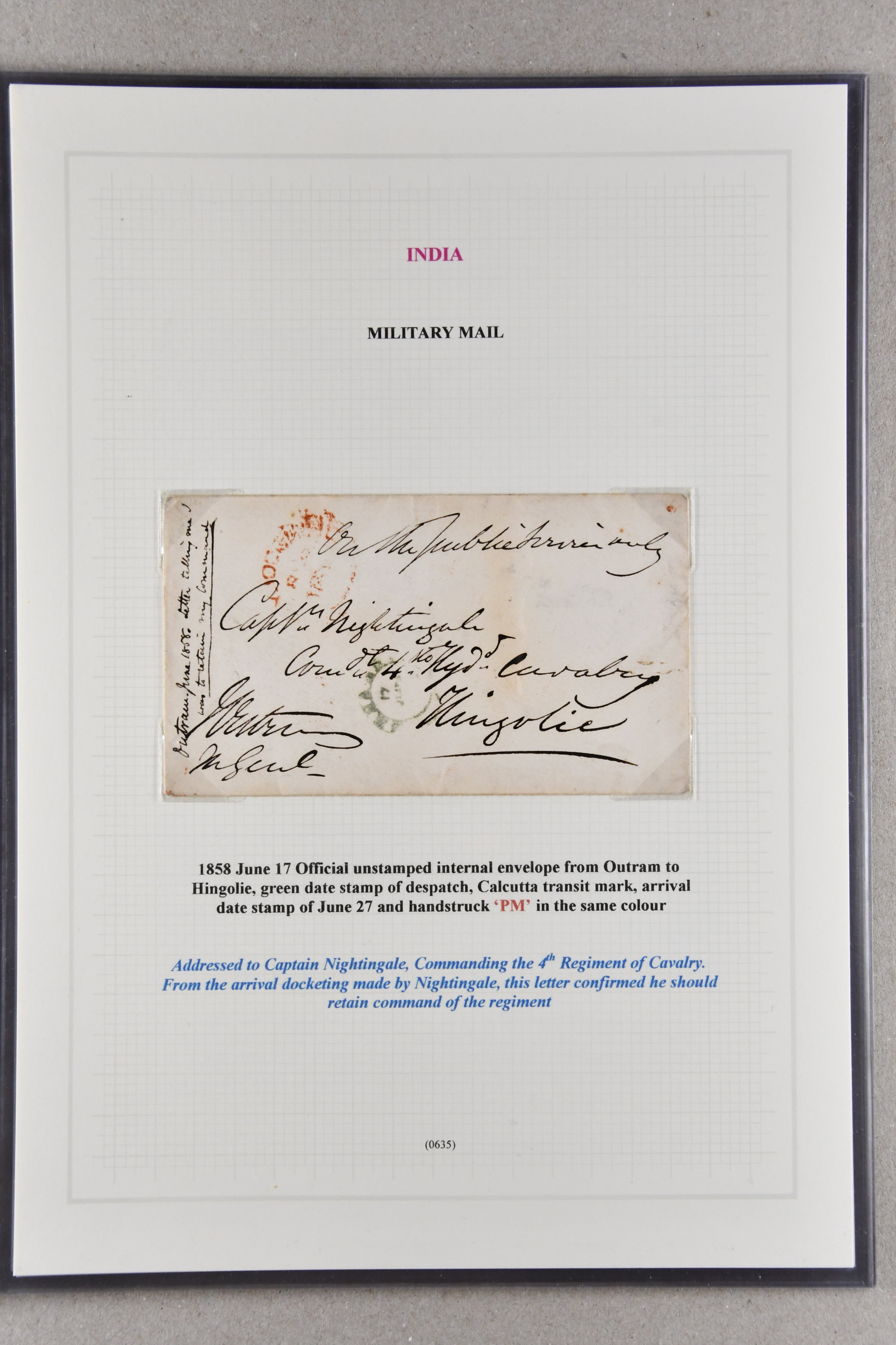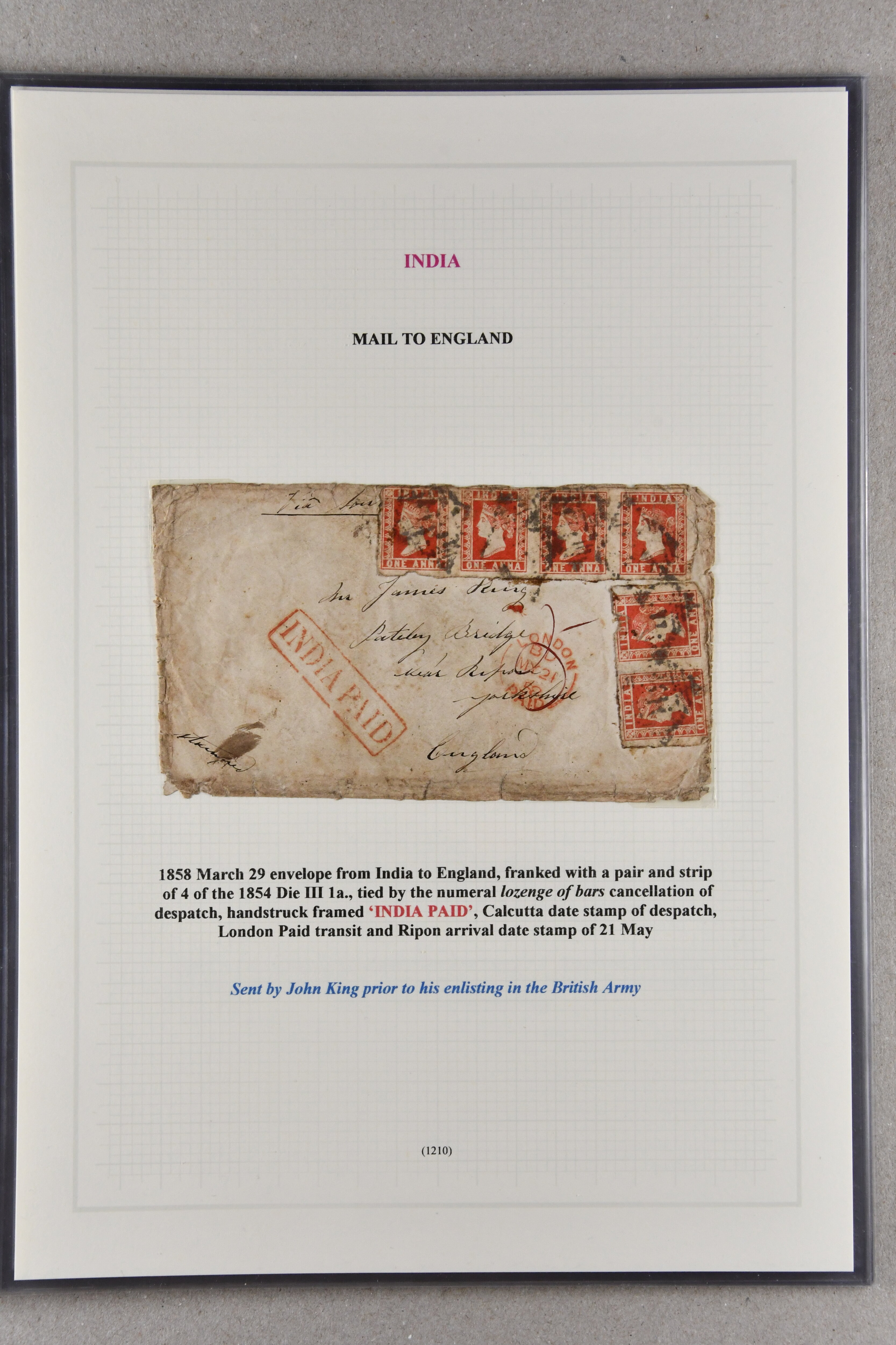 1854 1 a. red, Die III, pair and strip of four used on 1858 battered cover to Yorkshire with framed "INDIA PAID" in red; 1858 cover from Outram to Capt. Nightingale of the 4th Cavalry Regiment at Hingoli, 1865 Official cover from Murree to Bangalore
