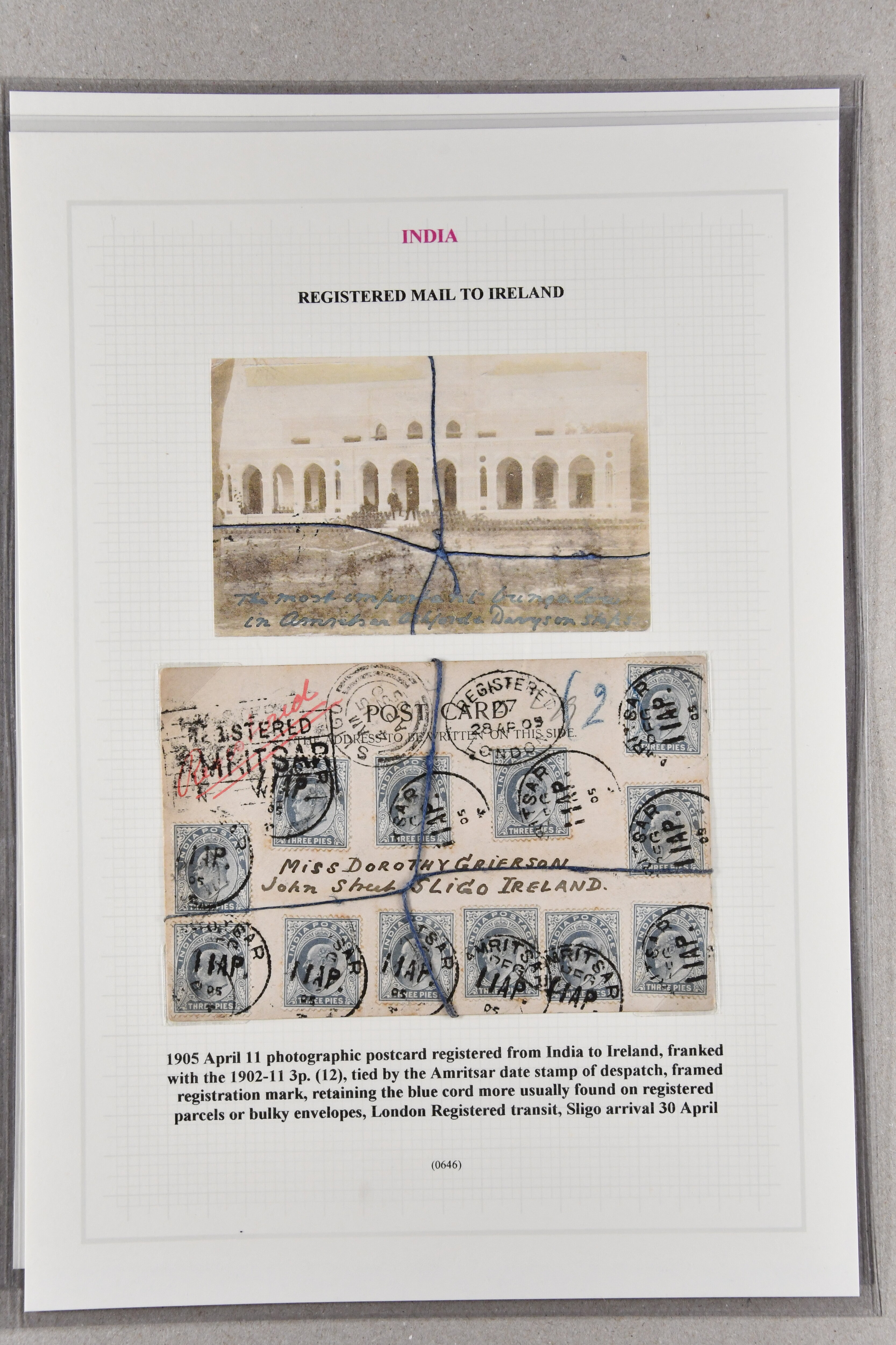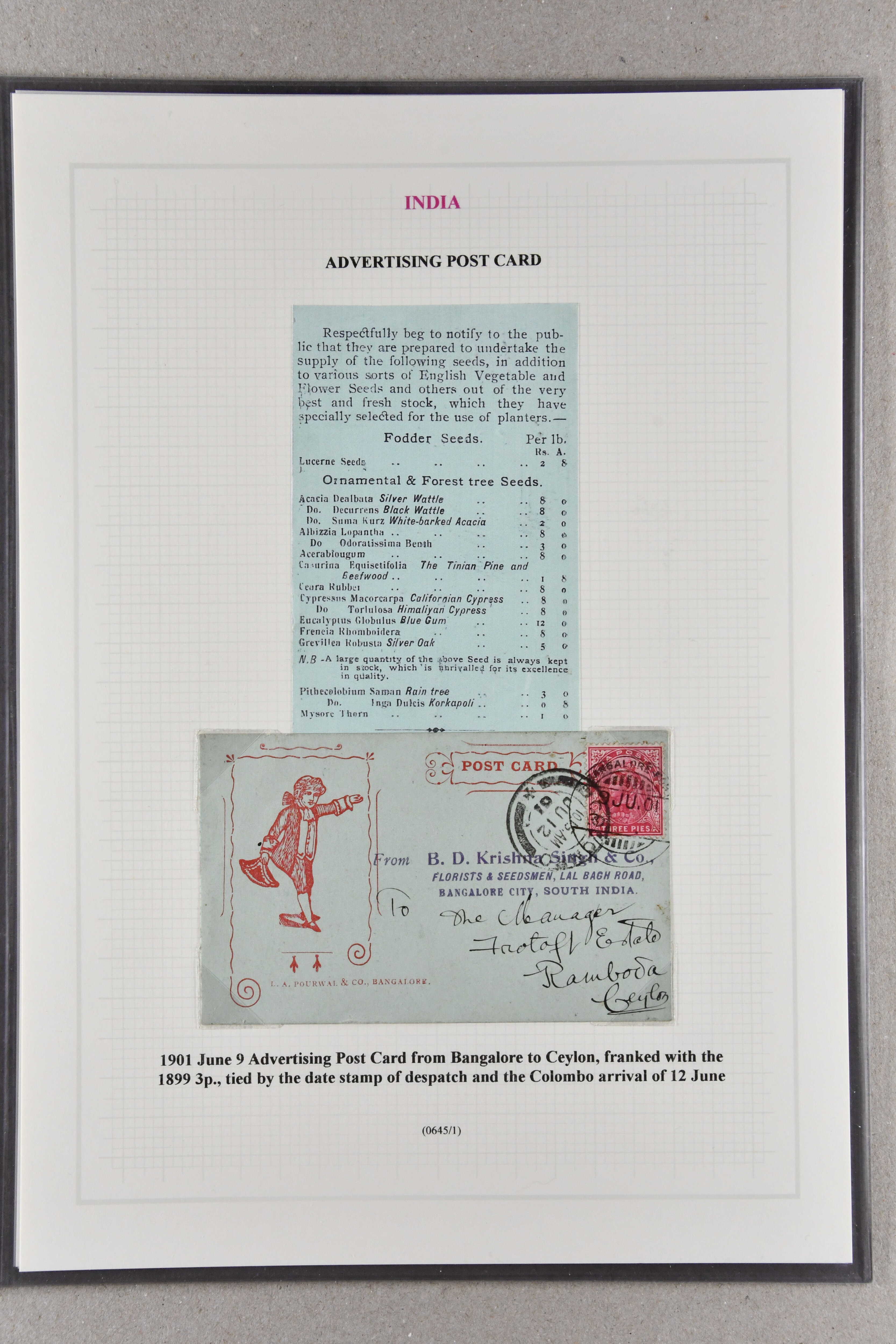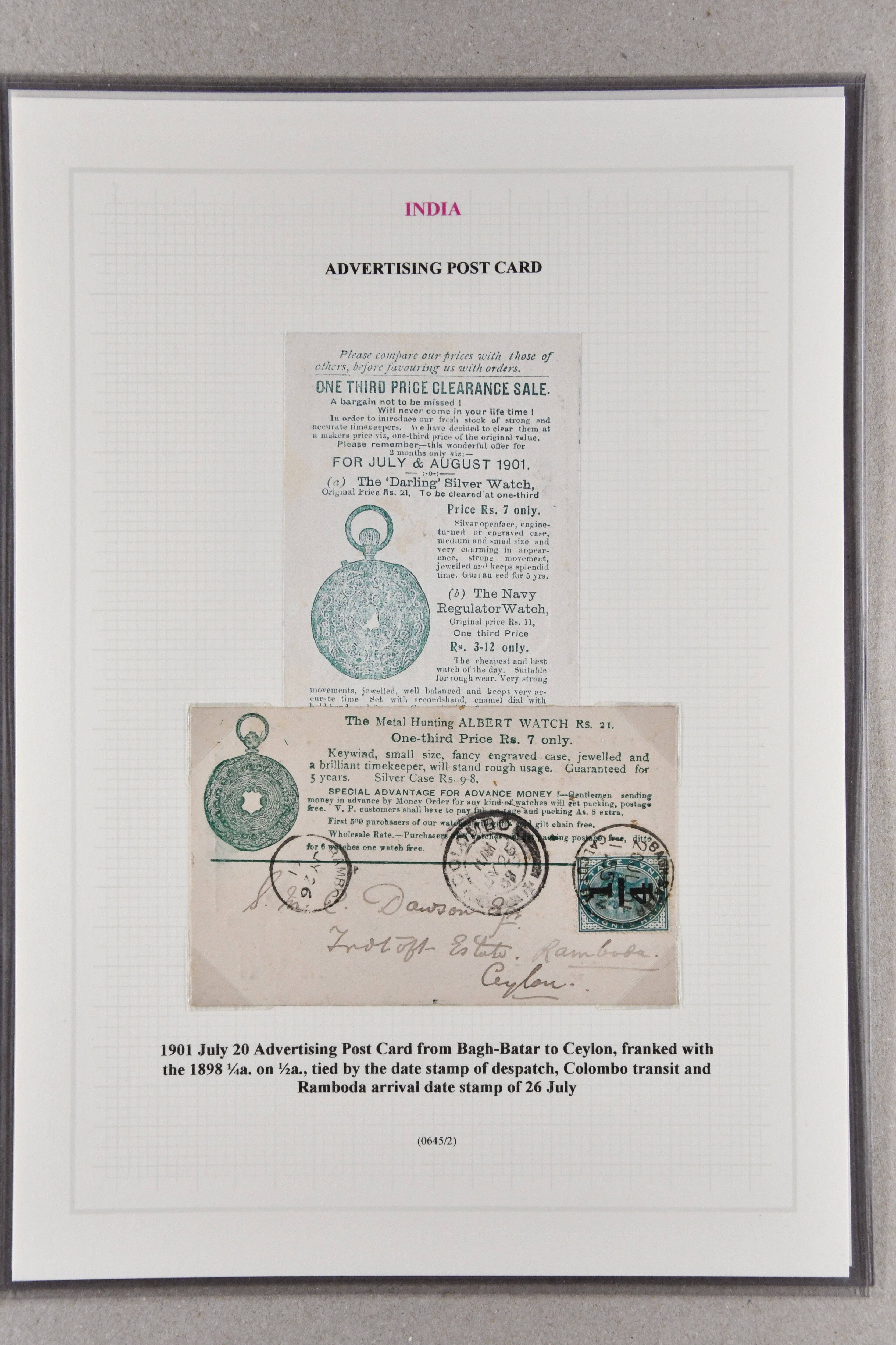 and readdressed with no less than 12 postal markings, 1901 advertising card with 3 p. carmine, Watch advertising card with ¼ a. on ½ a. used to Ceylon, 1909 registered & stringed postcard from Amritsar to Sligo, Ireland franked 1902 3 p. grey