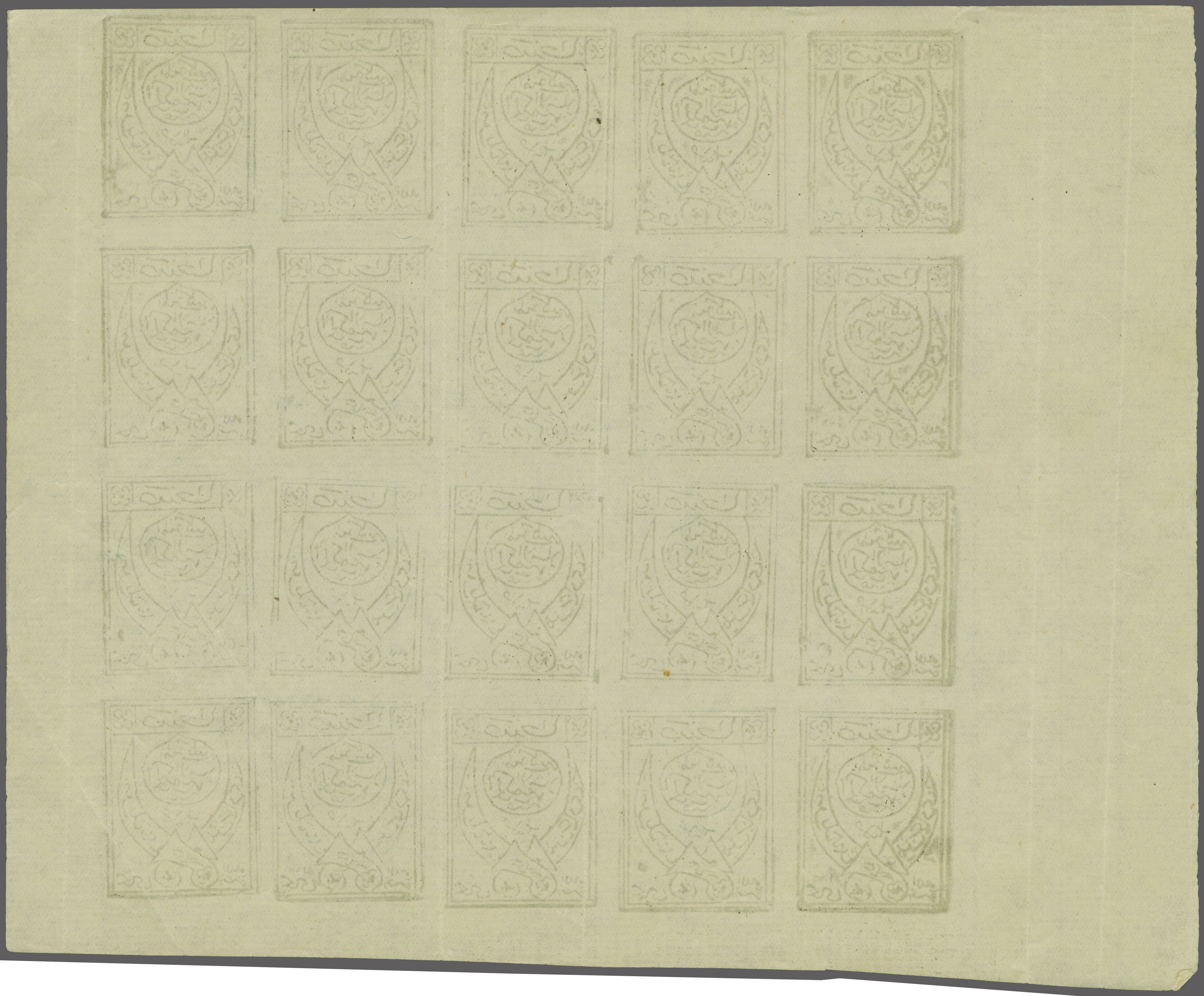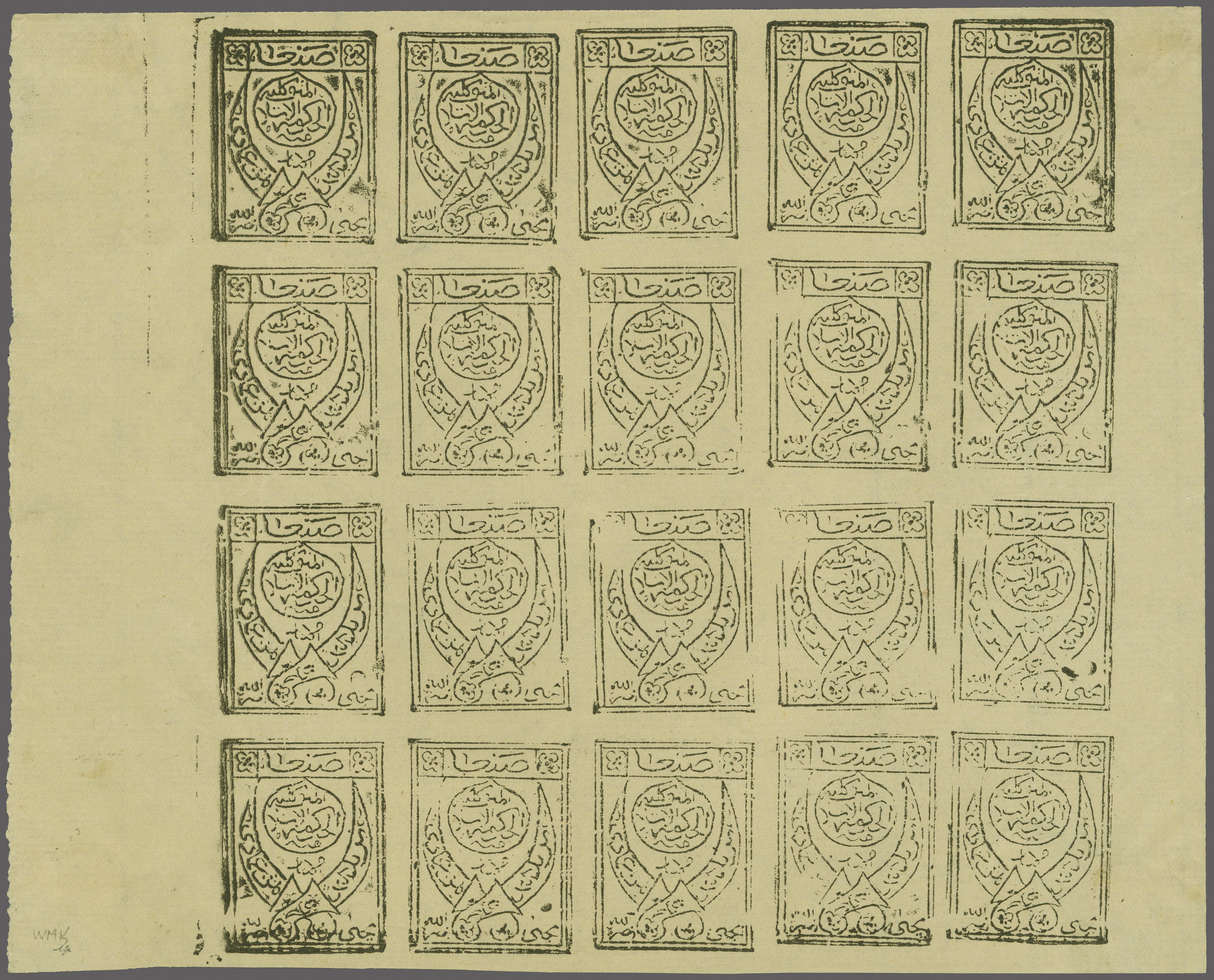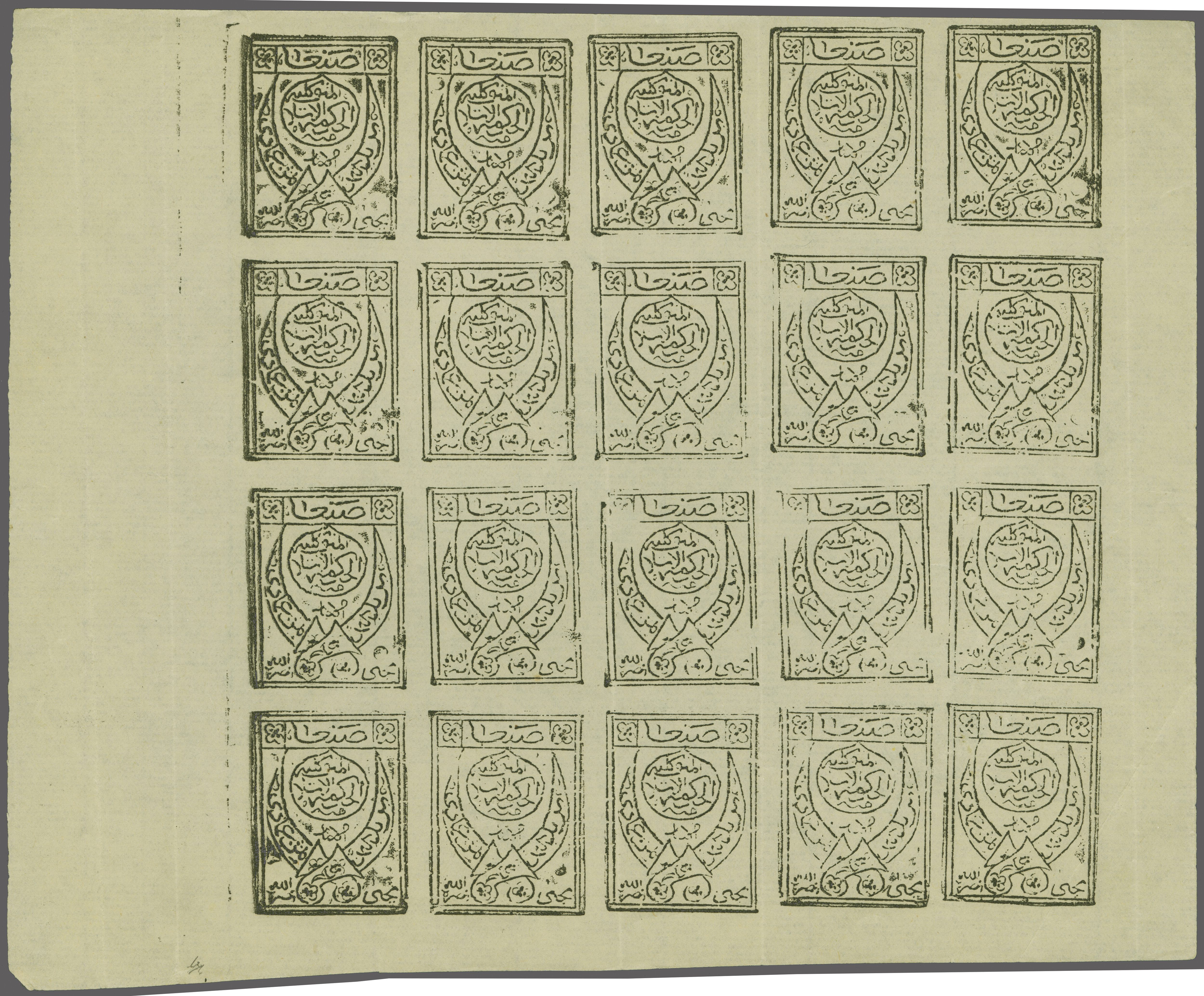 1110 image1926: Inland Postage, 5 b. black on white, imperforate on laid paper, a used reconstruction of the sheet of 20 subjects (5 x 4), all fine to very fine examples, all cancelled with circular negative seal handstamps in black, mostly at Sana'a. Scarce and fine Gi = £ 1'800 (Image 1)