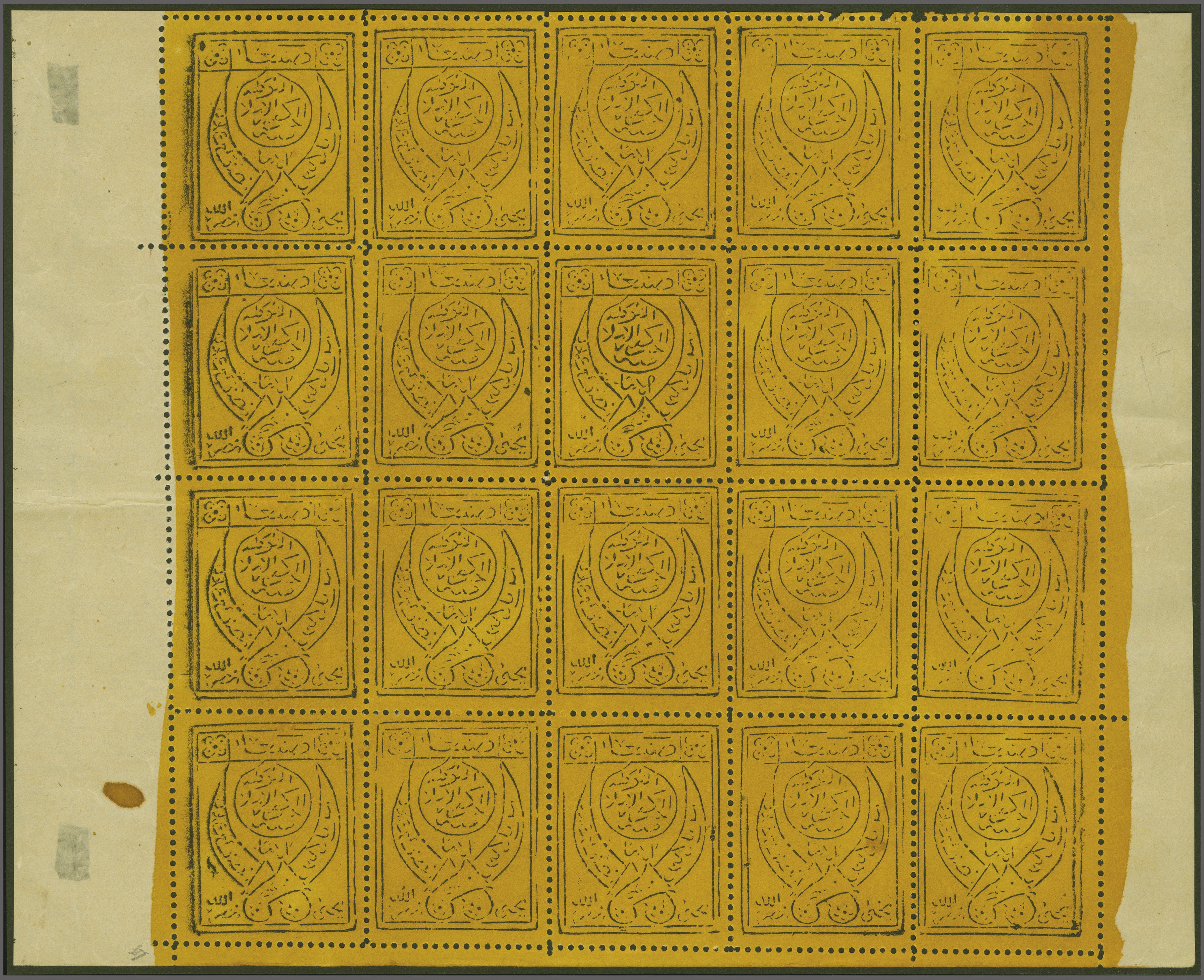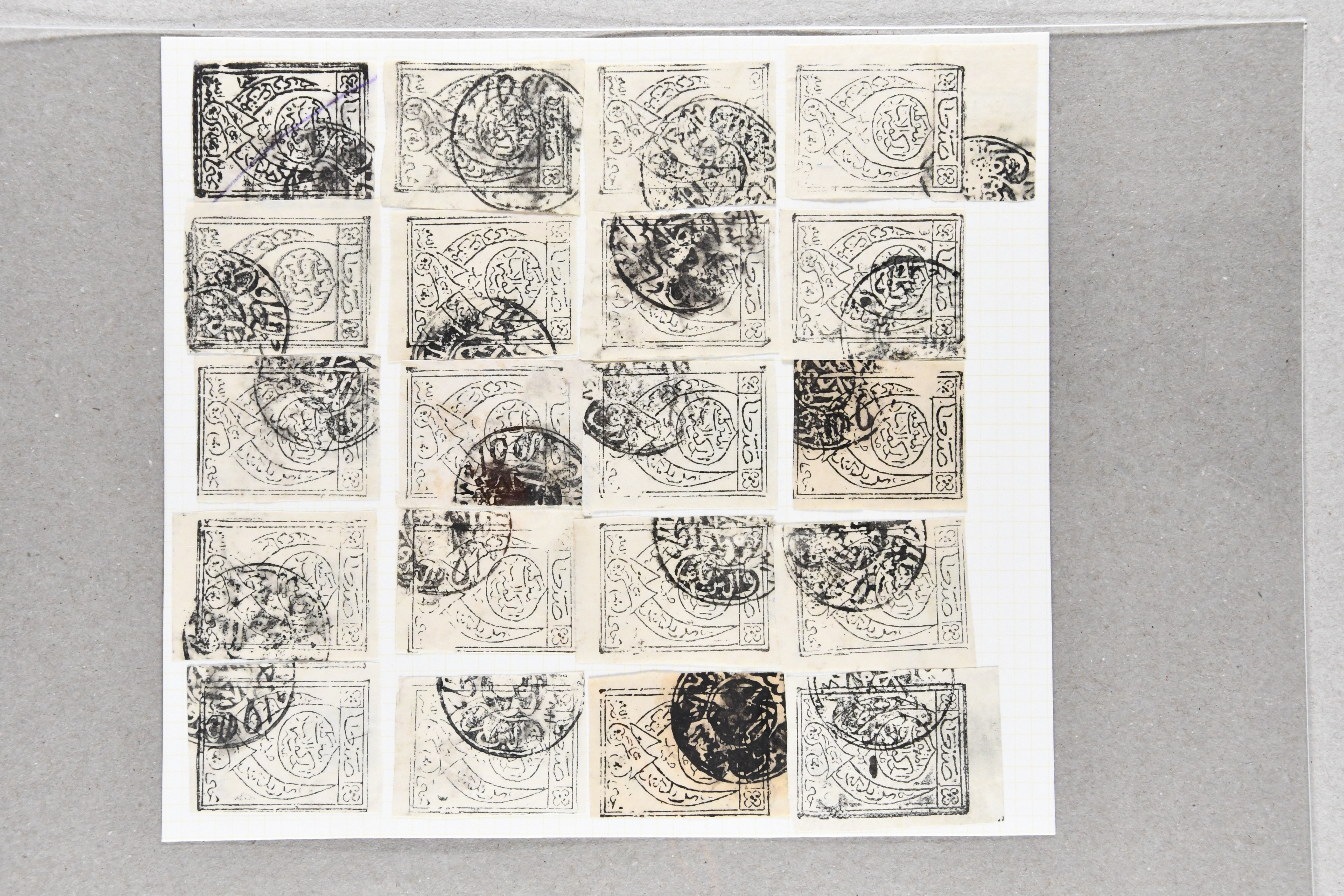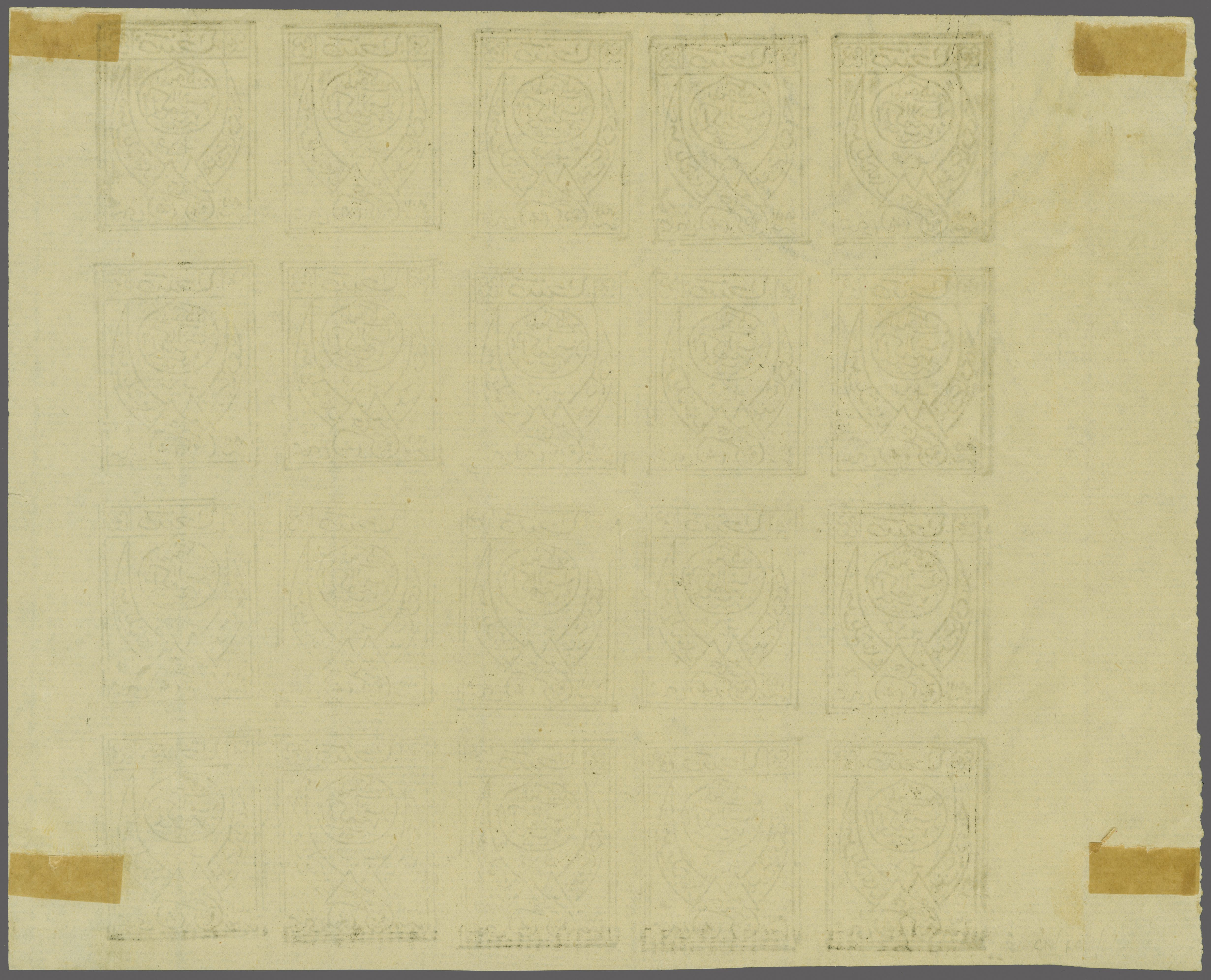1110 image1926: Inland Postage, 5 b. black on white, imperforate on laid paper, a used reconstruction of the sheet of 20 subjects (5 x 4), all fine to very fine examples, all cancelled with circular negative seal handstamps in black, mostly at Sana'a. Scarce and fine Gi = £ 1'800 (Image 1)