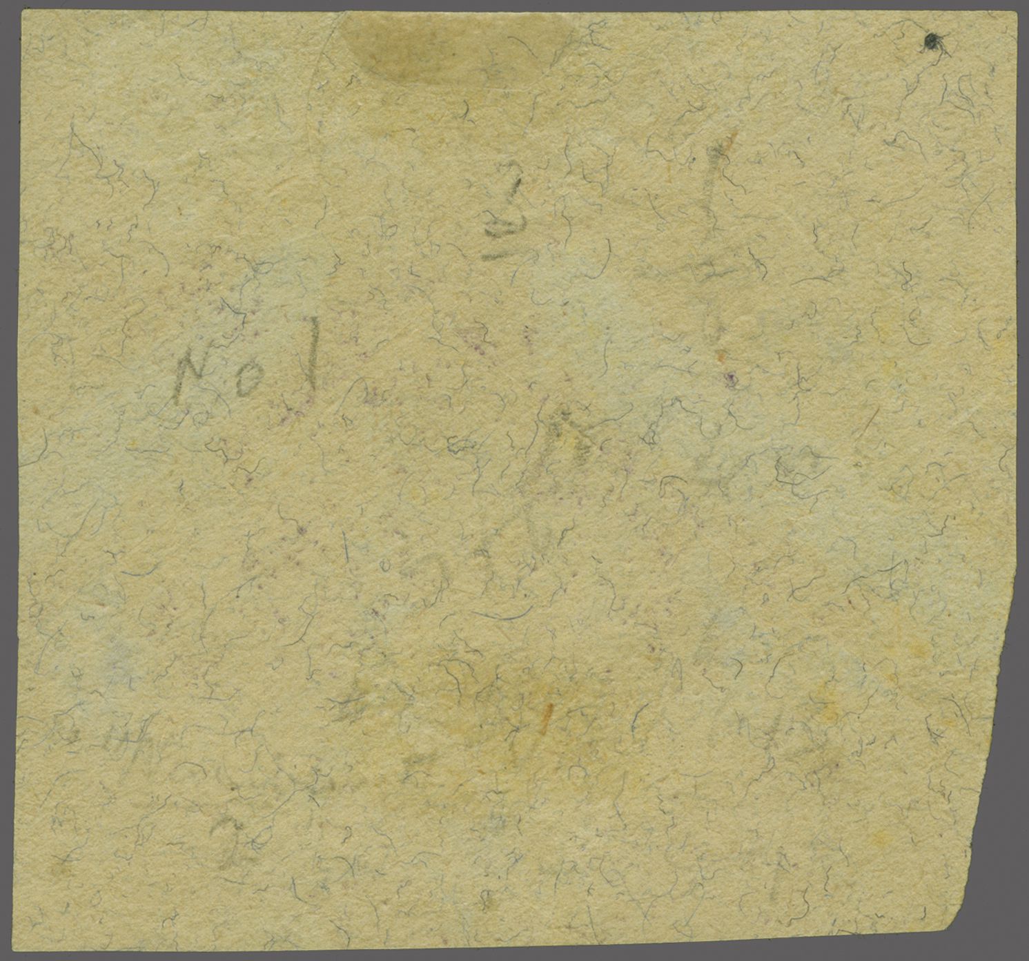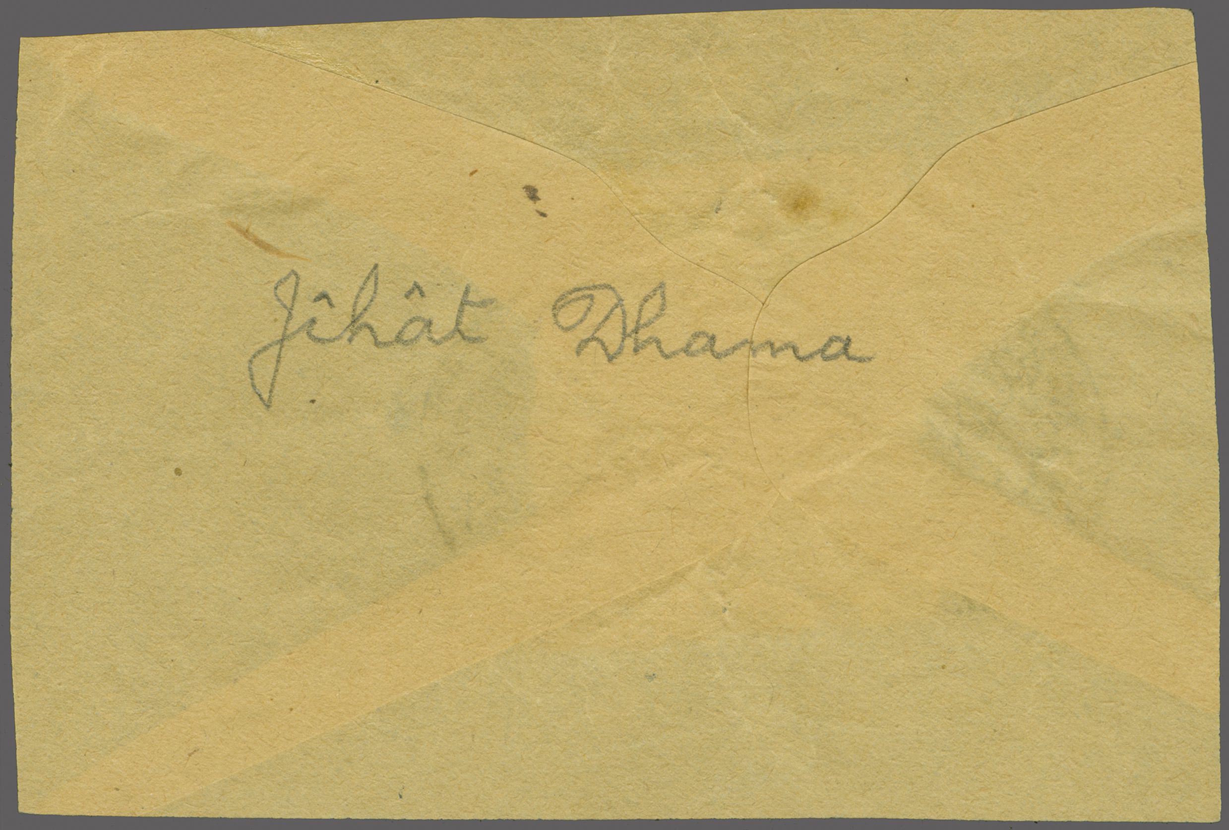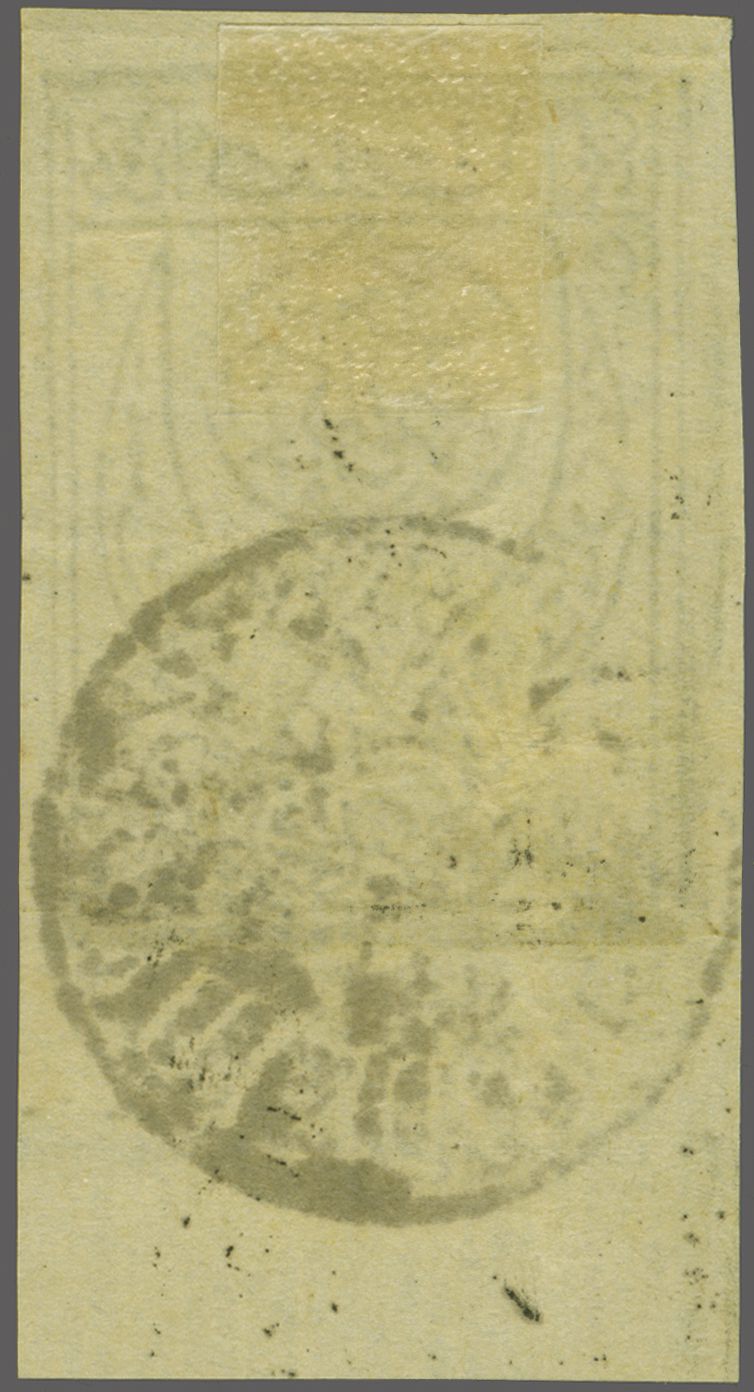 1096 piece image1926: Inland Postage, 2½ b. black on orange, imperforate on horizontally laid paper, a used example somewhat roughly separated, tied to large piece of cover by two strikes of circular "JIHT DHAMAR" handstamps in black. Rare thus (Image 1) (Image 2)