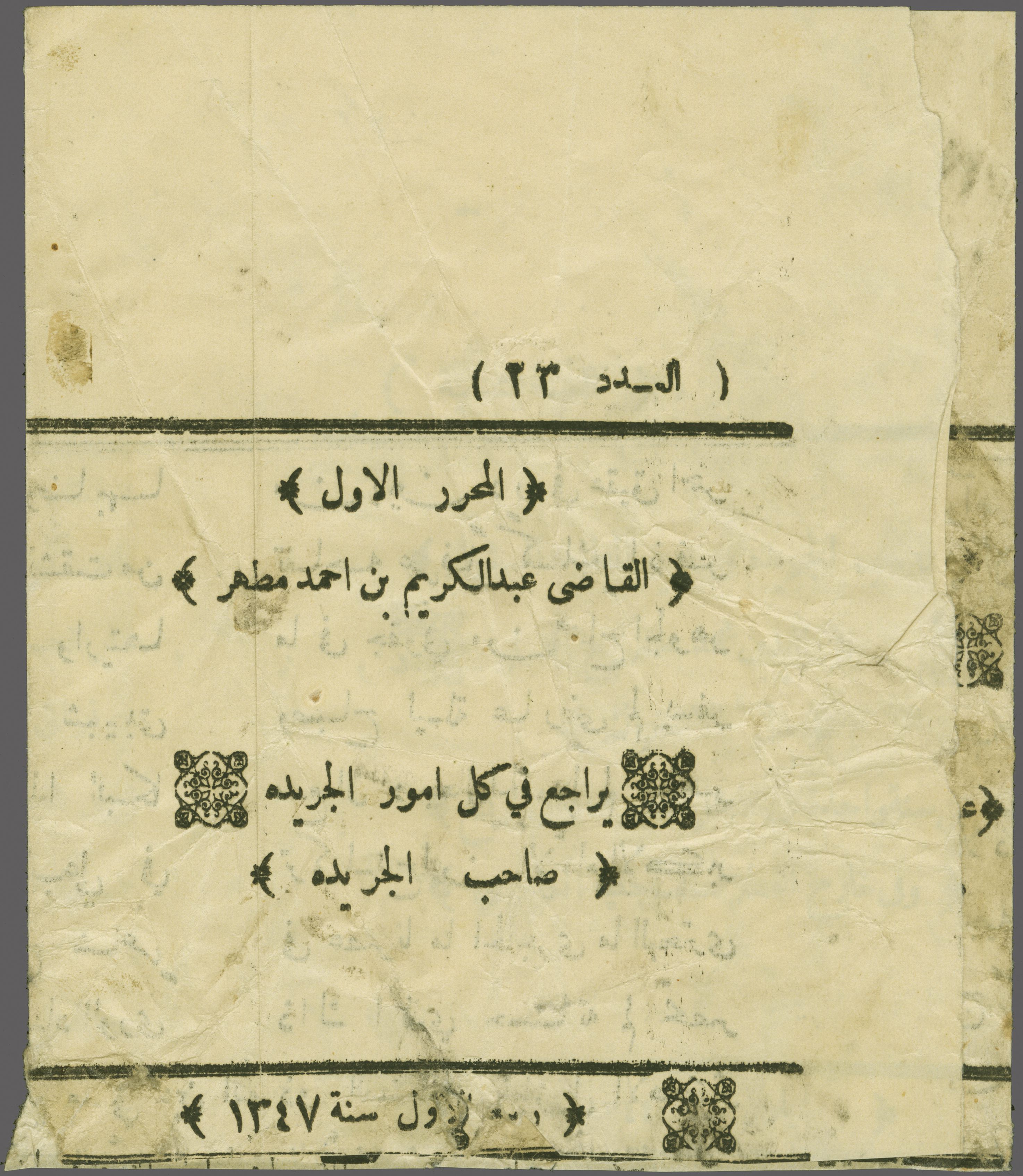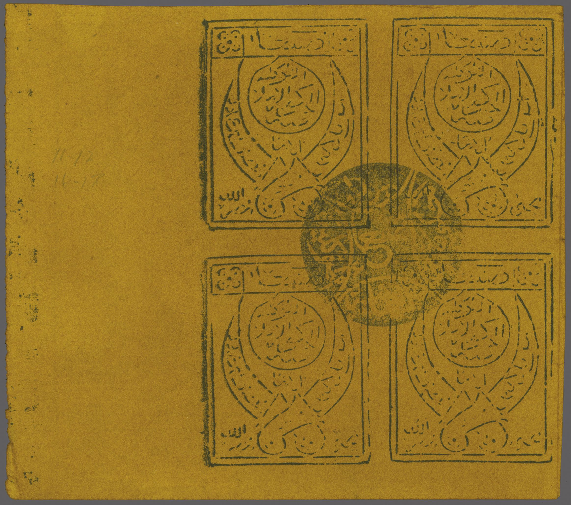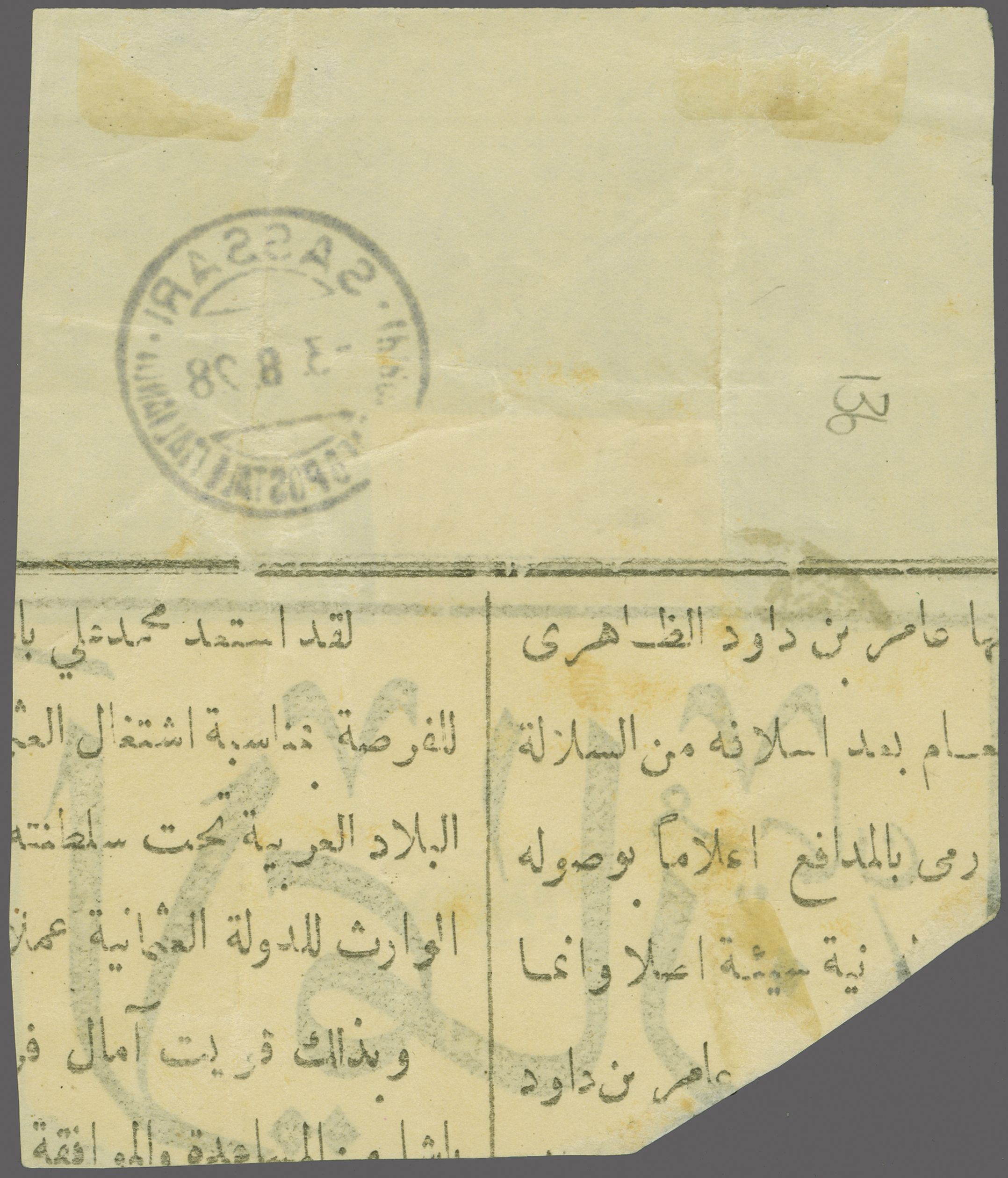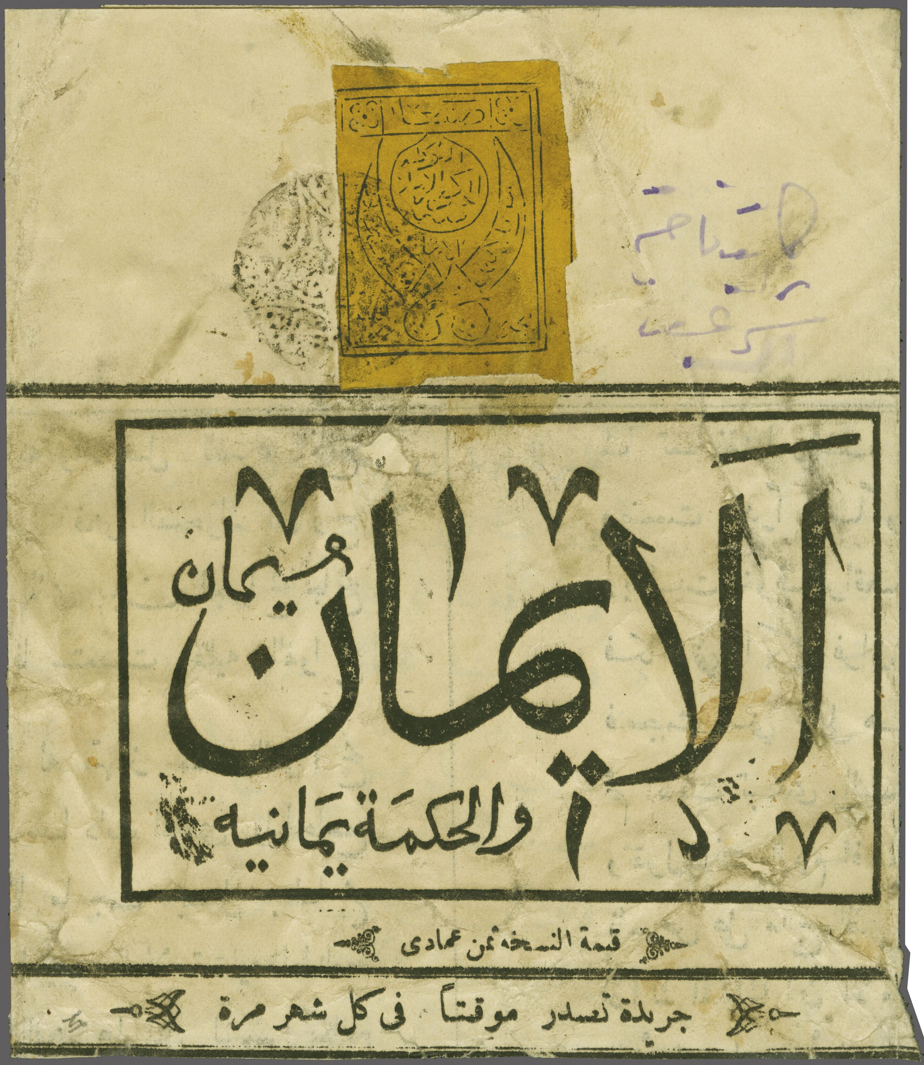 1099 cover image1926: Inland Postage, 2½ b. black on orange, imperforate on horizontally laid paper, a used example with close to large margins all round, used on part of front page of the "AL-IMAN" Newspaper, tied by circular "SANA'A" negative seal handstamp (Type 1) in black. Somewhat soiled but very rare. It is this describer's theory that the 2½ b. value was issued in orange for just this purpose - it is more often (albeit still rarely) found on Newspaper frankings - and the 2½ b. value printed in orange would have been much easier to see for postal staff when applied to a Newspaper. Provenance: Collection Herry Schaefer, Corinphila sale 123, October 2000, lot 4901 (Image 1) (Image 2)